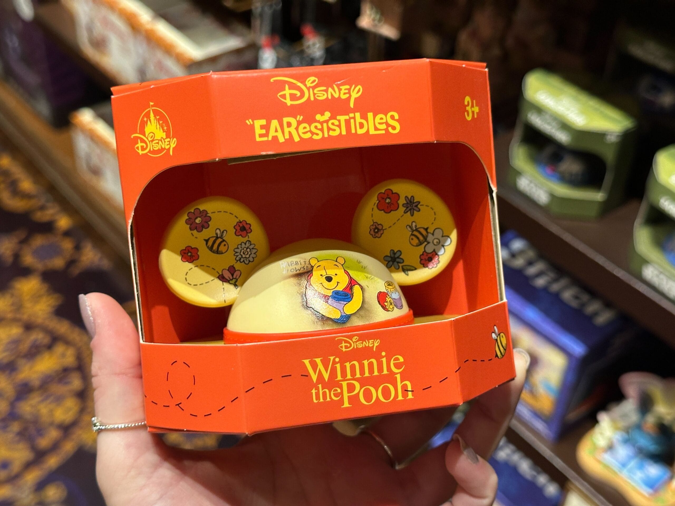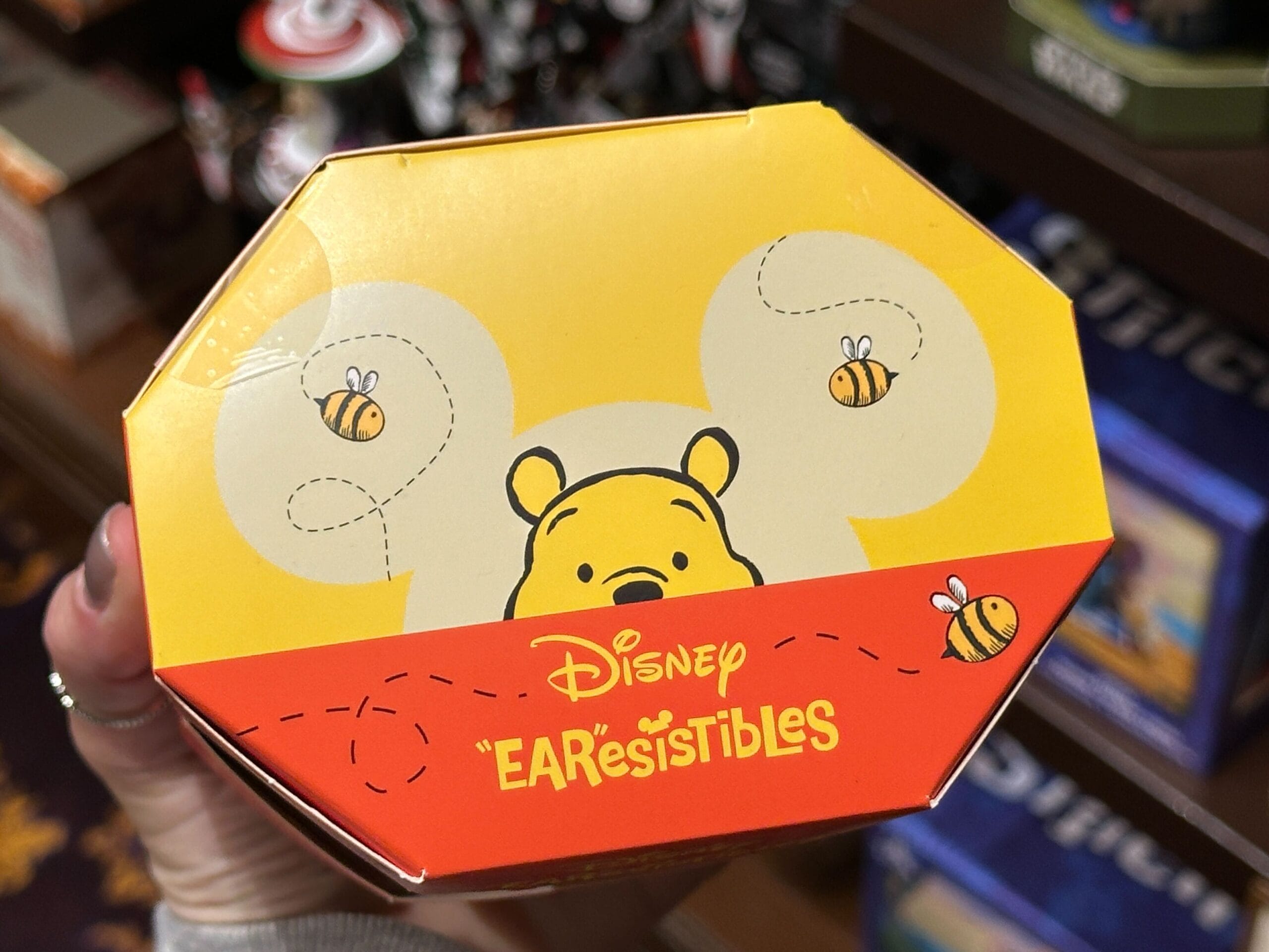 The top front of the box has the Disney EAResistibles logo, while a bee flies around the Winnie the Pooh logo at the bottom front of the box.