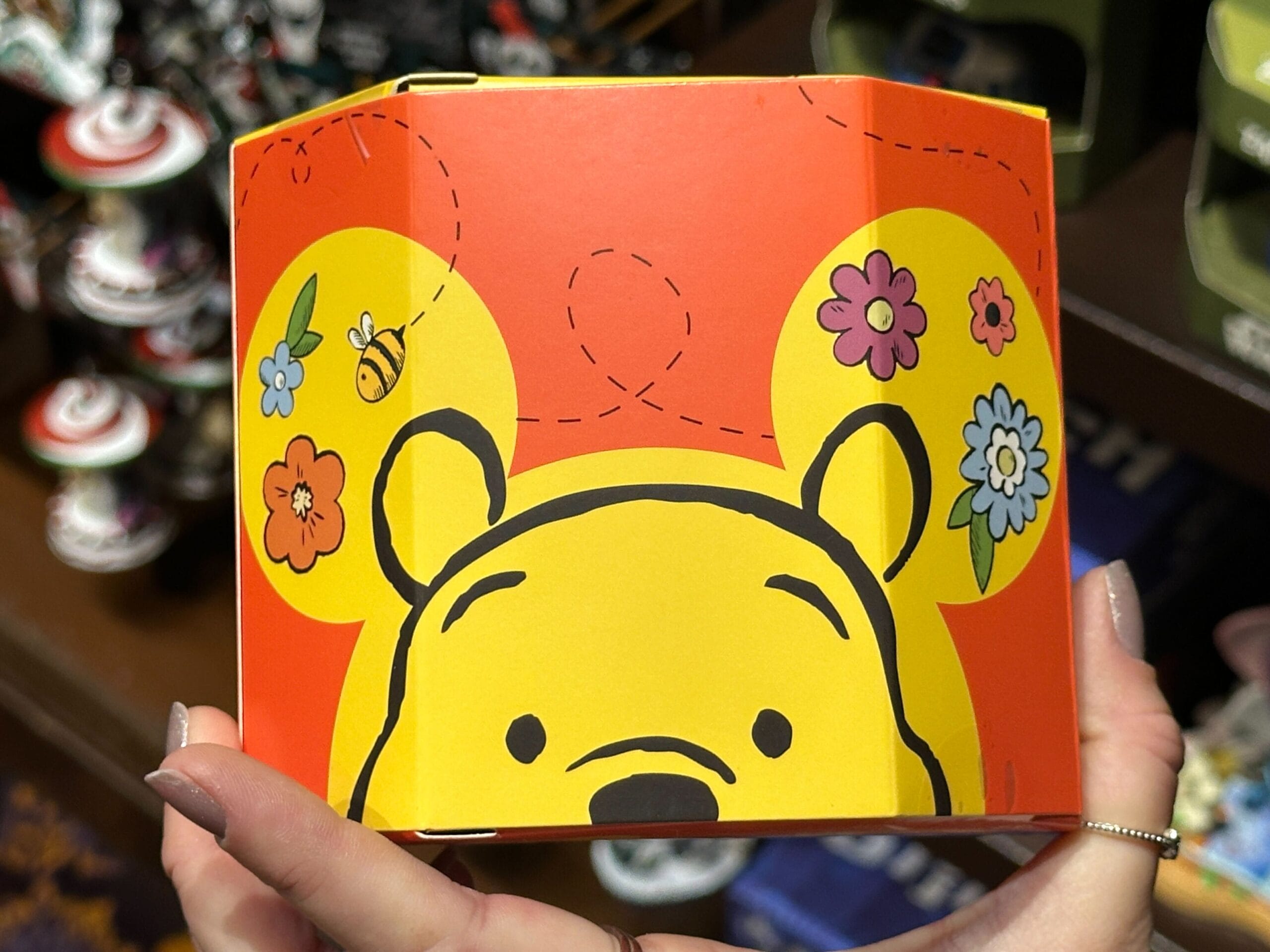 The back of the box continues the Winnie the Pooh artwork from the vinyl collectible. Winnie the Pooh’s face is in the middle and is surrounded by multicolored flowers and a flying bee. The top of the box also shows Winnie the Pooh’s face, flying bees, and the Disney EAResistibles logo.