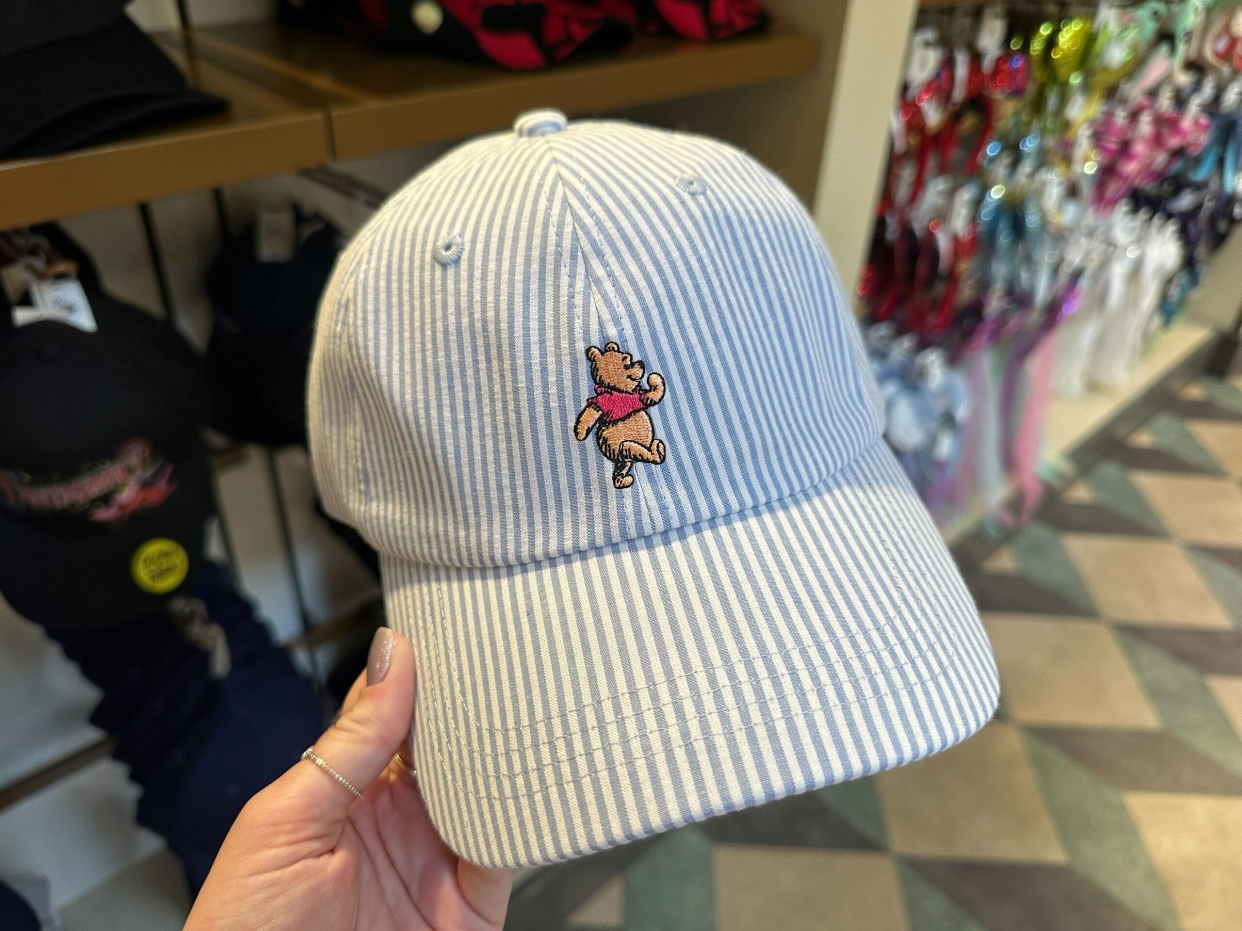 This hat has blue-and-white stripes and has an embroidered Winnie the Pooh on the front.