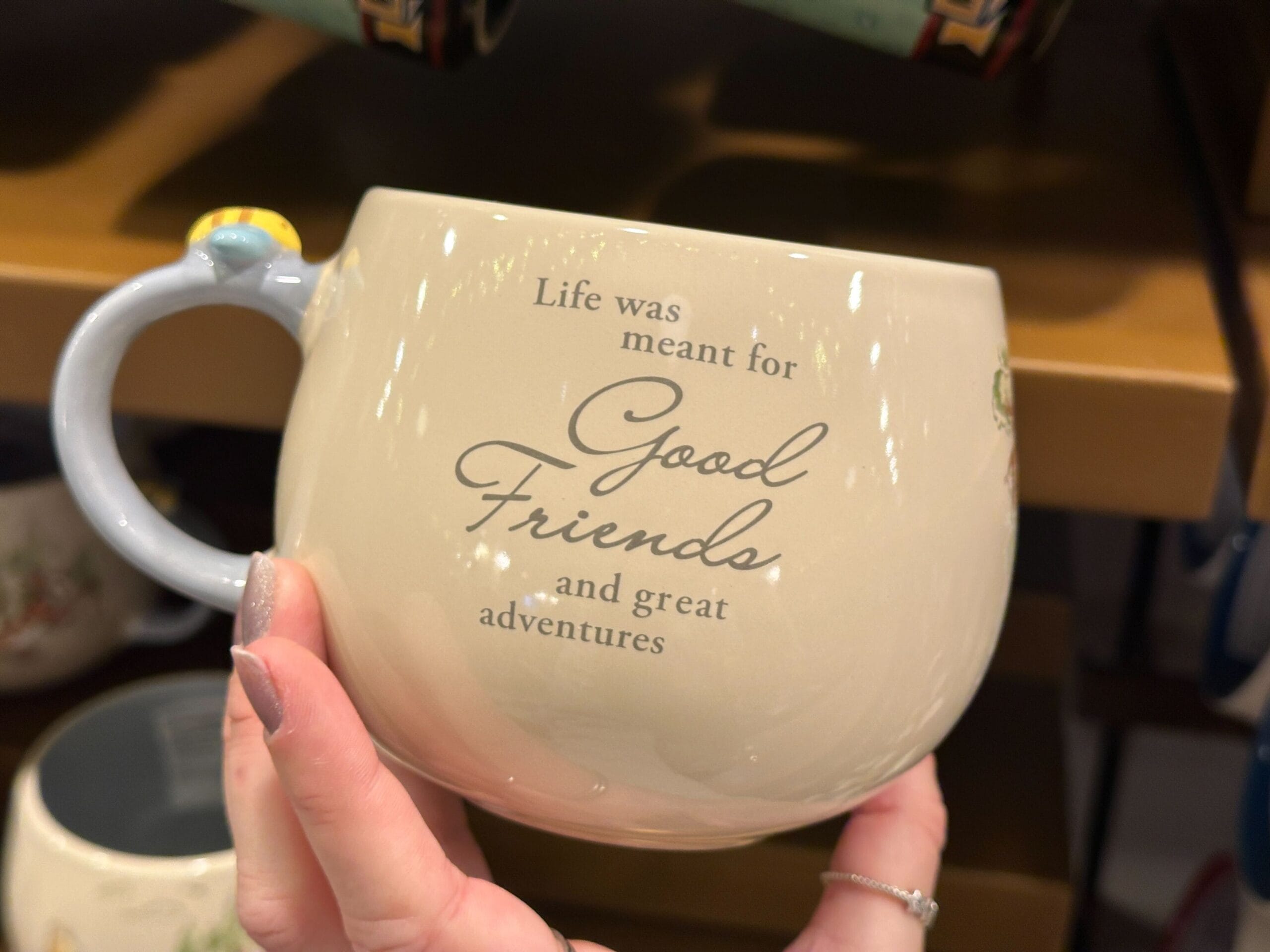 The other side of the mug says, “Life was meant for good friends and great adventures.” The handle and inside of the mug are a pastel blue color. The top of the handle is decorated with a bee.