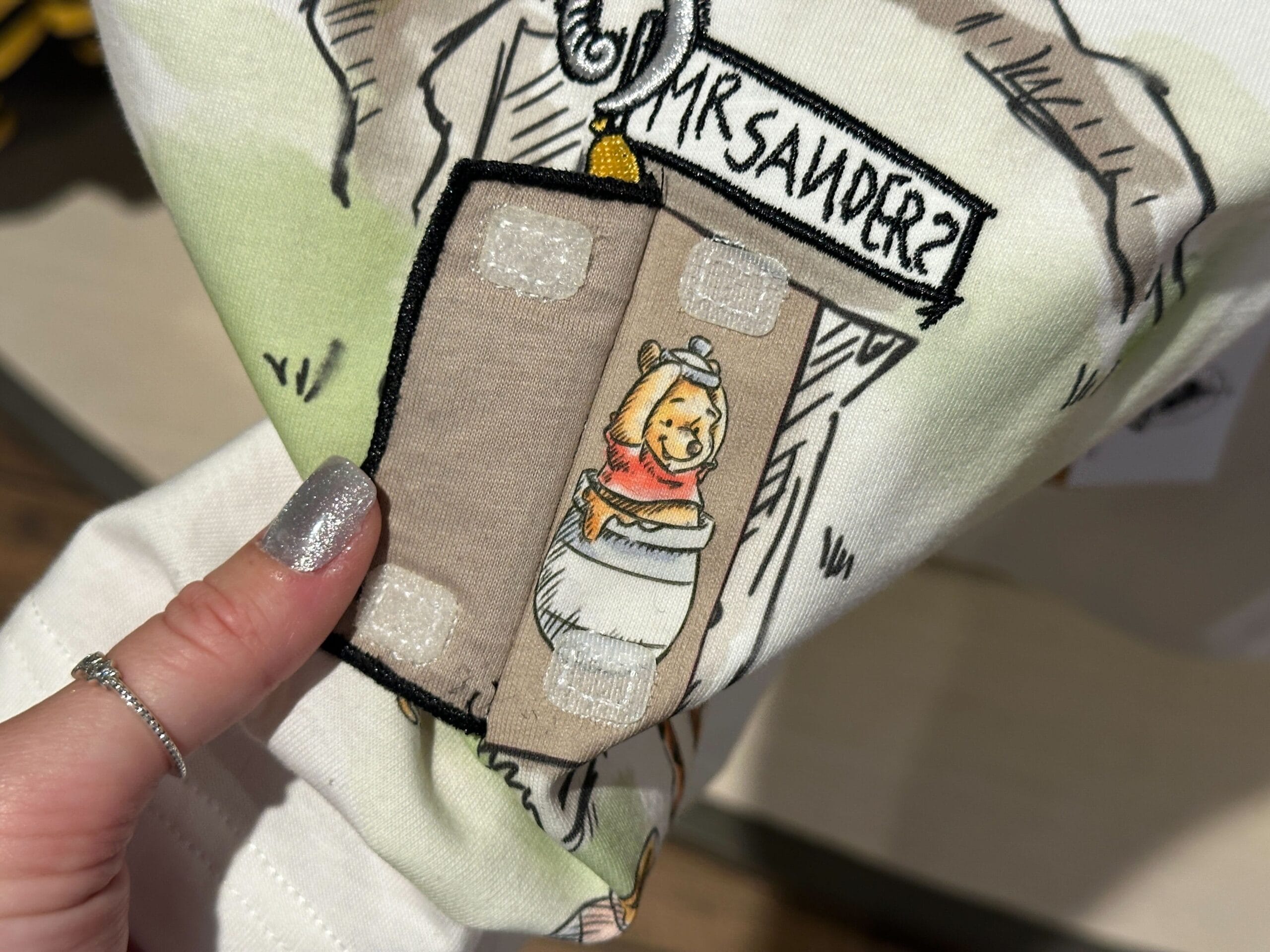Beneath the “Mr. Sanders” sign, the door to Winnie the Pooh’s house is attached to the shirt with Velcro. Opening the door reveals Pooh sitting inside a honey pot.