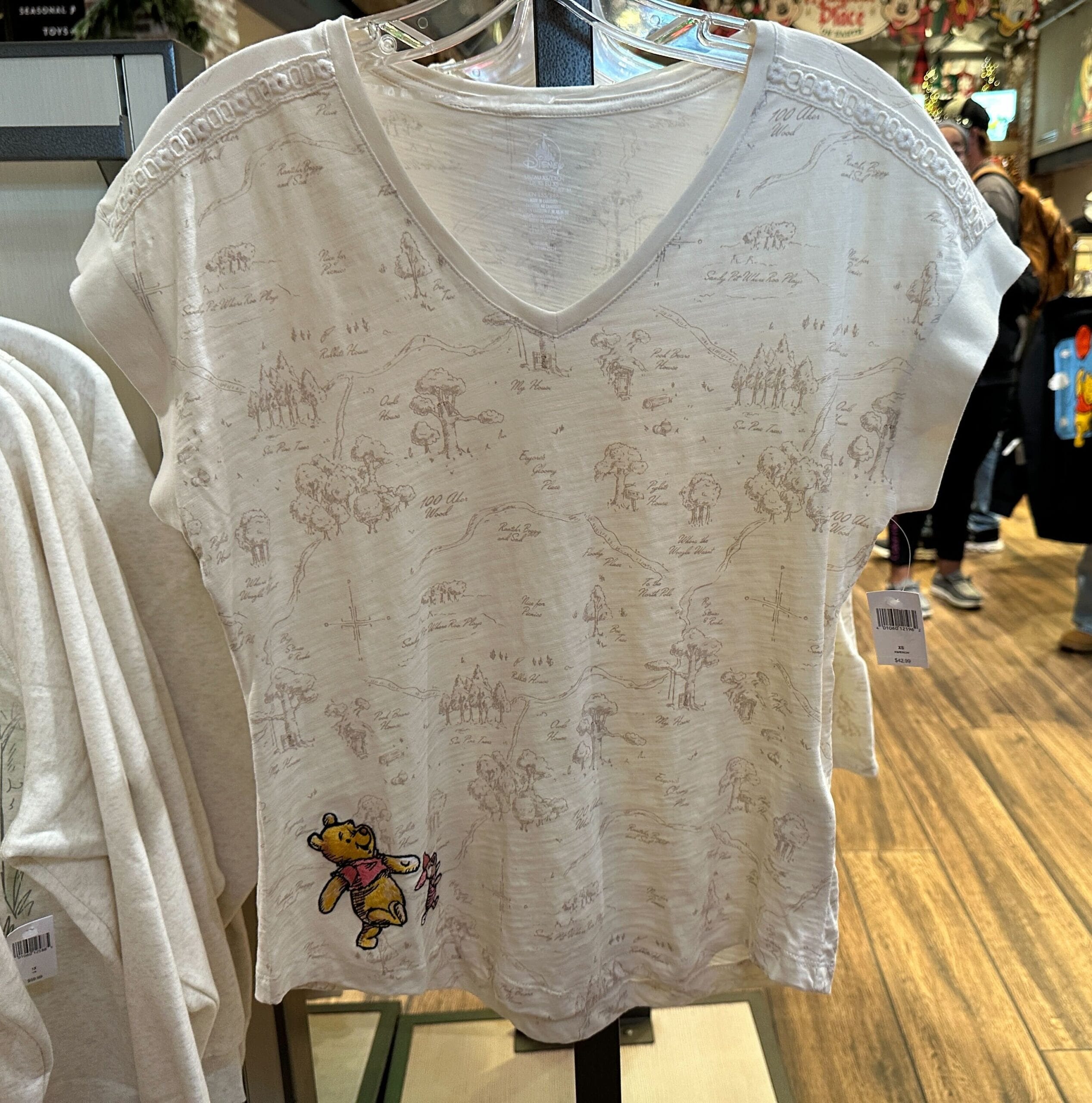 This white shirt for adults has an allover pattern of the map of the Hundred Acre Wood. The shirt has a deep V-neck and decorative embroidery on the shoulder seams.