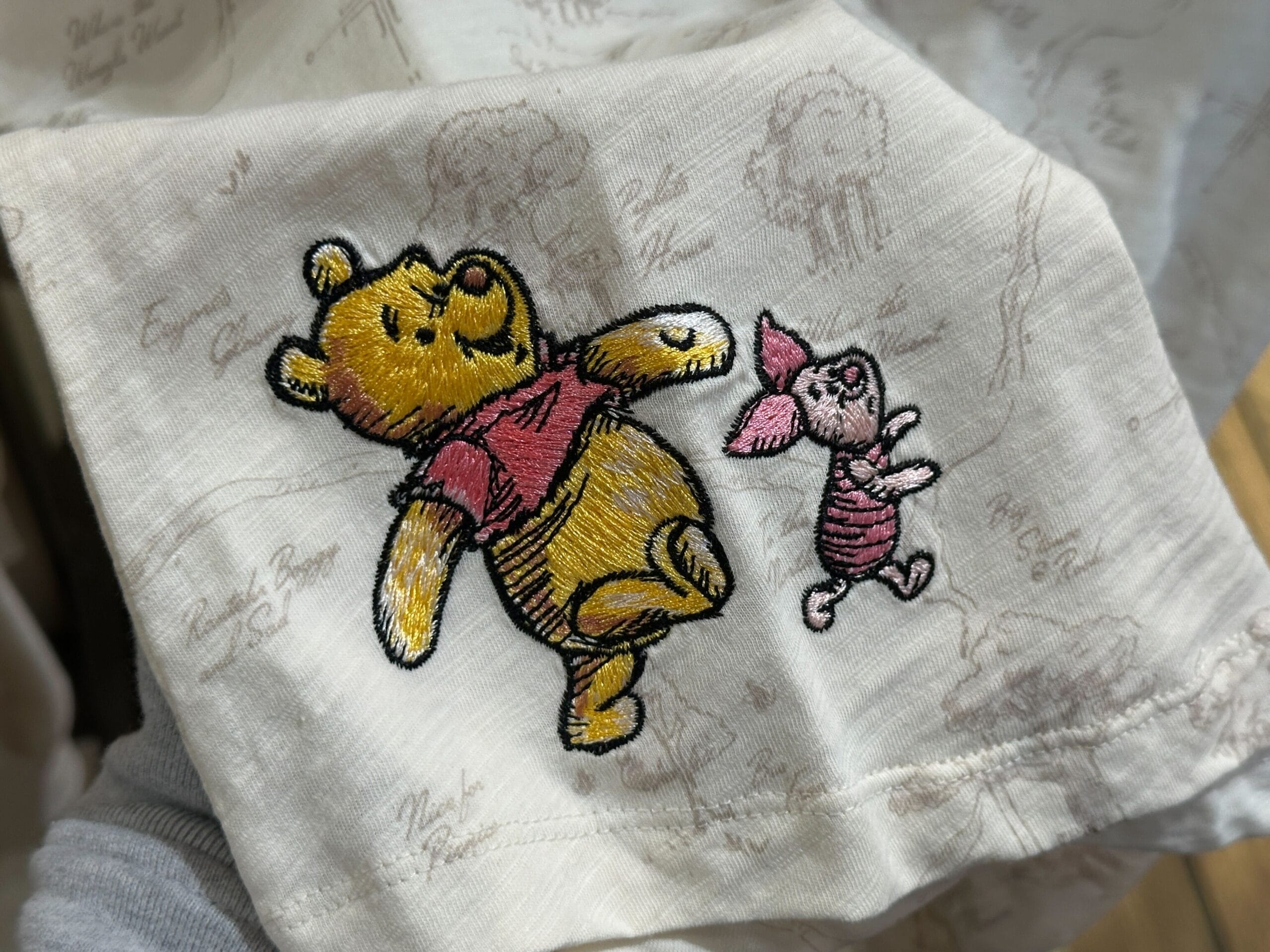 Winnie the Pooh and Piglet are embroidered at the bottom right corner of the shirt.