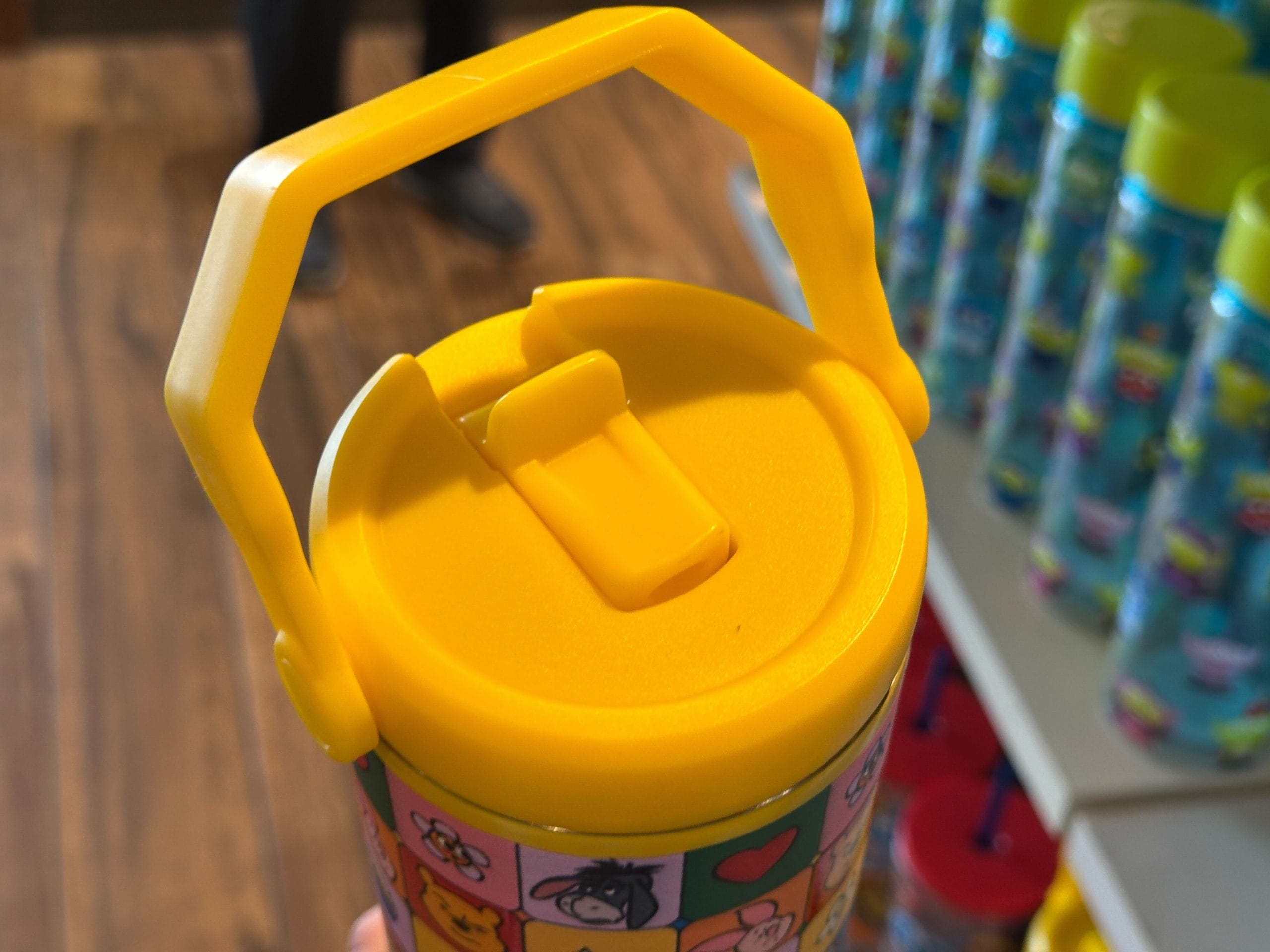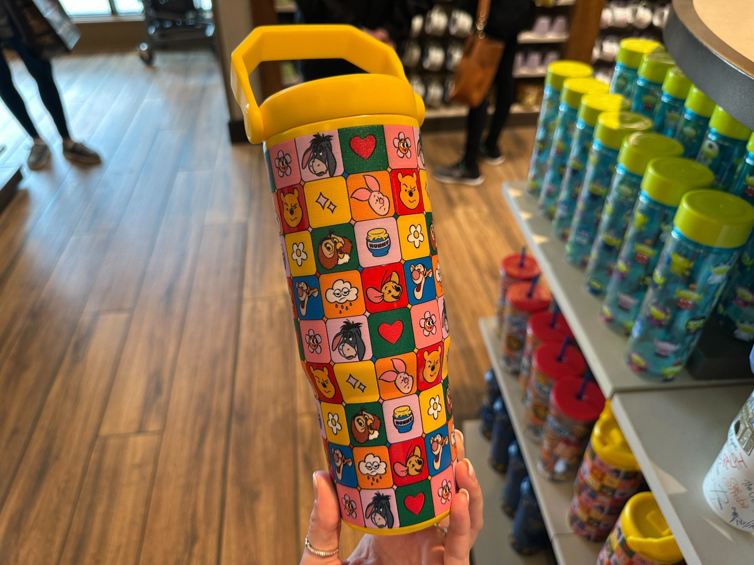 This tumbler features brightly colored squares filled with the faces of Winnie the Pooh and his friends making different expressions, as well as flowers, hearts, clouds, stars, and “hunny” pots. The cap of the tumbler is yellow.