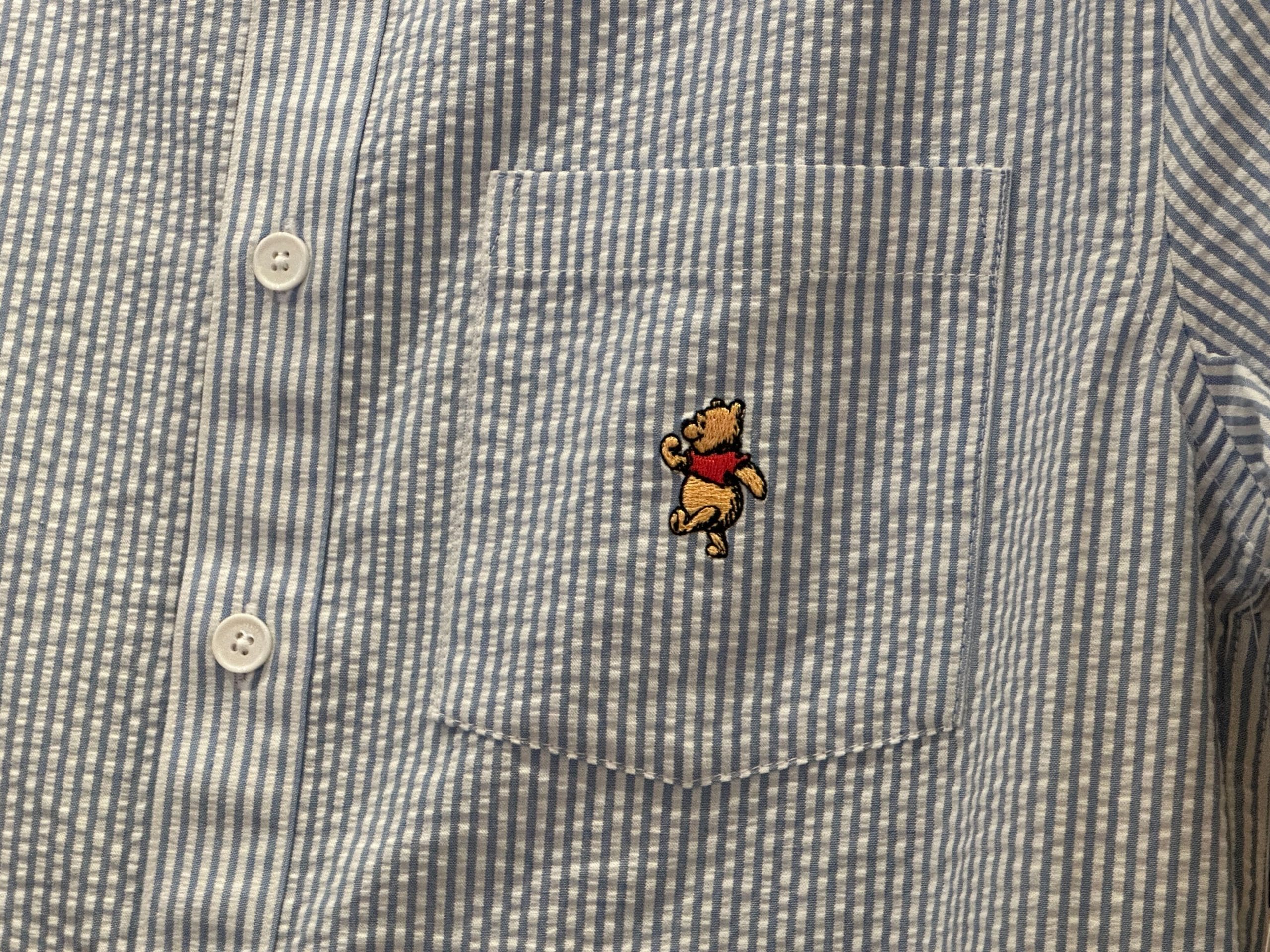 This seersucker shirt for adults features blue-and-white striping, white buttons, and a small, embroidered Winnie the Pooh on the front left pocket.