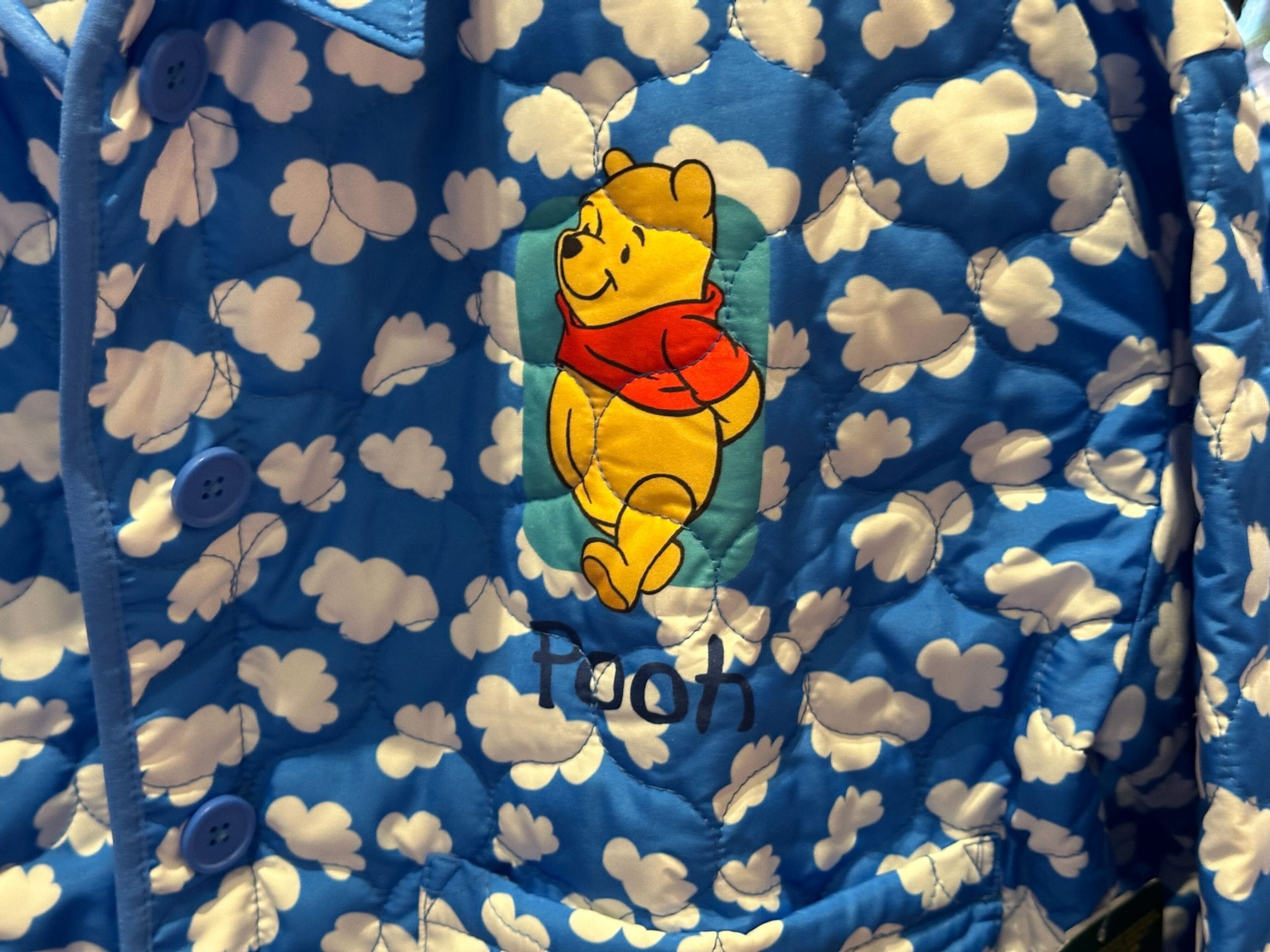 This quilted jacket for adults is blue with a white cloud allover pattern. A small Winnie the Pooh is on the top left corner of the chest, while the back features a large picture of Winnie the Pooh and a honey pot.
