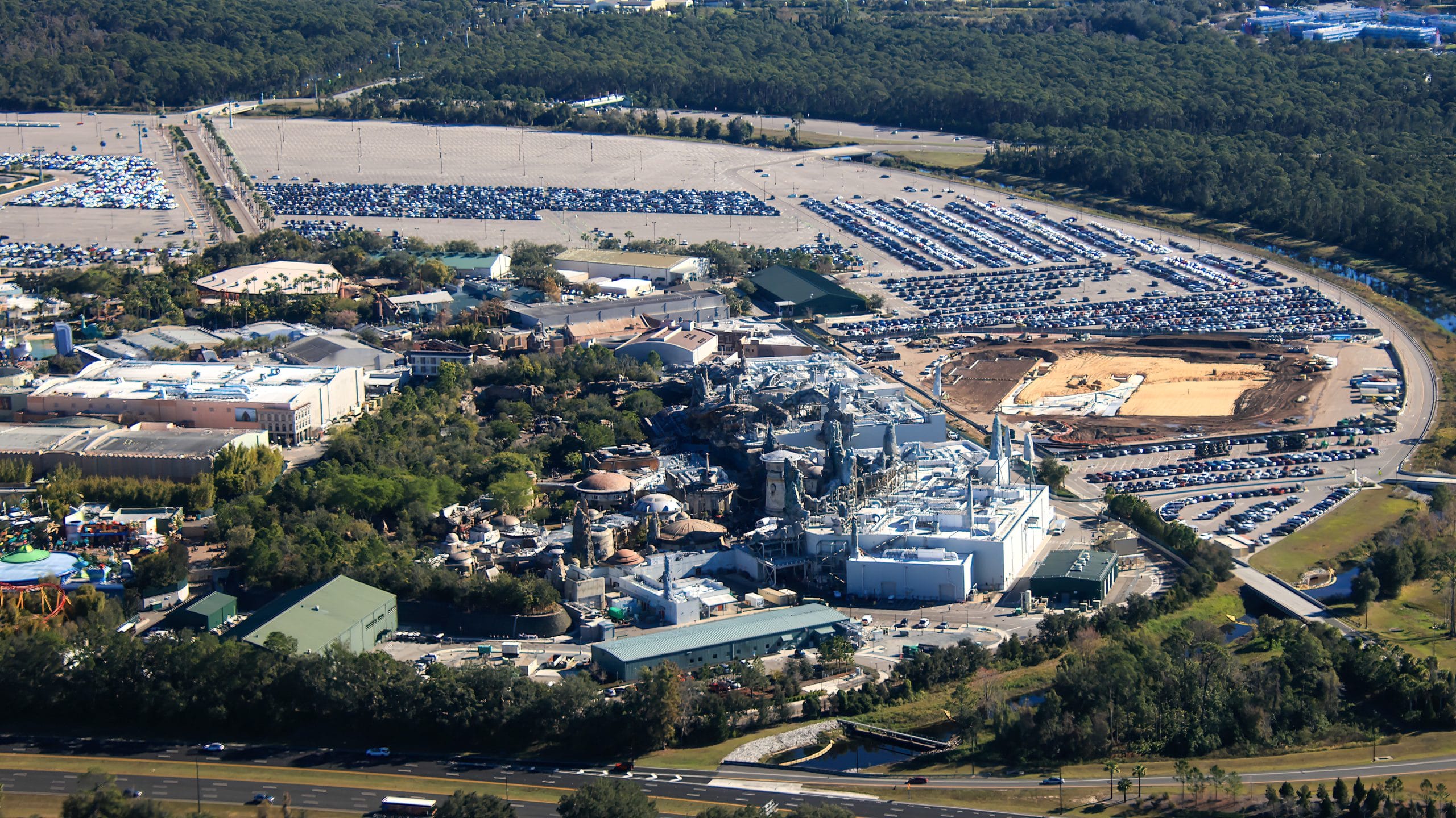 The lower-angle aerial shot above shows a view of the park from the west, or the “back” side of the park relative to the guest entrance. You can see Galaxy’s Edge at the bottom center of the image, and just above that and slightly to the right, the large tan area of land is the site of the upcoming Monsters, Inc. suspended coaster.