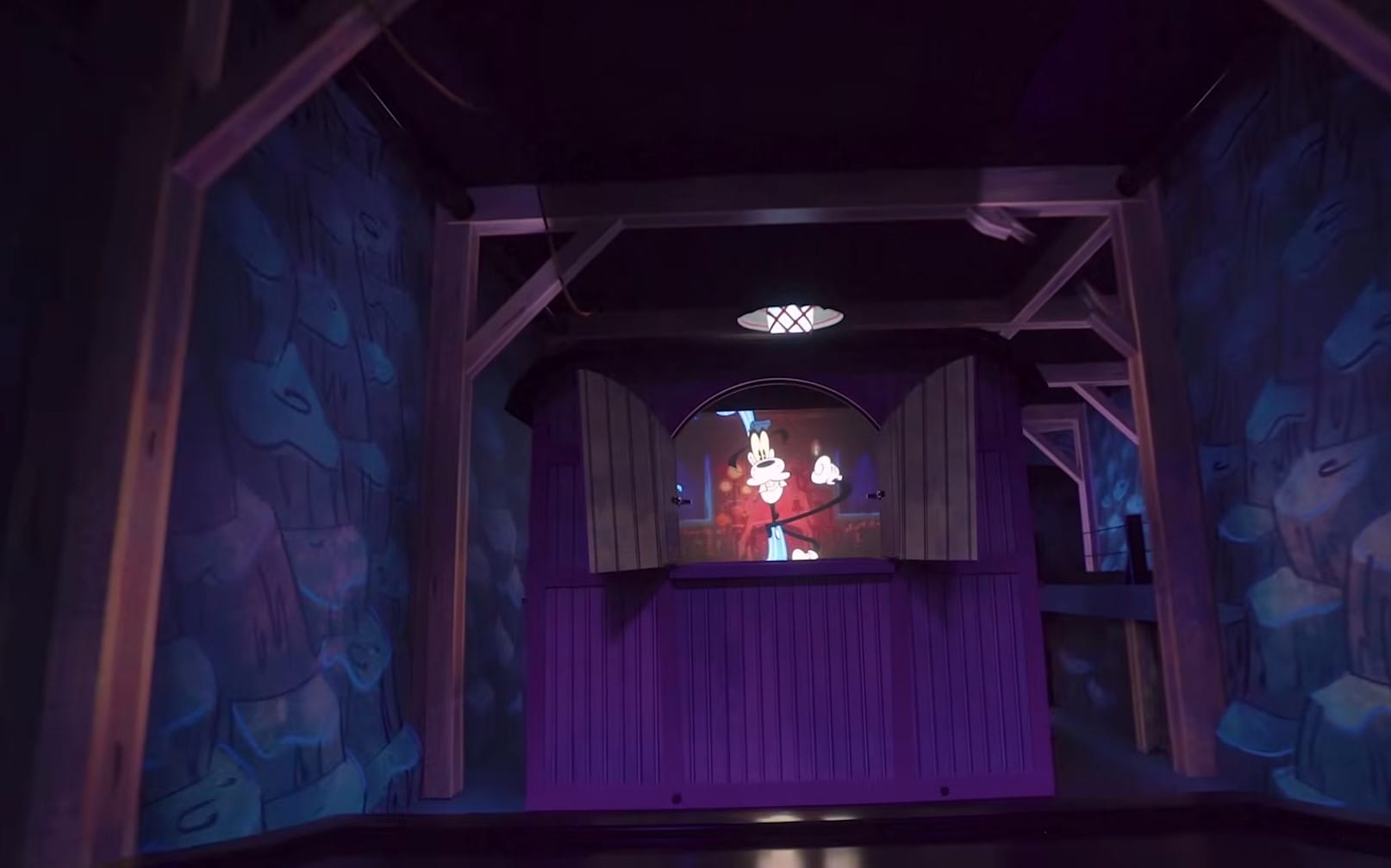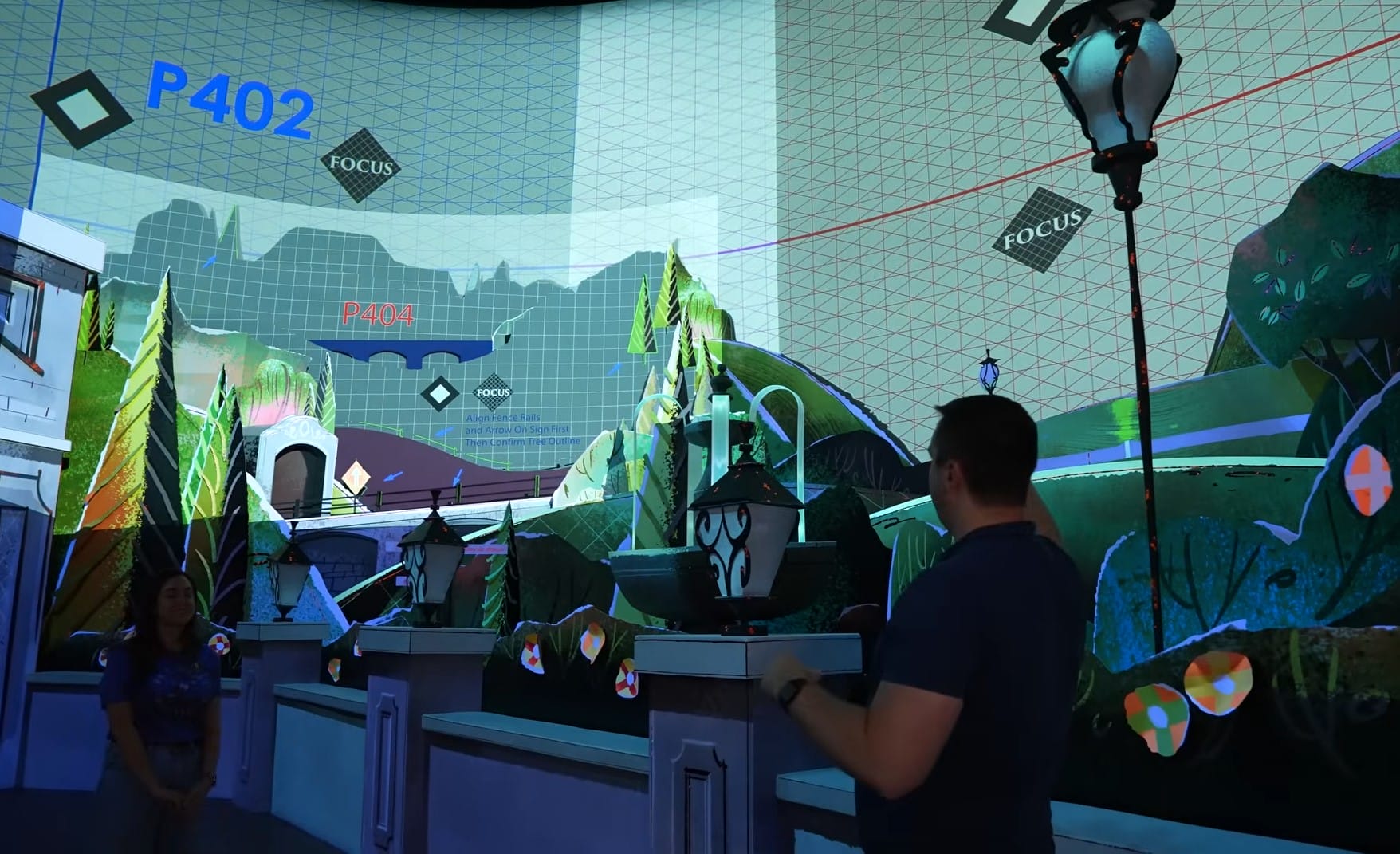 Never done at Disney, projection was married with UV prints with UV paint. They use a specific color, gray, called “Happy Color,” to project all of the scenes on.