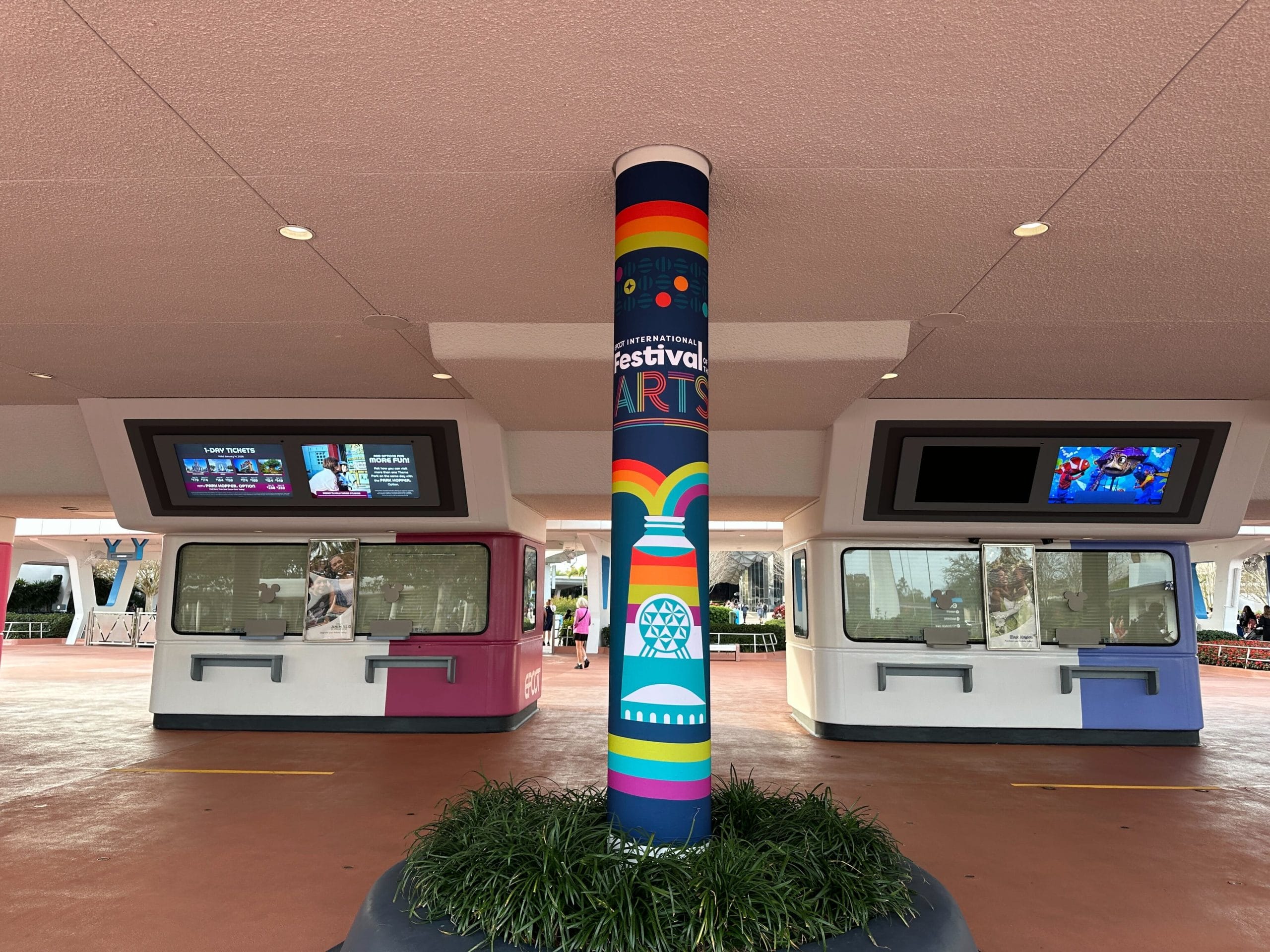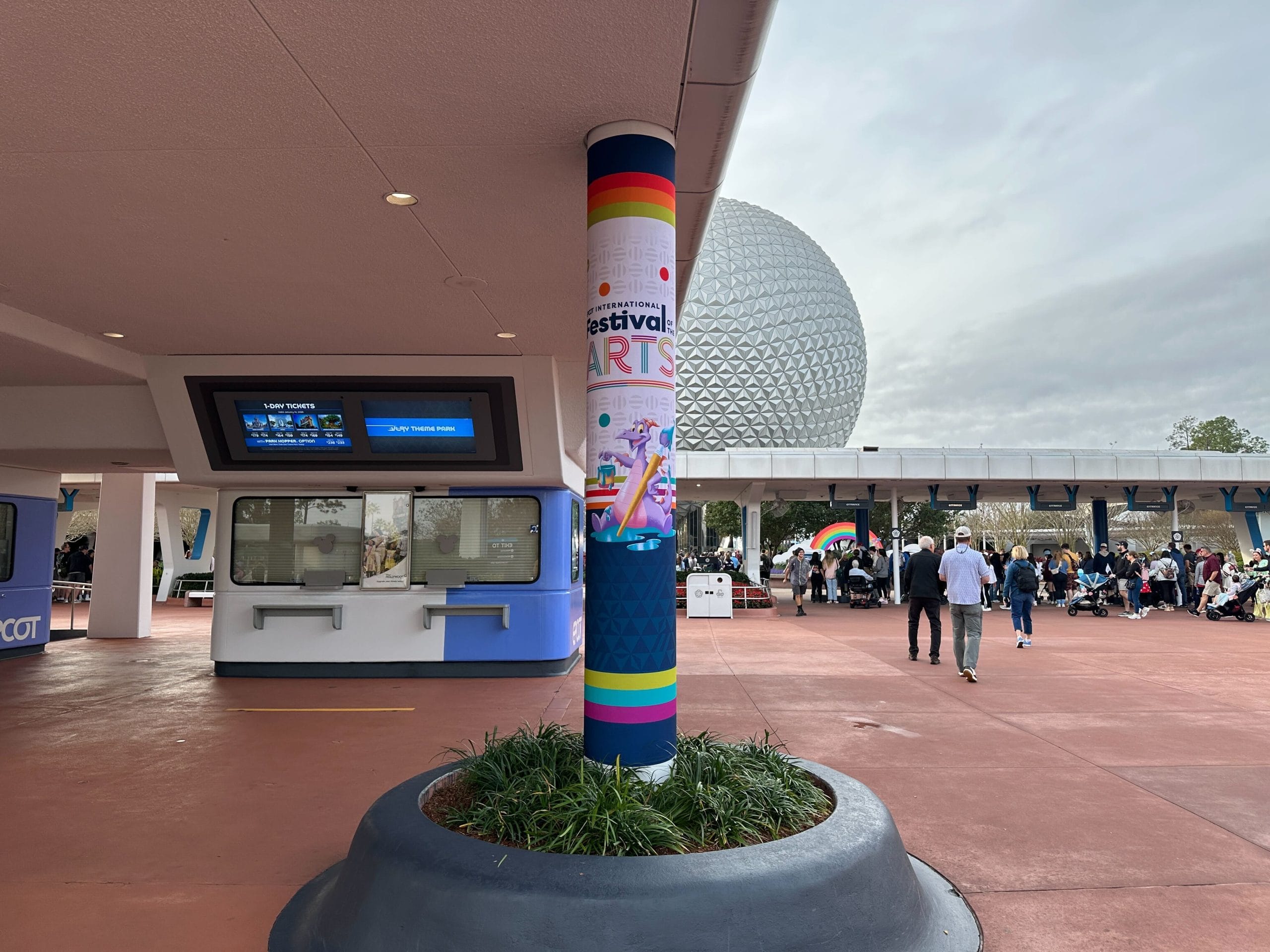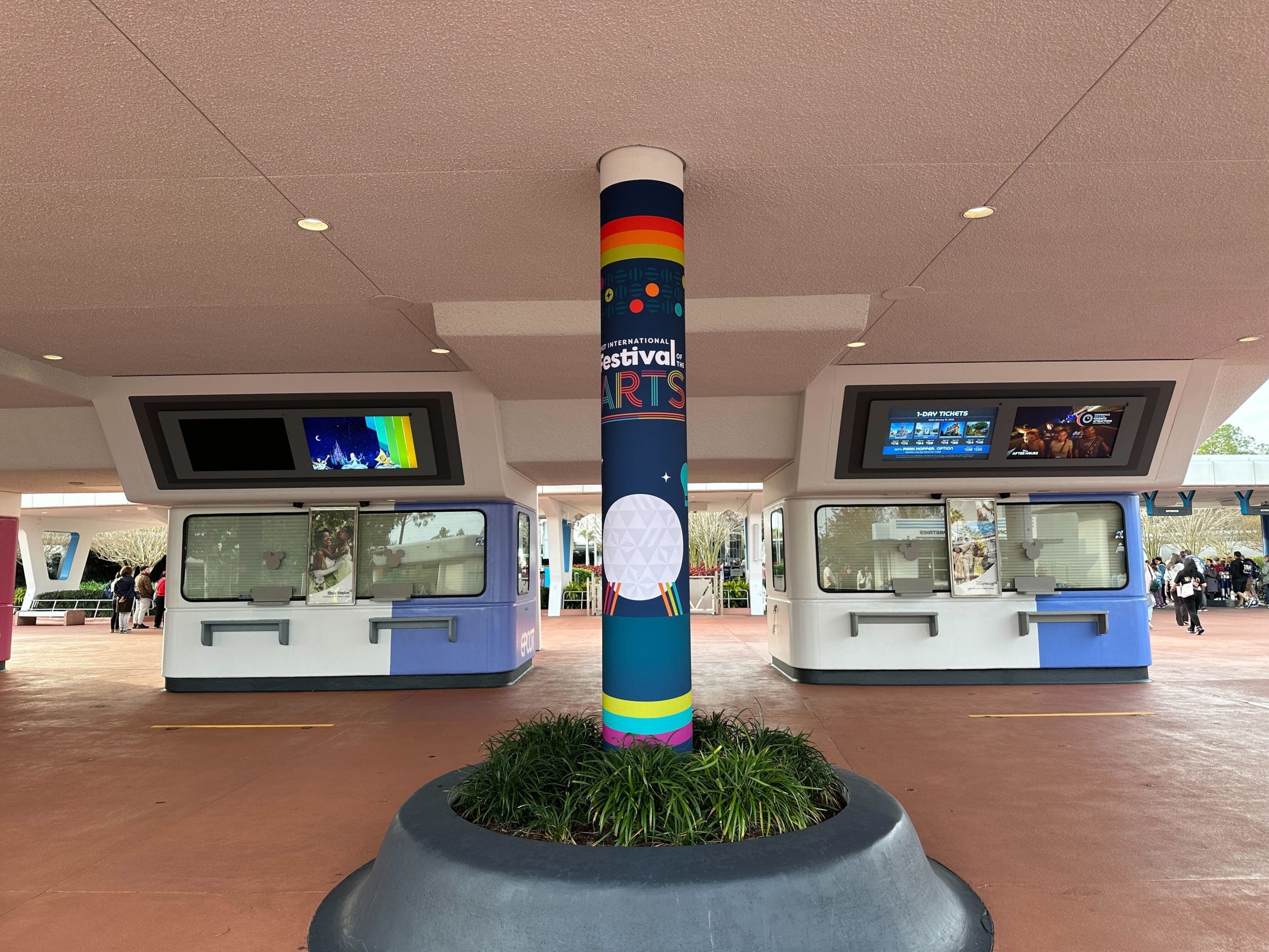 Nearly all of the pillars at the entryway of EPCOT have received decals with the festival logo on it, accompanied by Figment posing or another EPCOT-themed image.