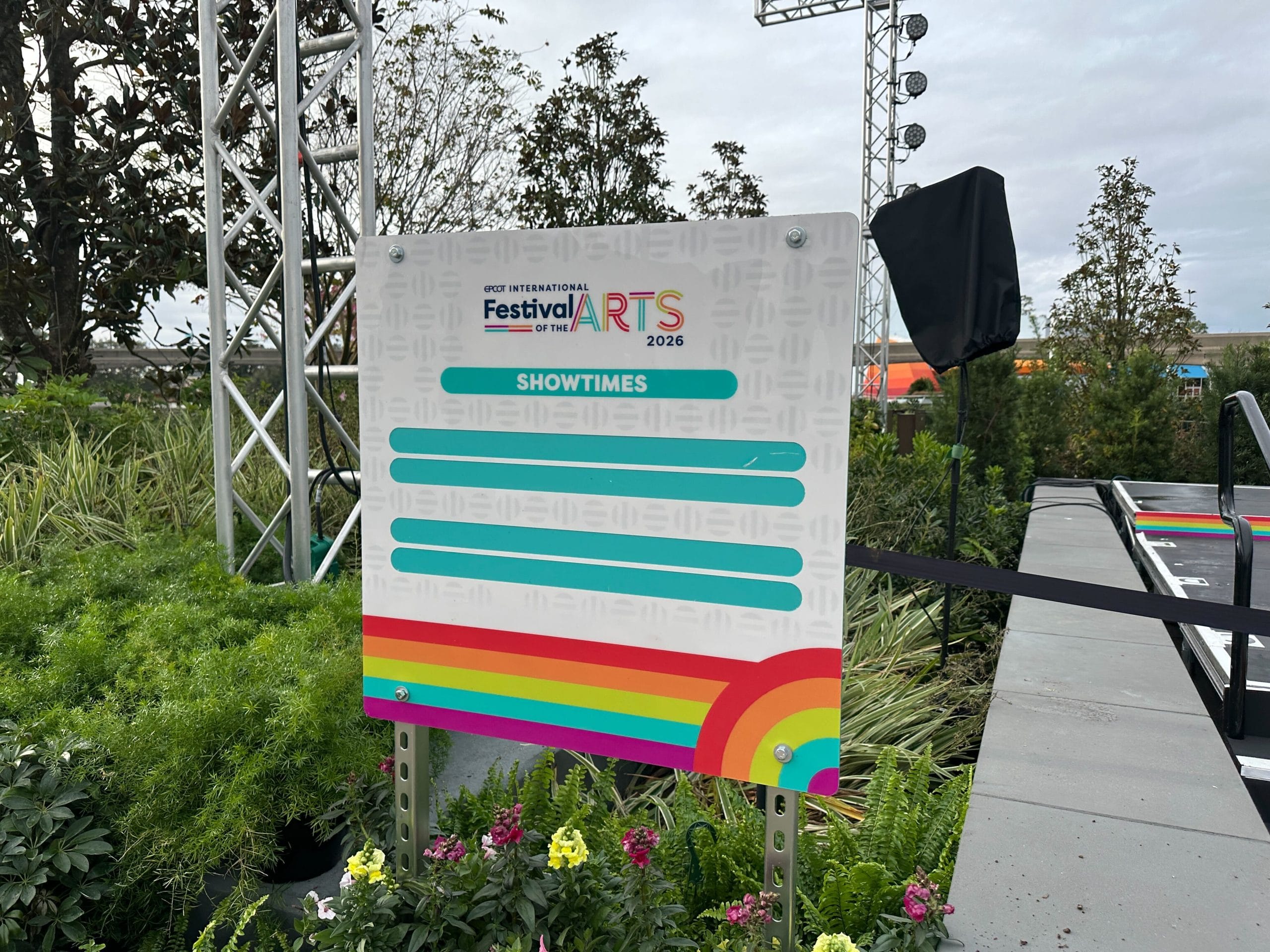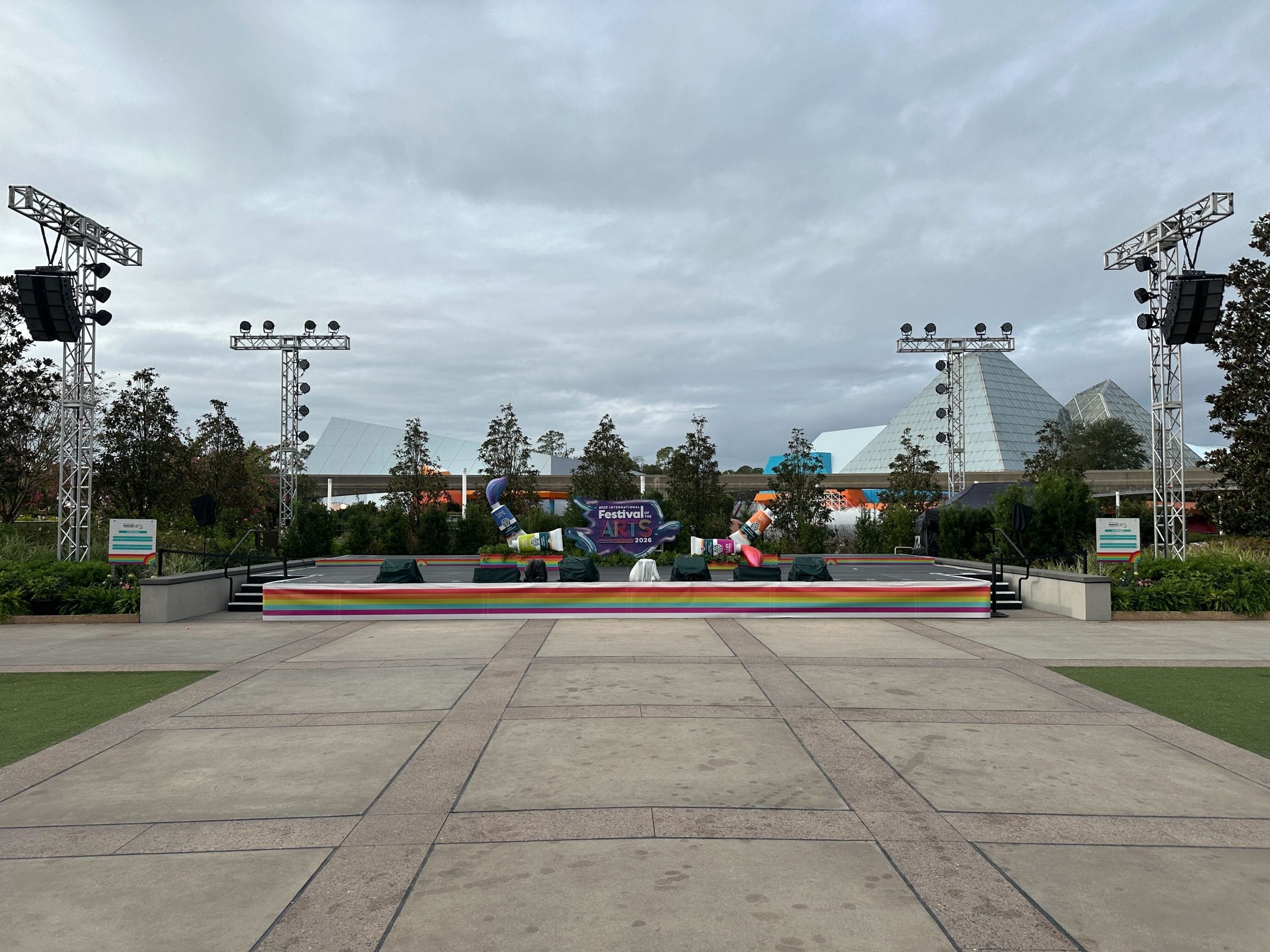 Lastly, our reporter spotted the banners for the 2026 edition, which are a close match to the previous year’s style. They each feature the EPCOT International Festival of the Arts wordmark, with “Arts” highlighted thanks to rainbow lettering. One of the designs features World Showcase buildings, hot air balloons, and Spaceship Earth.