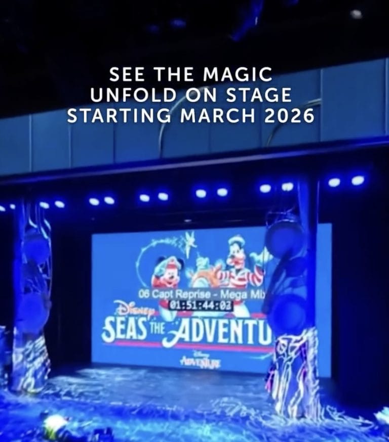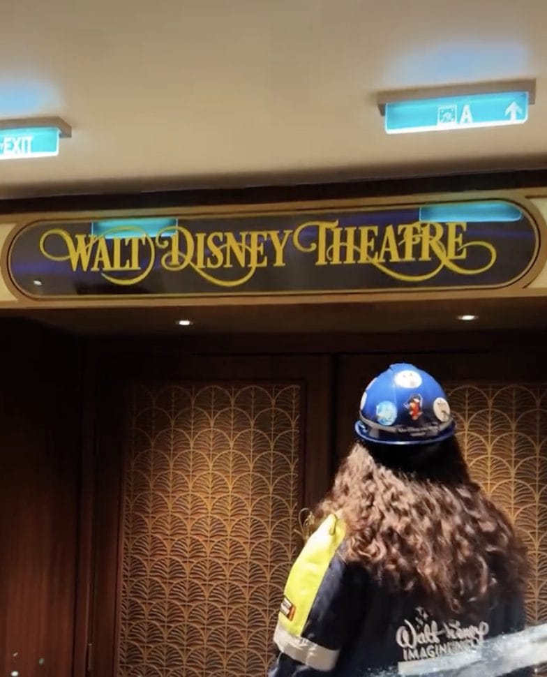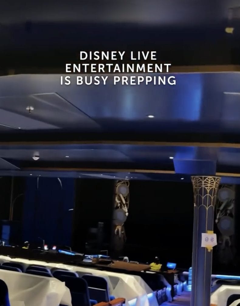 In the short clip, Walt Disney Imagineers take viewers inside the Walt Disney Theatre aboard the Disney Adventure. Inside, a quick look at the theatre and “Disney Live Entertainment is busy prepping…” is flashed on screen.