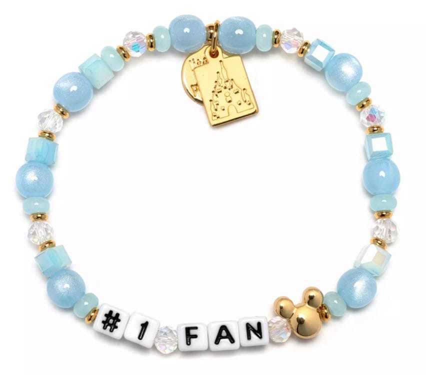 The letter beads spell out “#1 Fan”, and the Little Words Project bracelet also features a Mickey icon-shaped bead. Other beads are shades of blue and clear/white, and it has goldtone spacers. It includes an exclusive die-cut goldtone Fantasyland Castle charm collector’s tag.