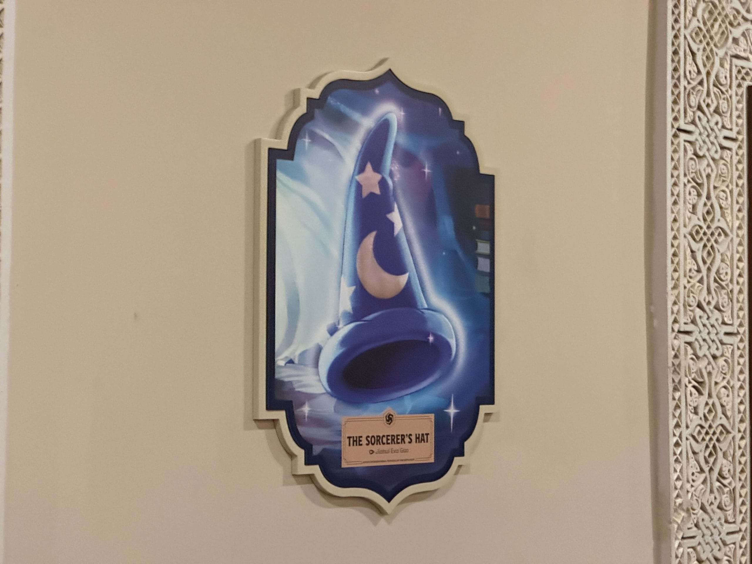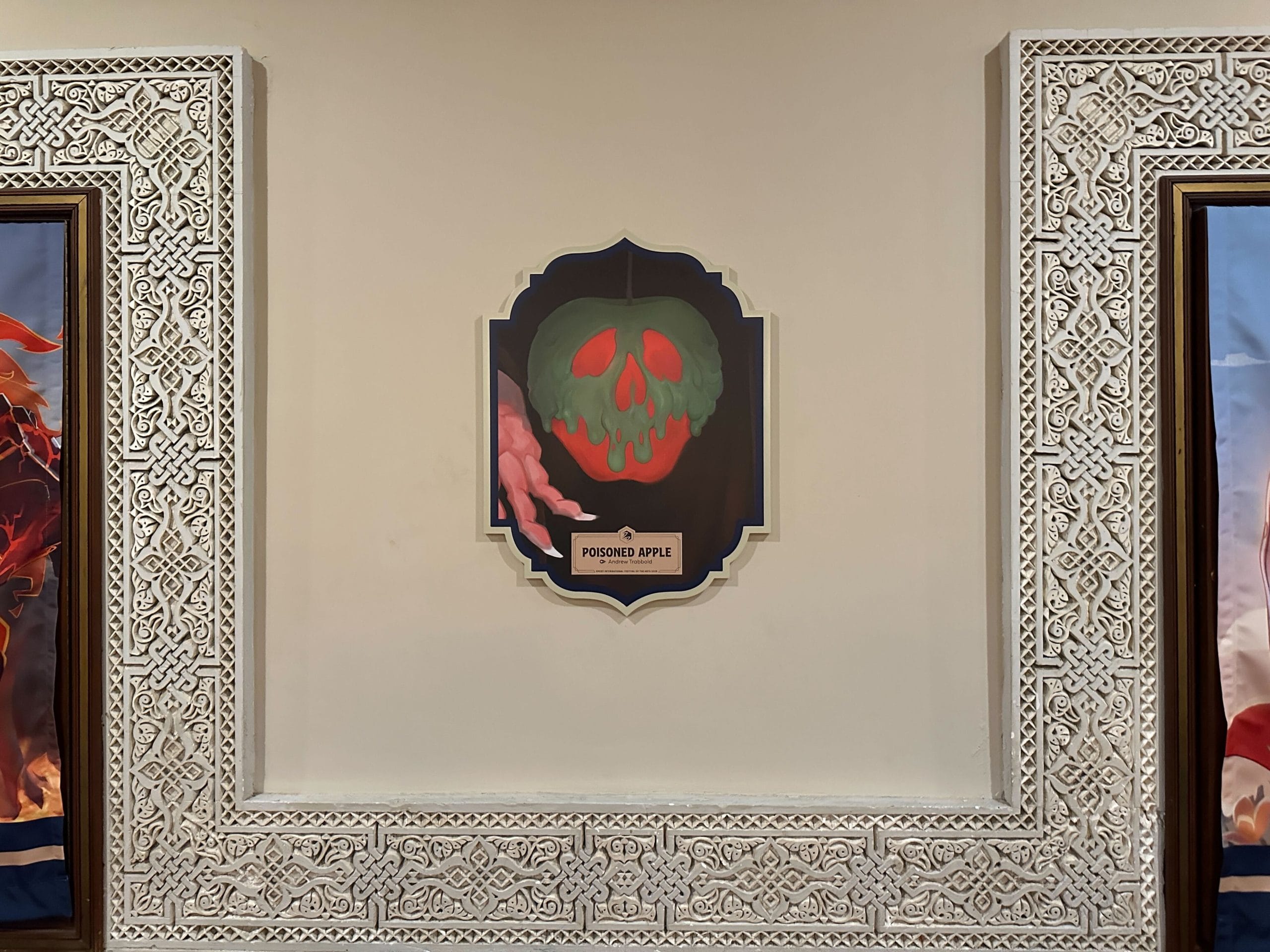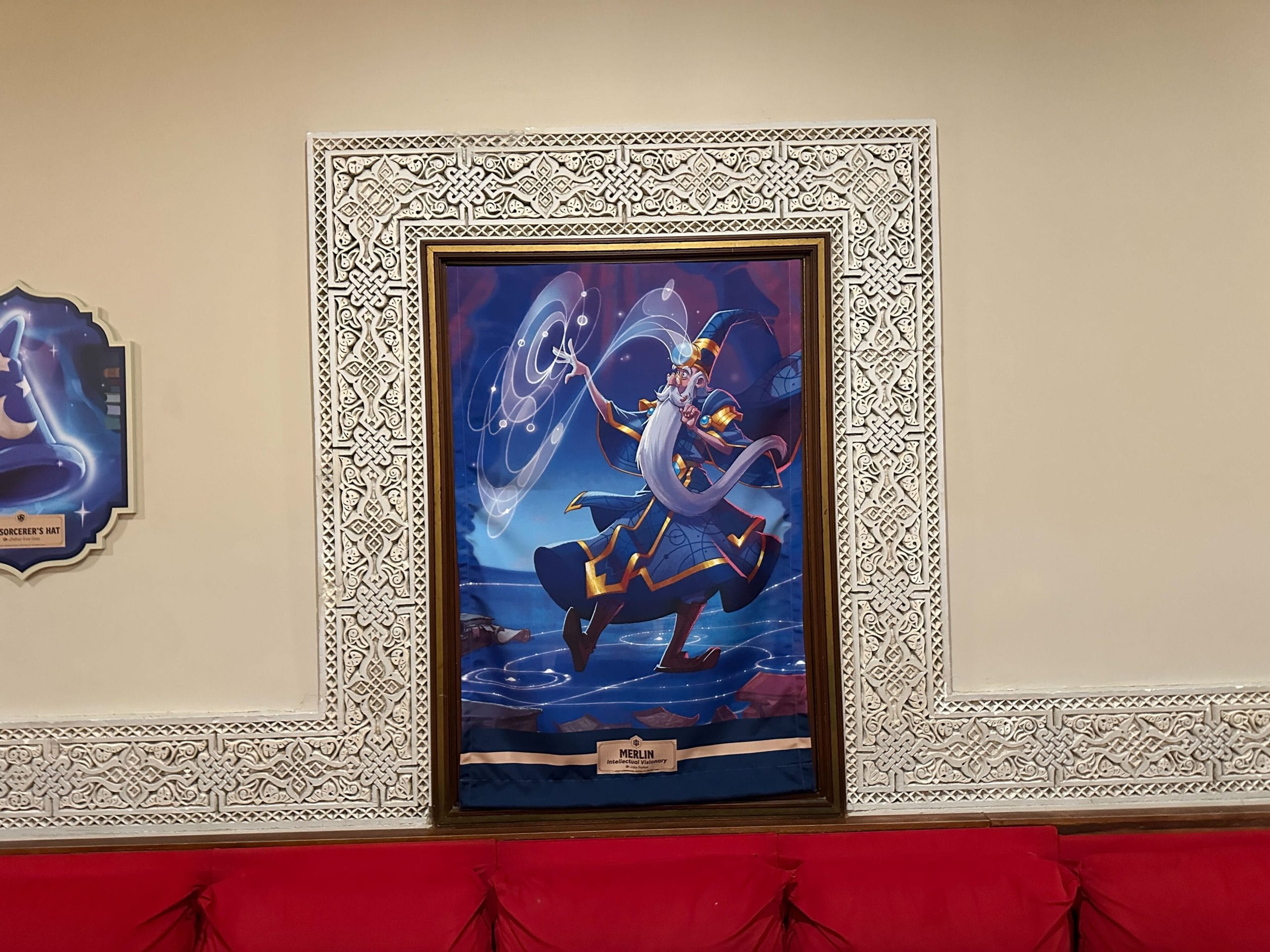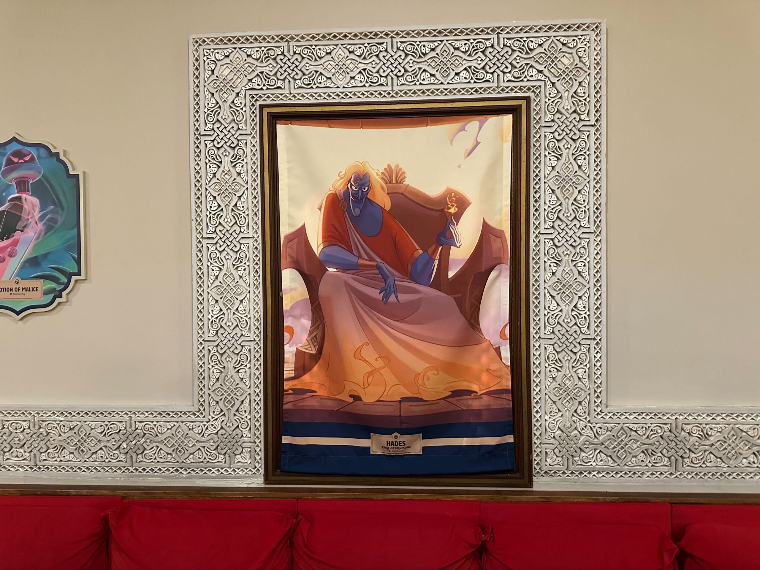 More character banners are on the walls. Between them are decals of iconic objects from Lorcana like Mickey’s Sorcerer Hat and the poisoned apple.