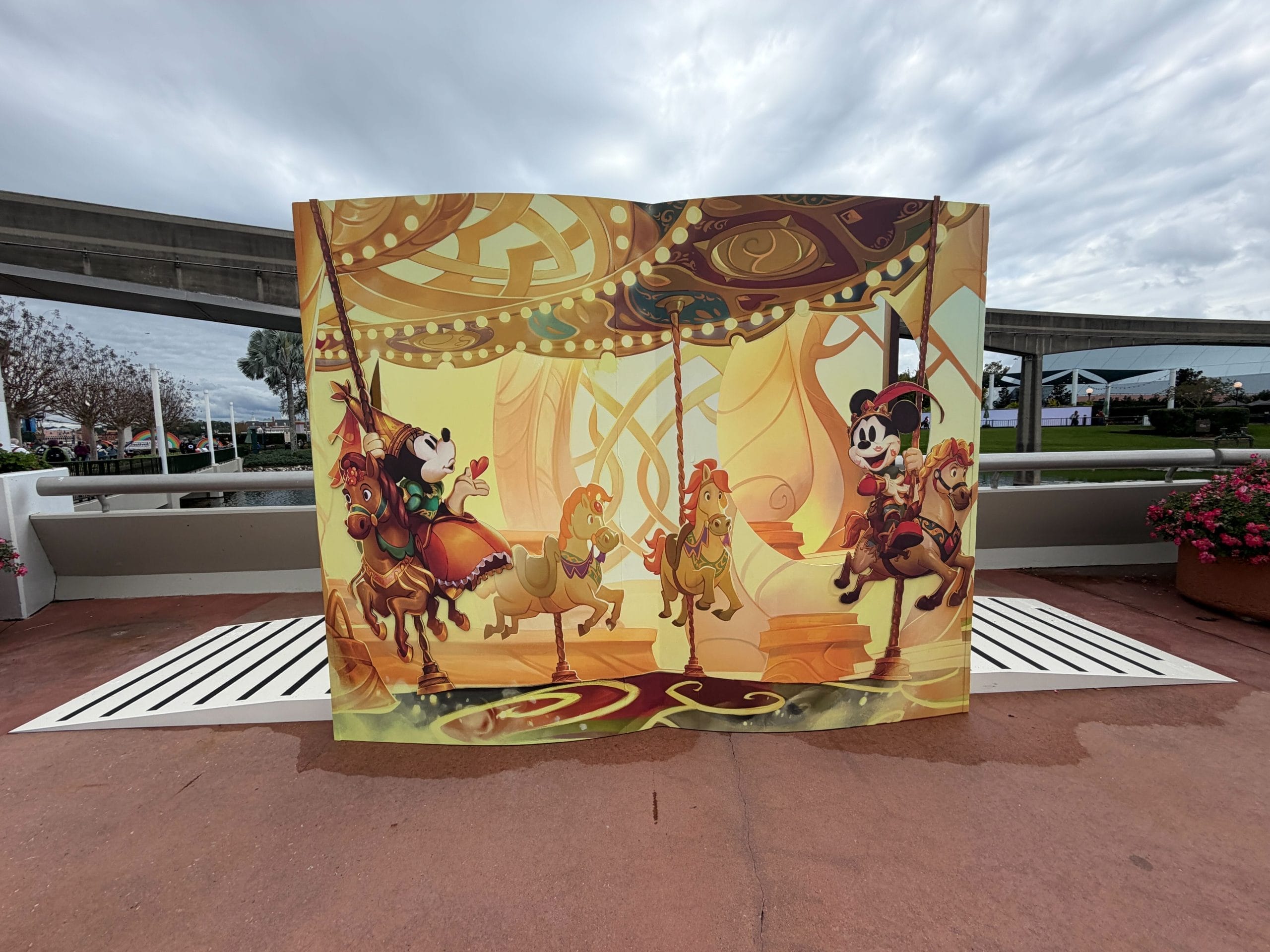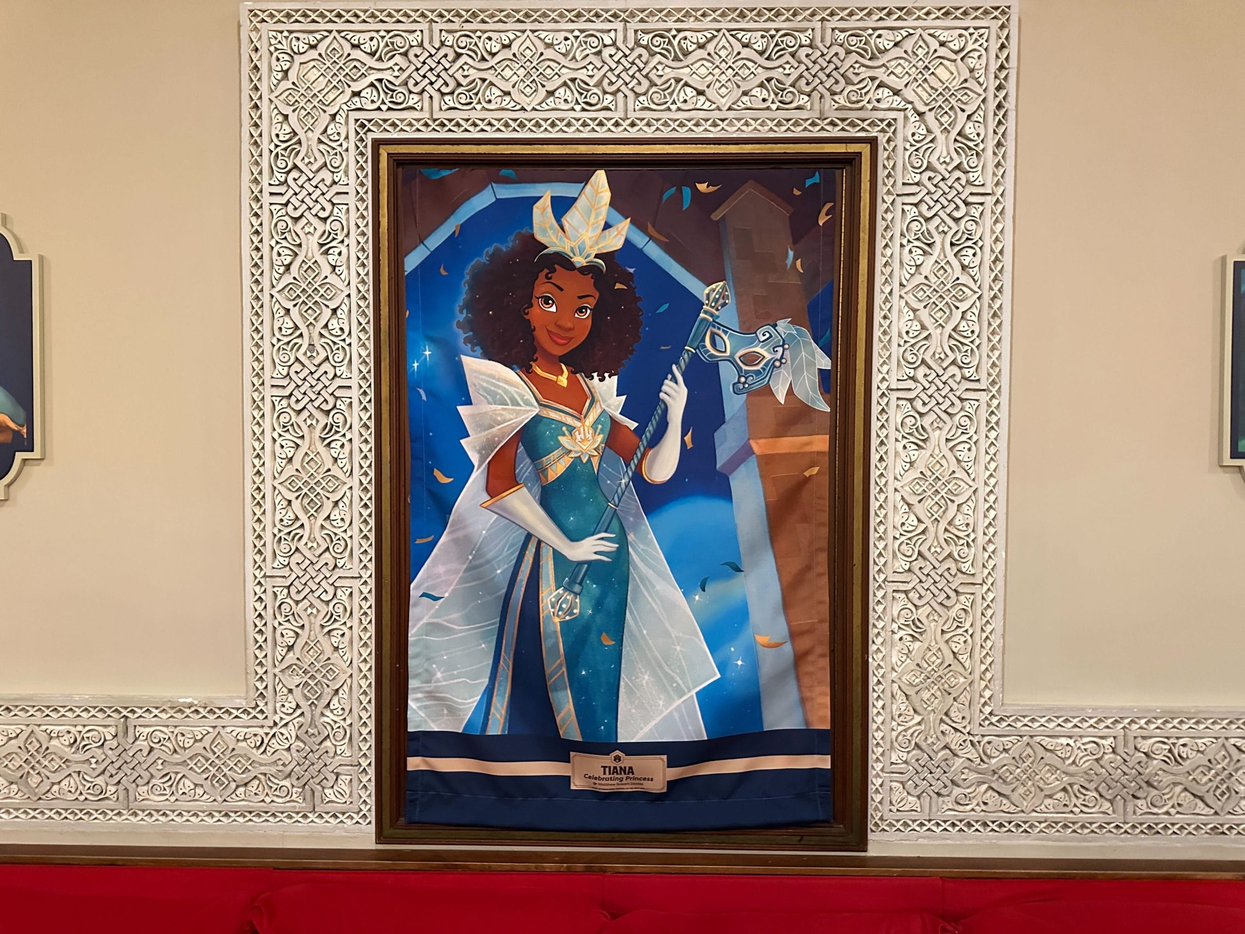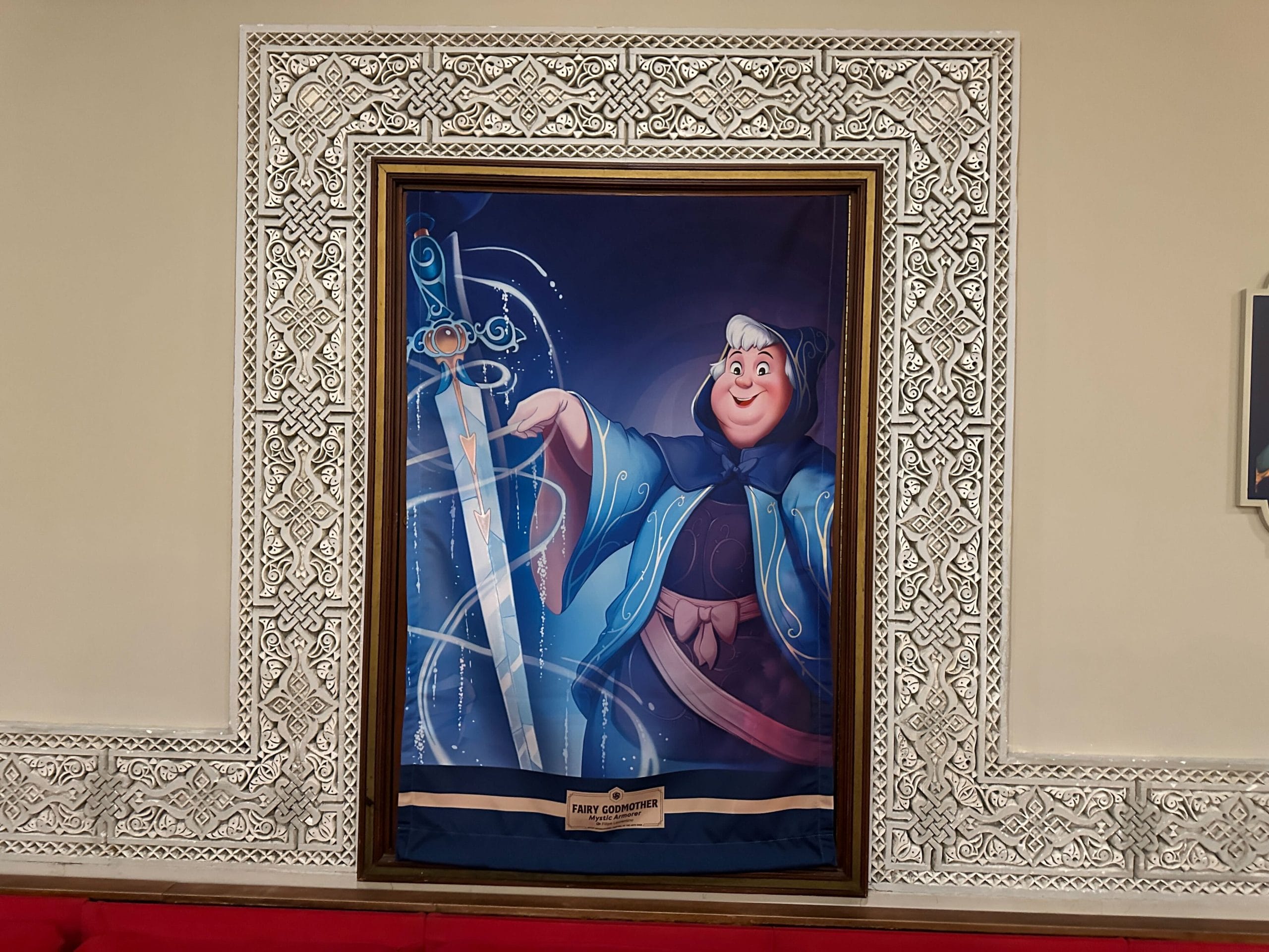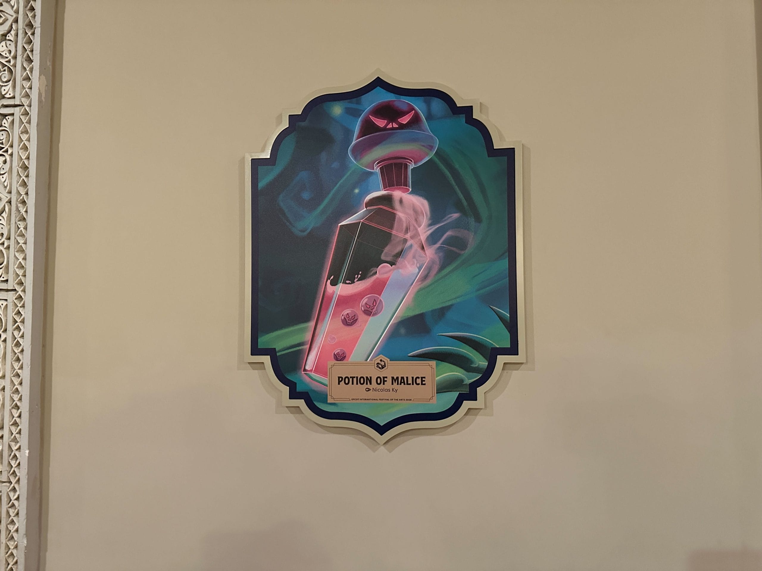 More character banners are on the walls. Between them are decals of iconic objects from Lorcana like Mickey’s Sorcerer Hat and the poisoned apple.