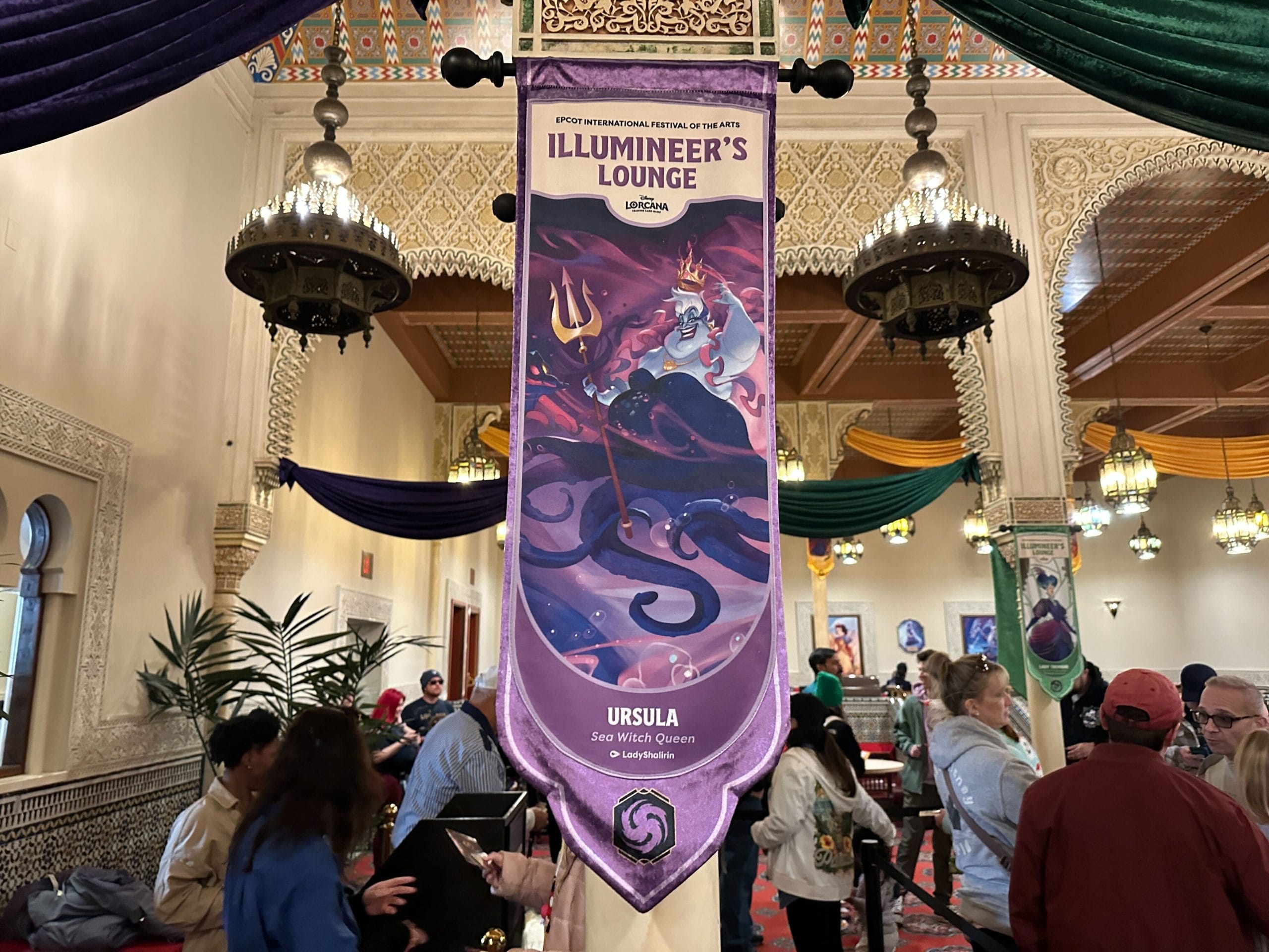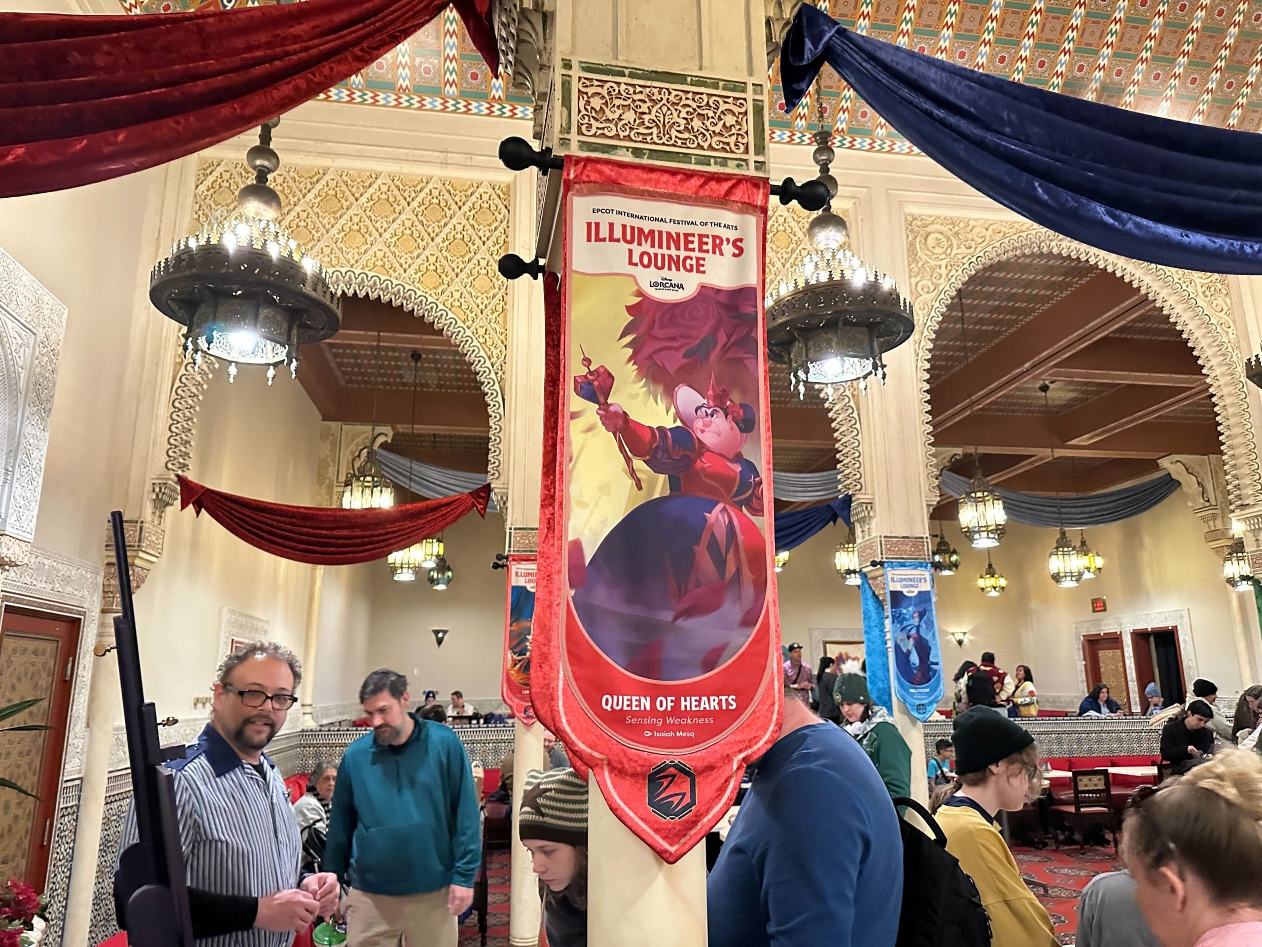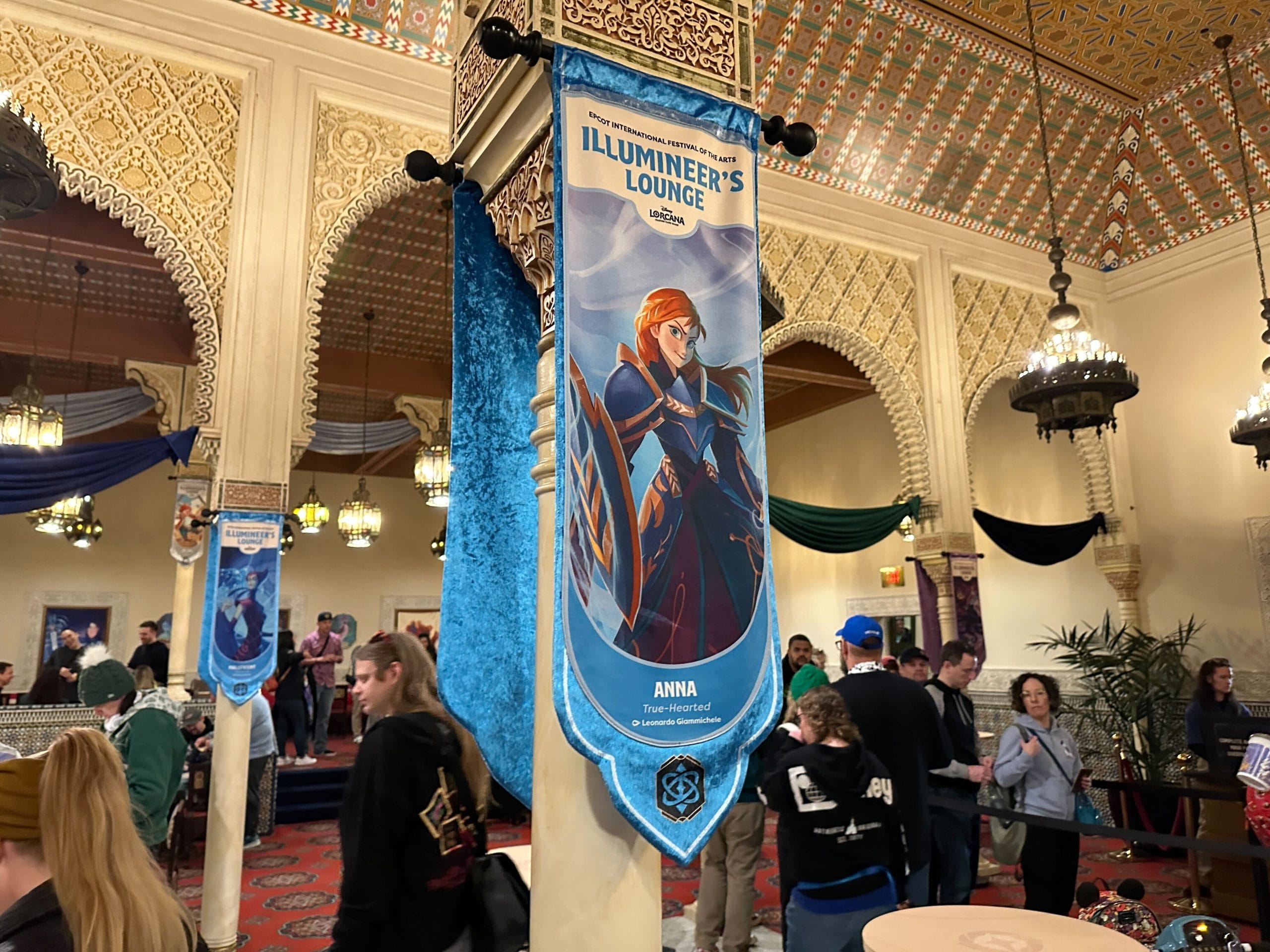 Inside, the lounge is decorated with Lorcana signage and banners featuring card art.