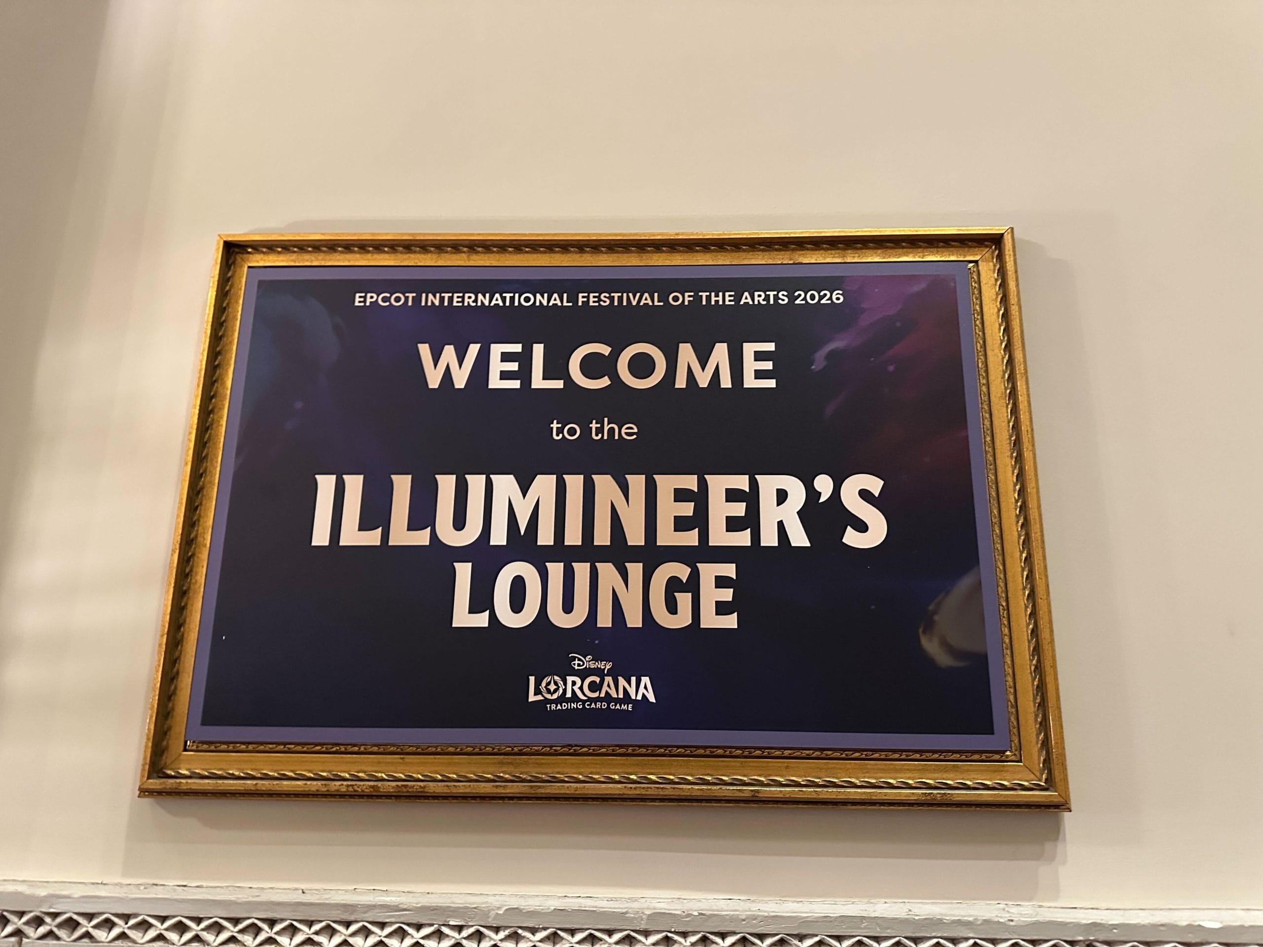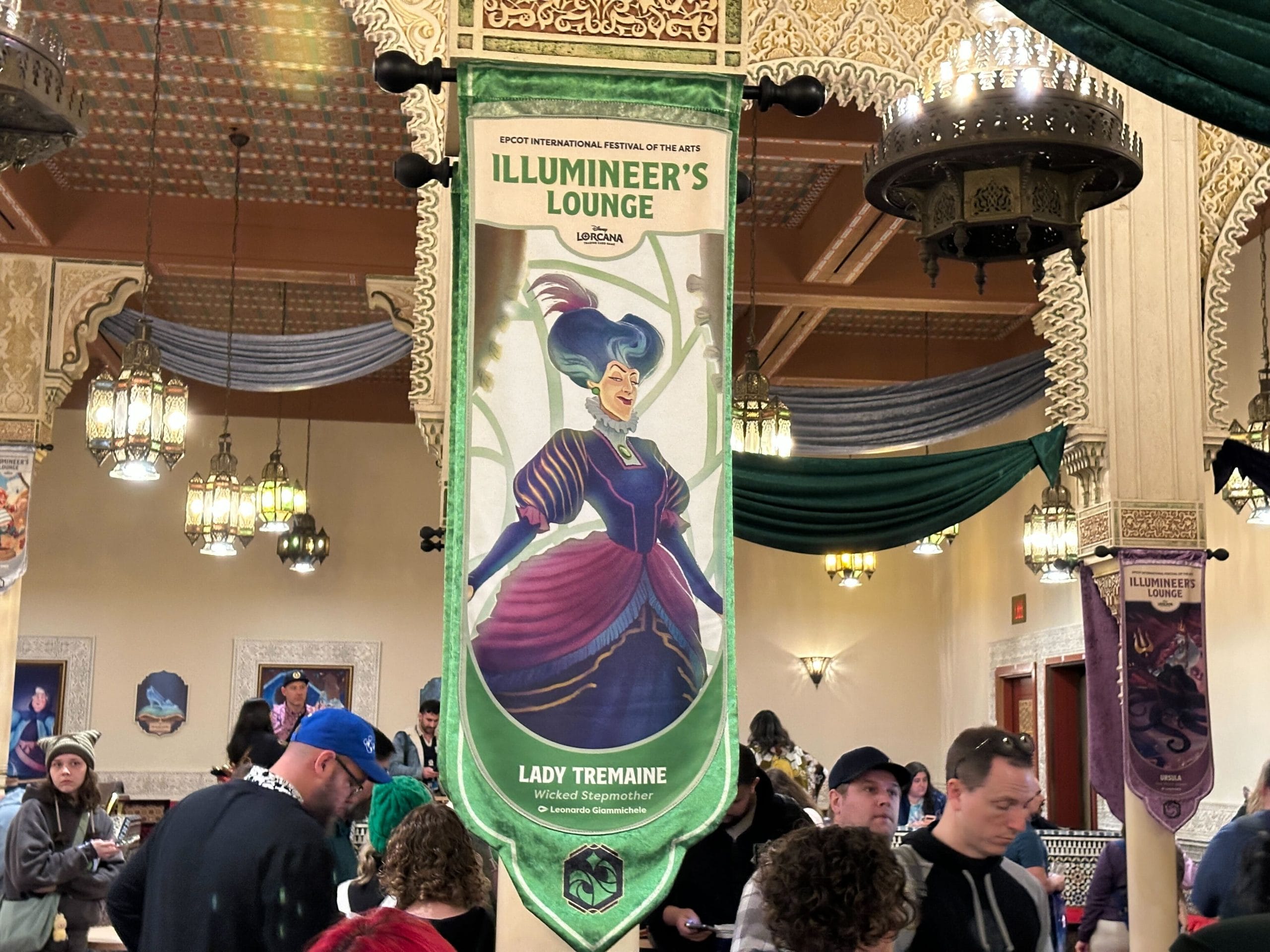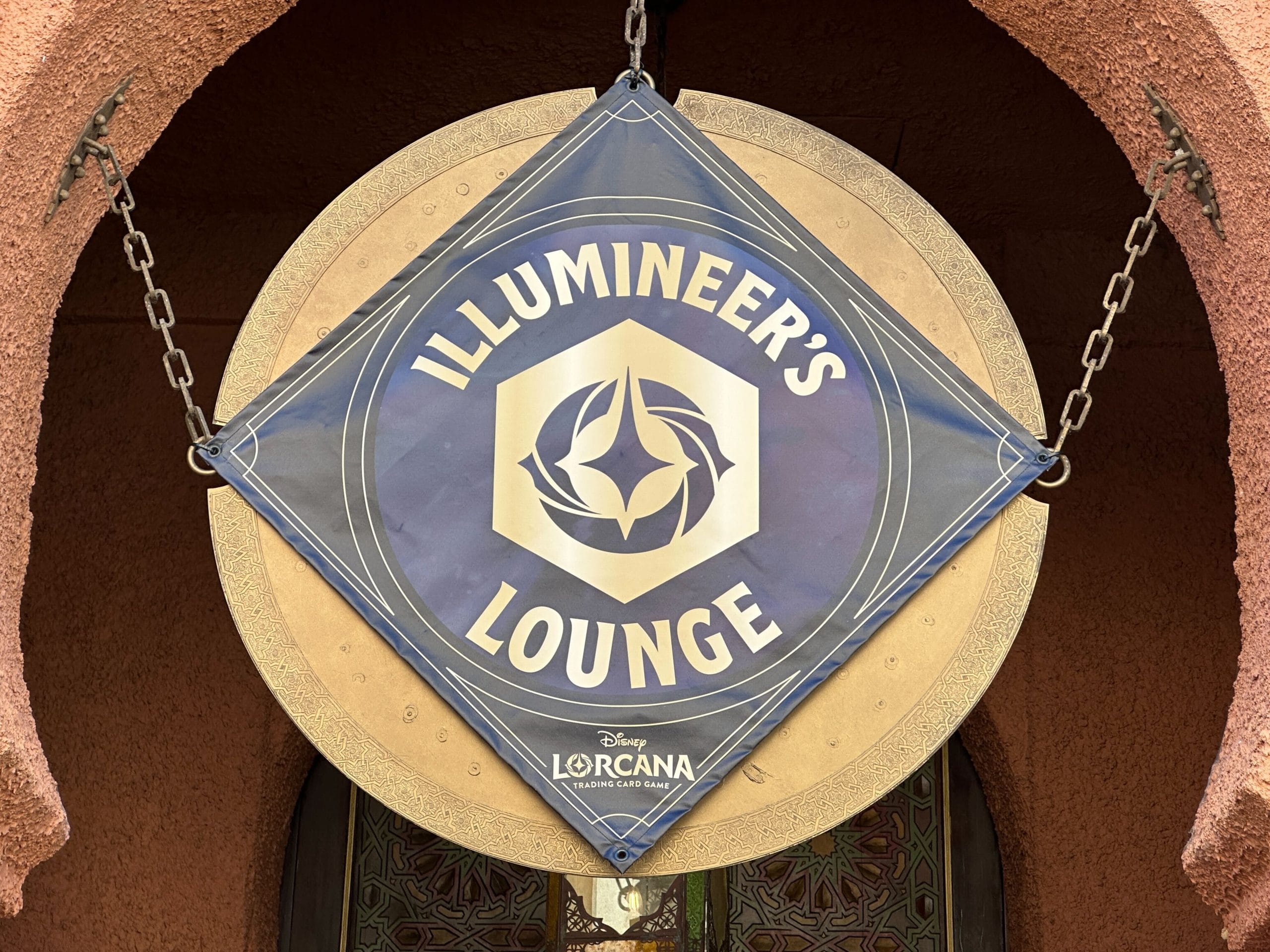 Inside, the lounge is decorated with Lorcana signage and banners featuring card art.