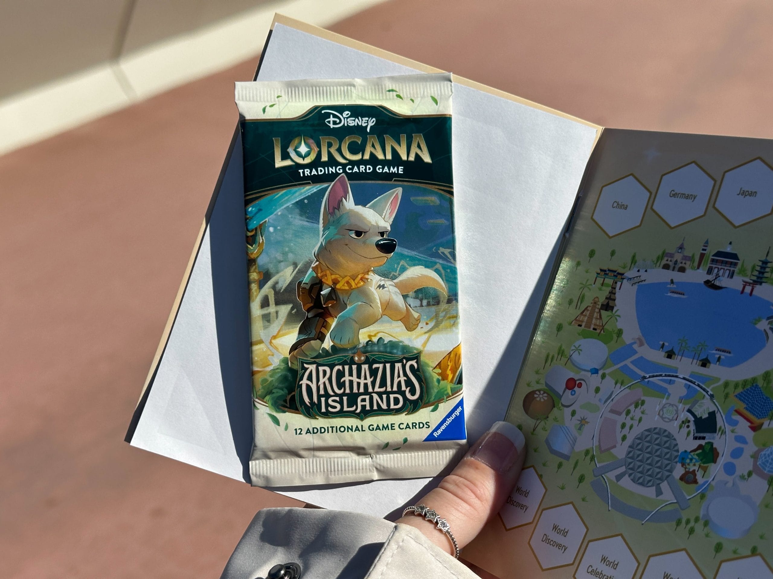 The booster pack is from the Archazia’s Island set and contains 12 random cards. Guests must trade cards with other guests to collect the four required cards. They can do this in the Illumineer’s Lounge at the Morocco Pavilion. There are 25 different collection quests to ensure a variety of cards are traded.