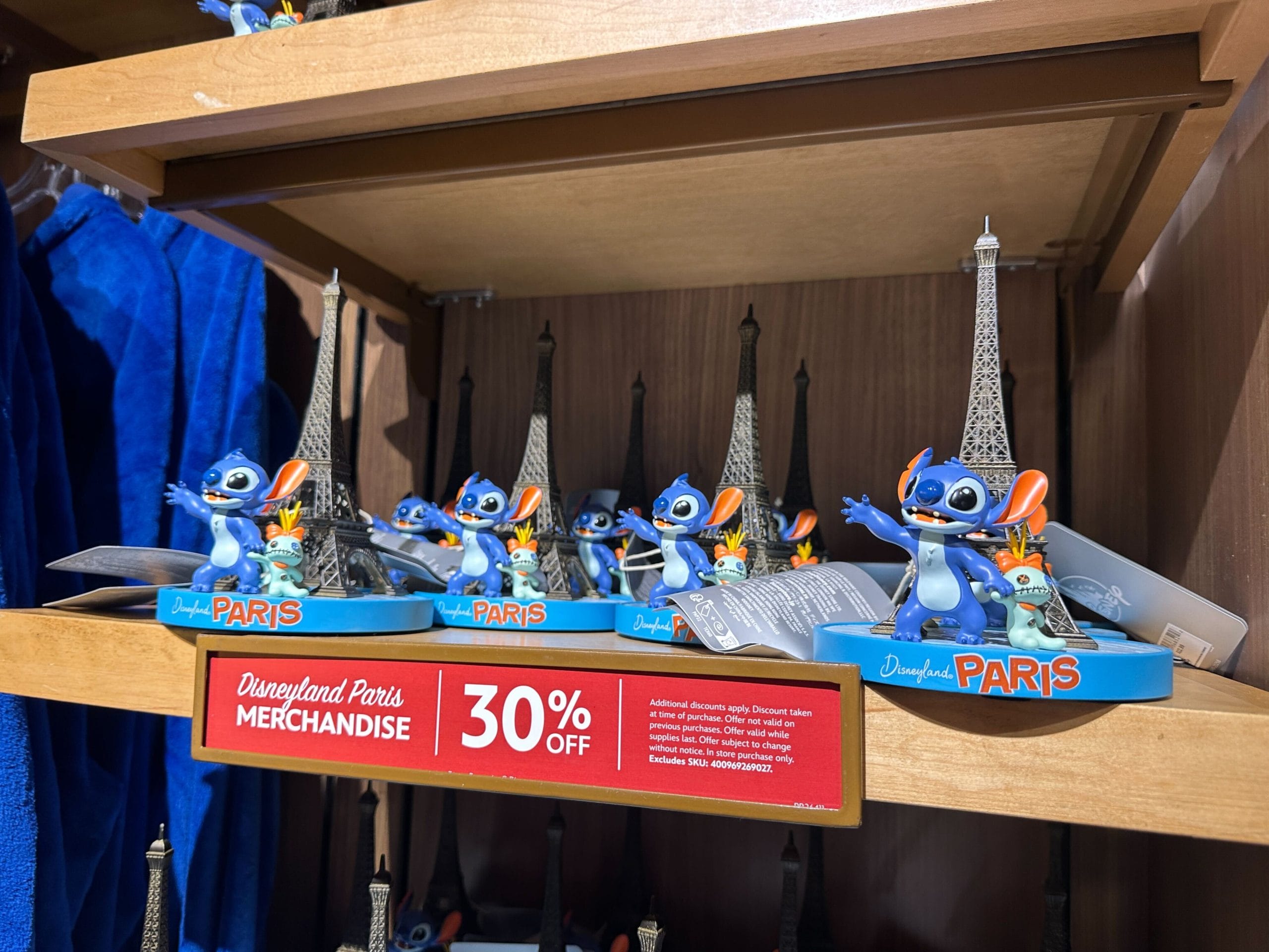 The Disneyland Paris merchandise that is discounted includes apparel and decor items such as a figure of Stitch and Scrump with the Eiffel Tower.