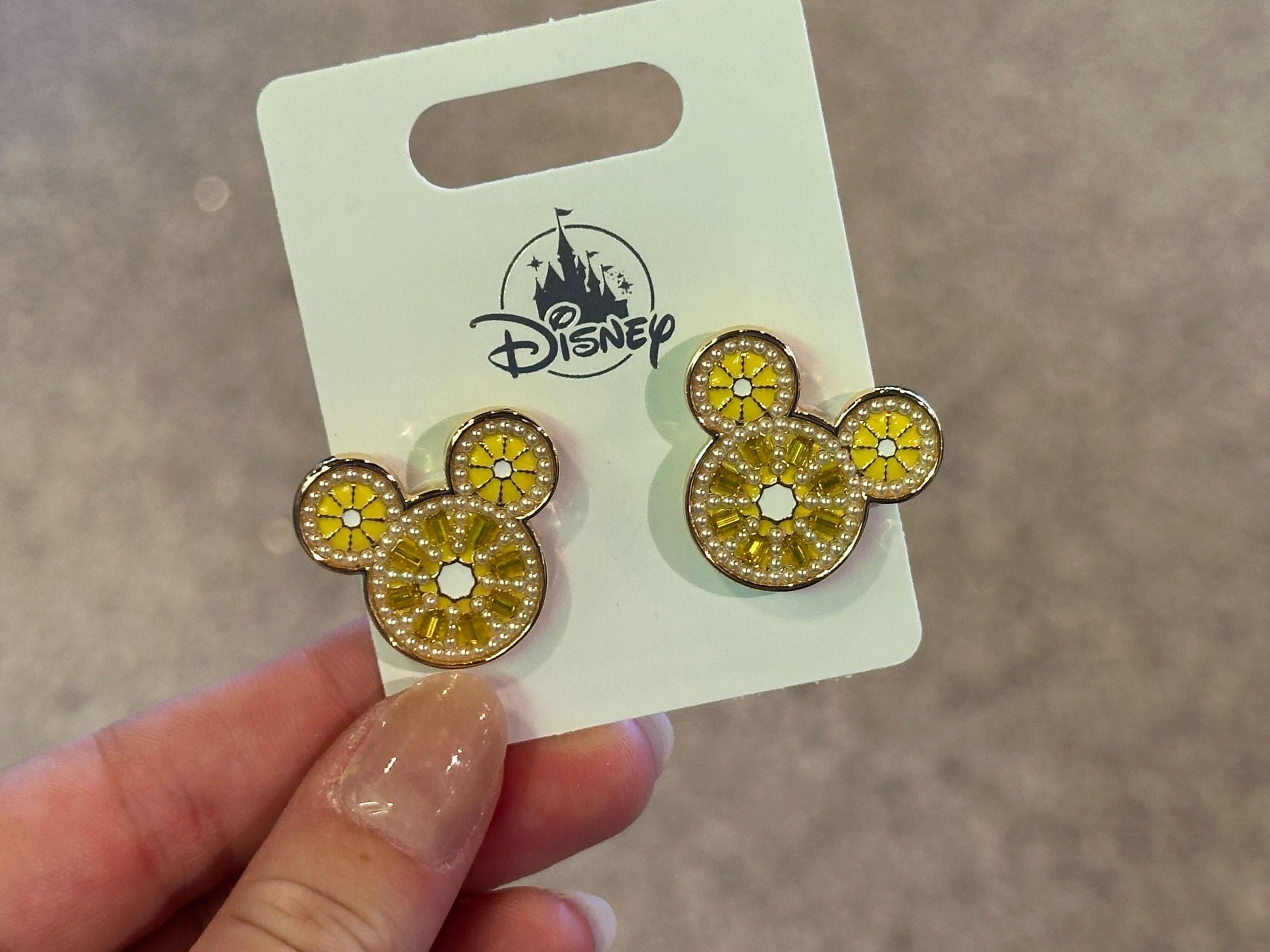 These studs have large Mickey-shaped, lemon-inspired designs. They’re adorned with white and yellow beads against yellow enamel. The edges are golden.