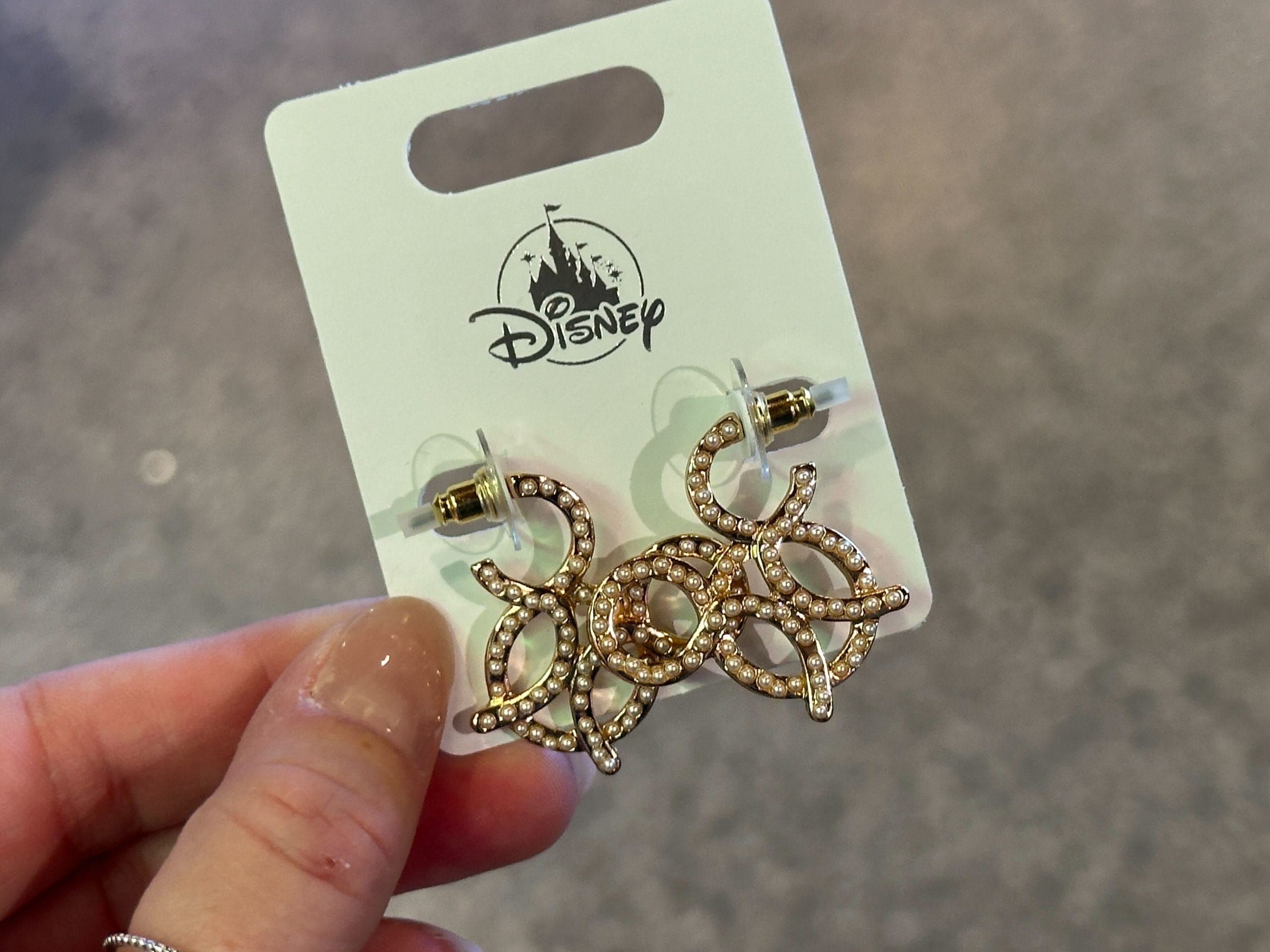 These golden earrings are shaped like Mickey pretzels. They’re covered in white pearl-like beads resembling salt.