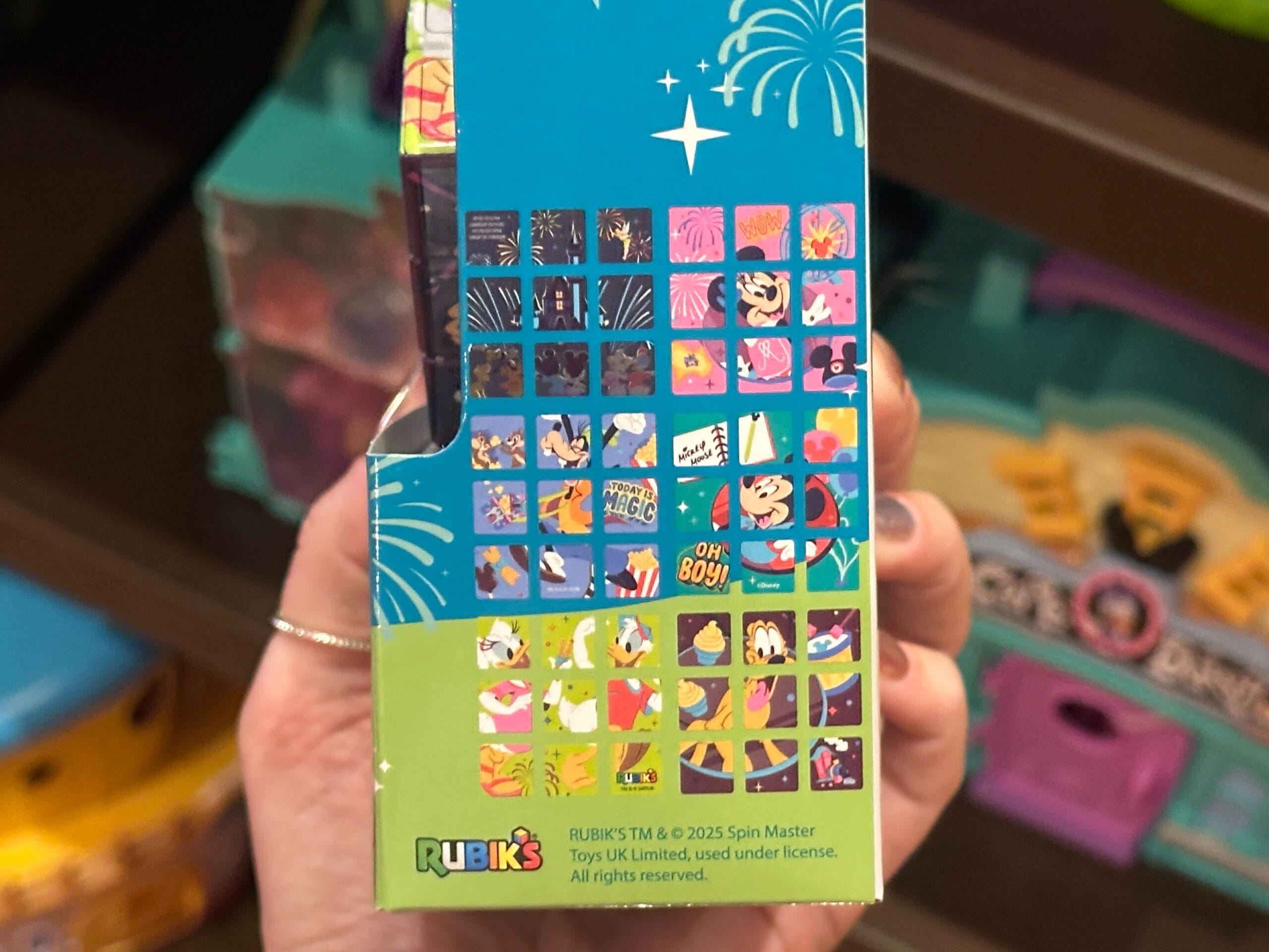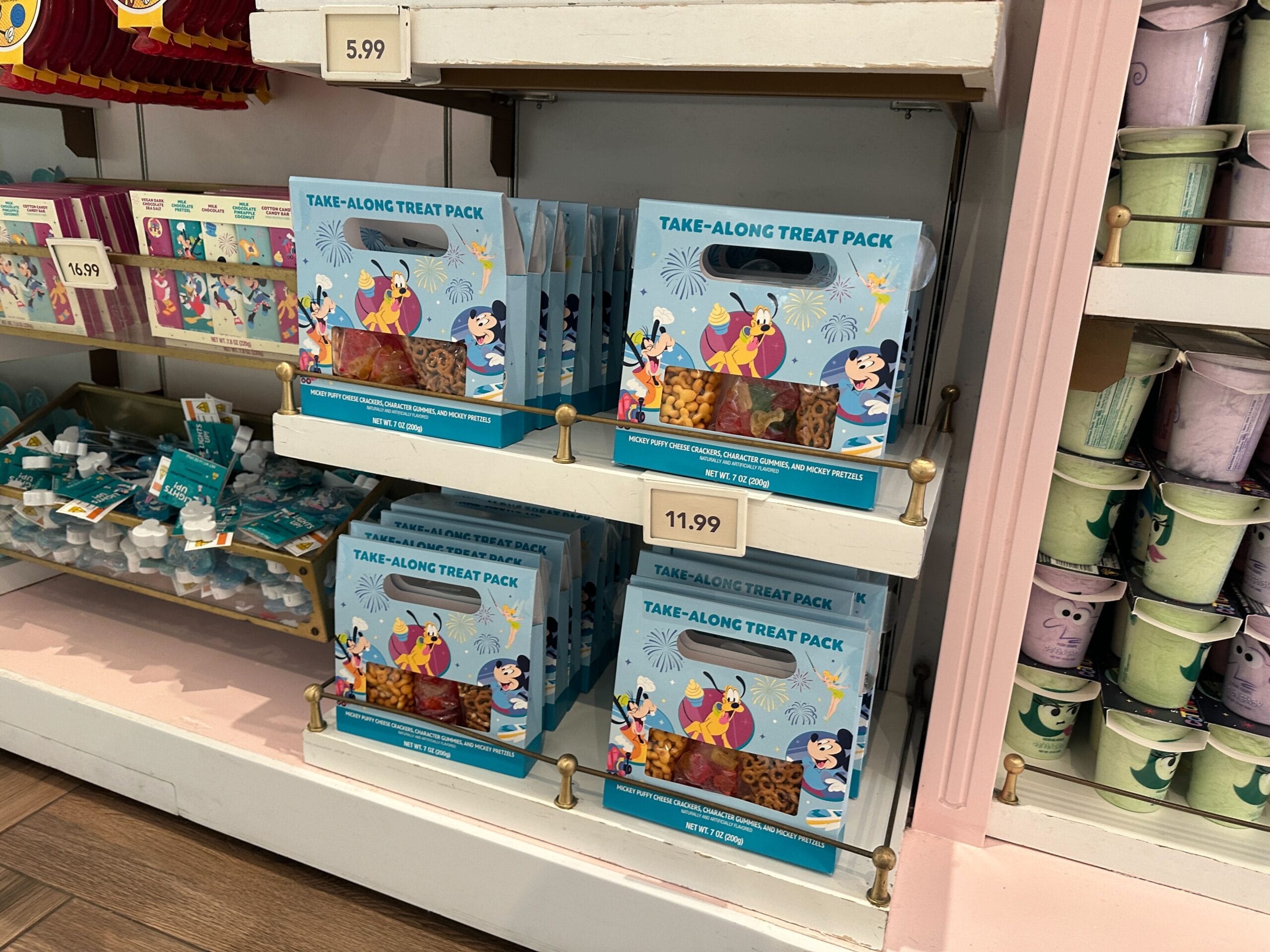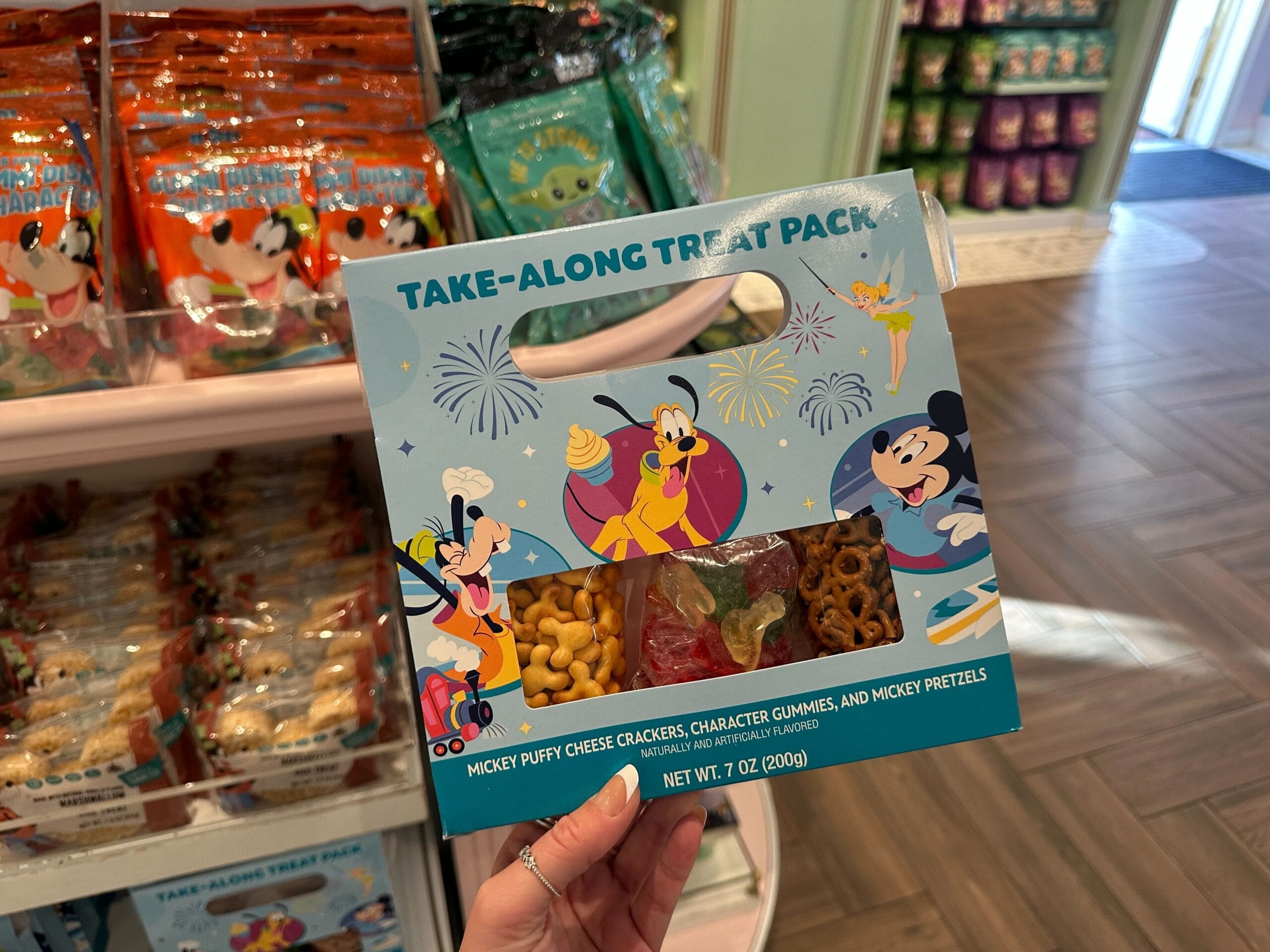 Mickey, Pluto, and Goofy are in circles around the castle. Chip ‘n’ Dale are pictured eating popcorn. Tink is above the castle.