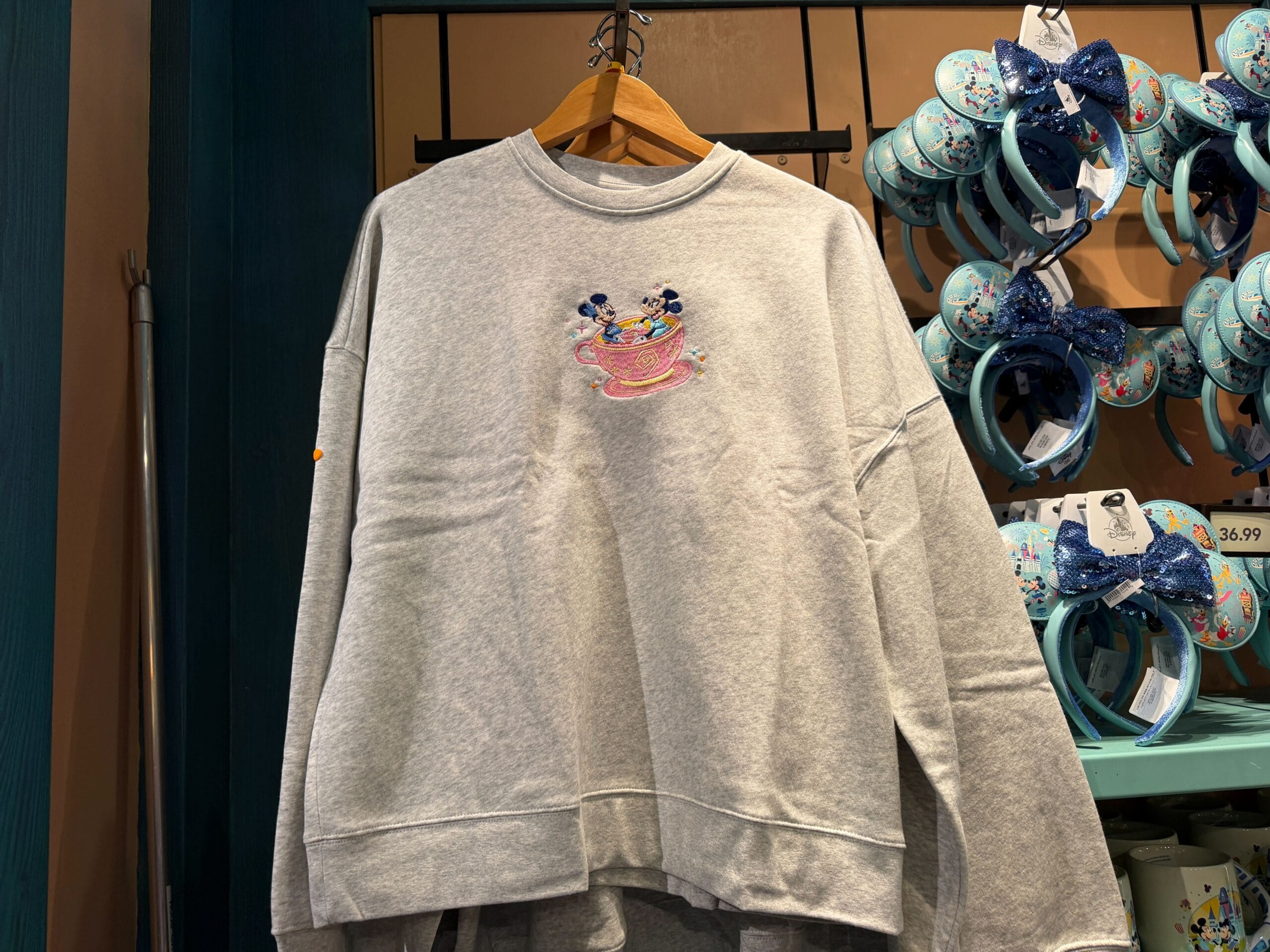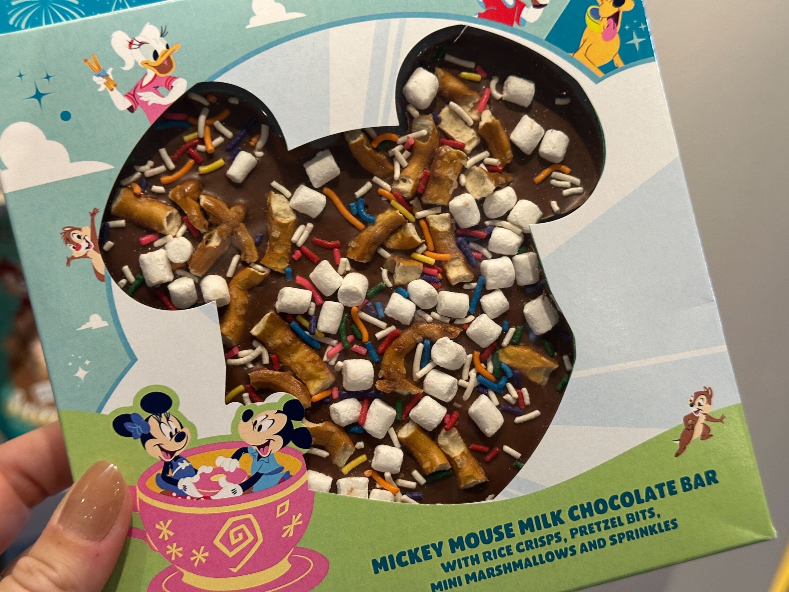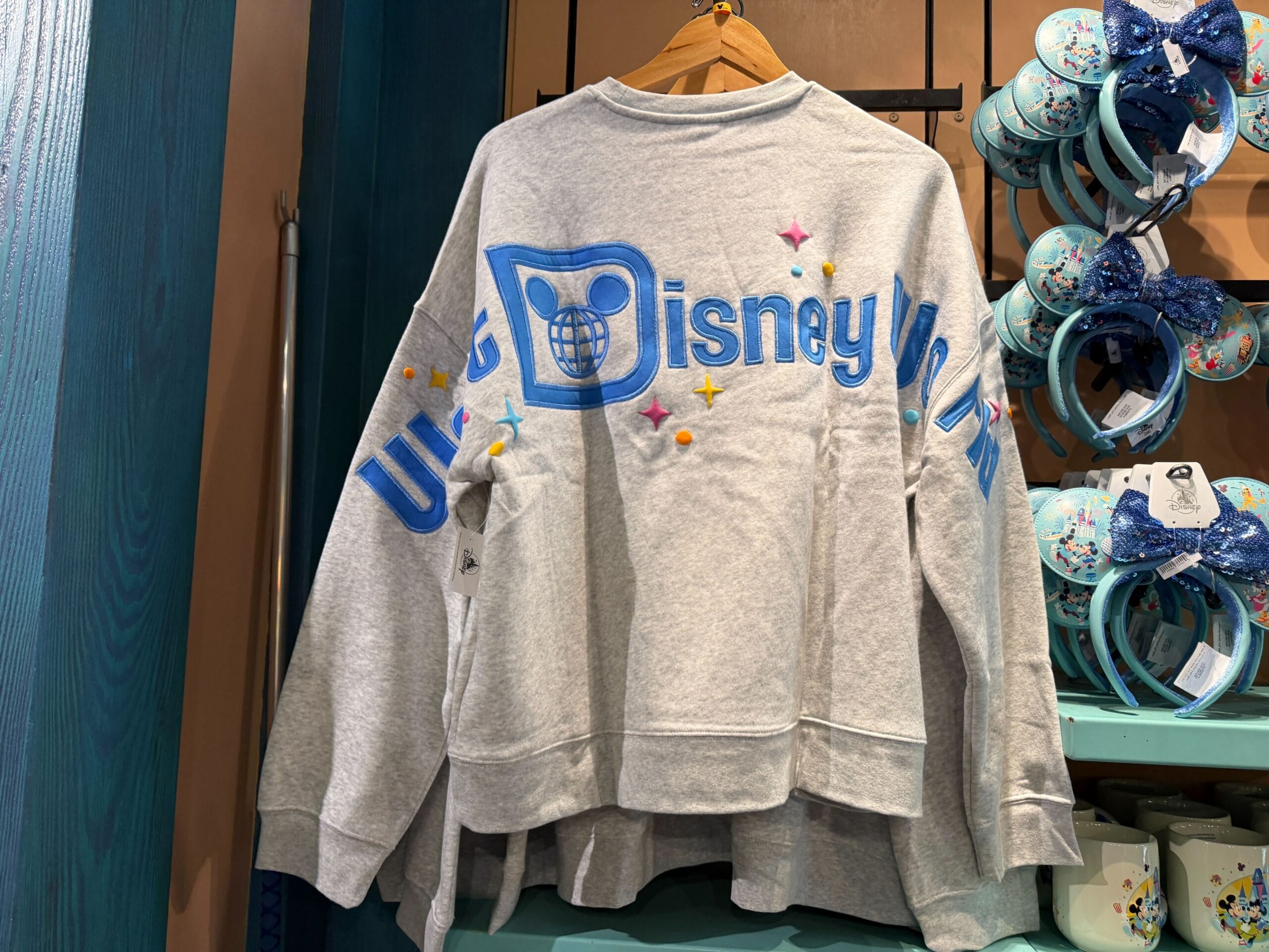 The bracelet is the same aqua color as the ears. It’s covered in images of Mickey and friends, snacks, icons, and phrases.