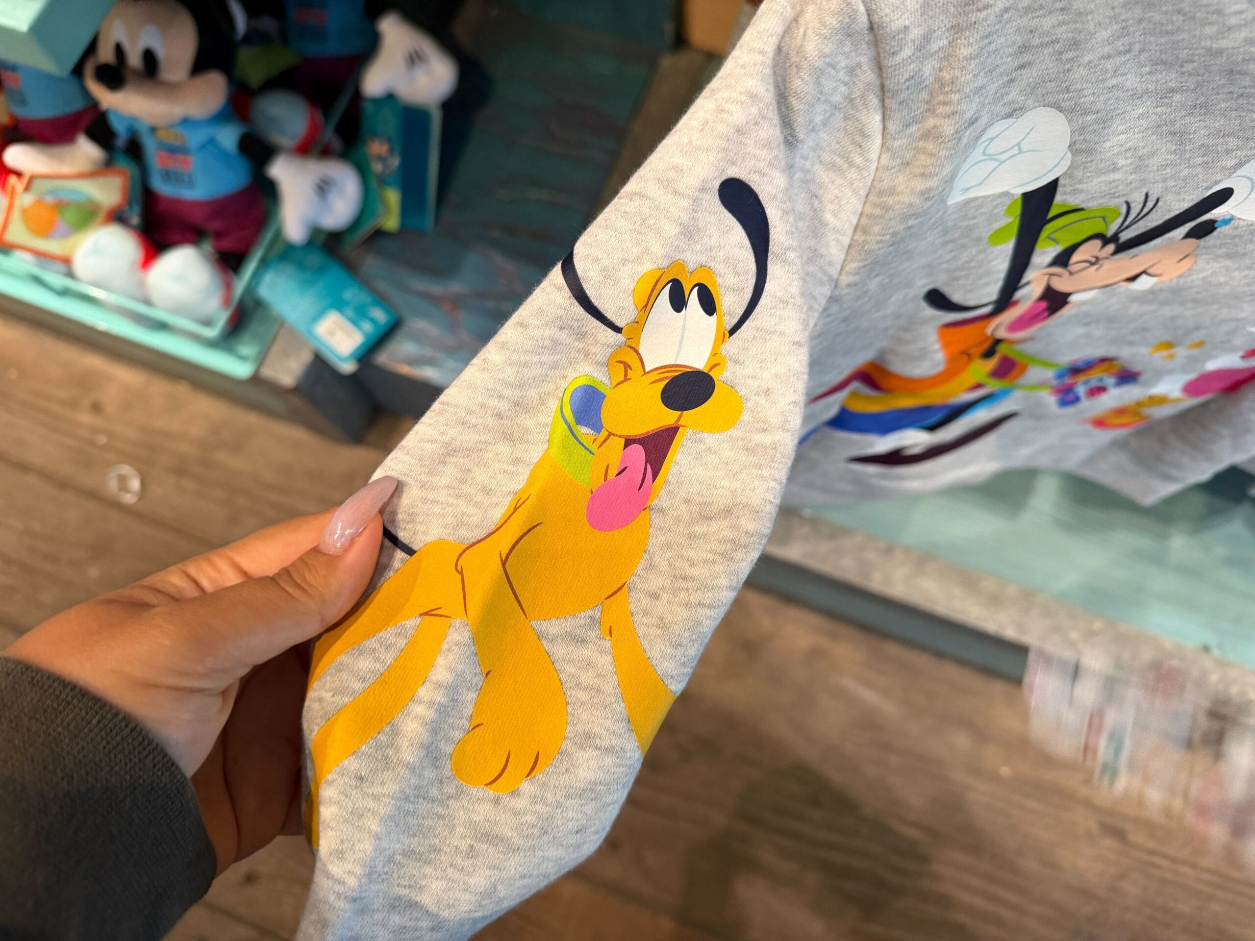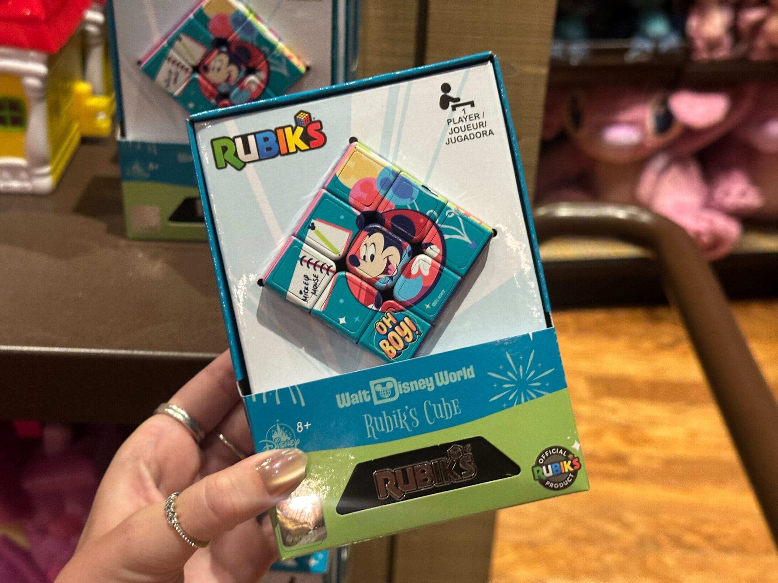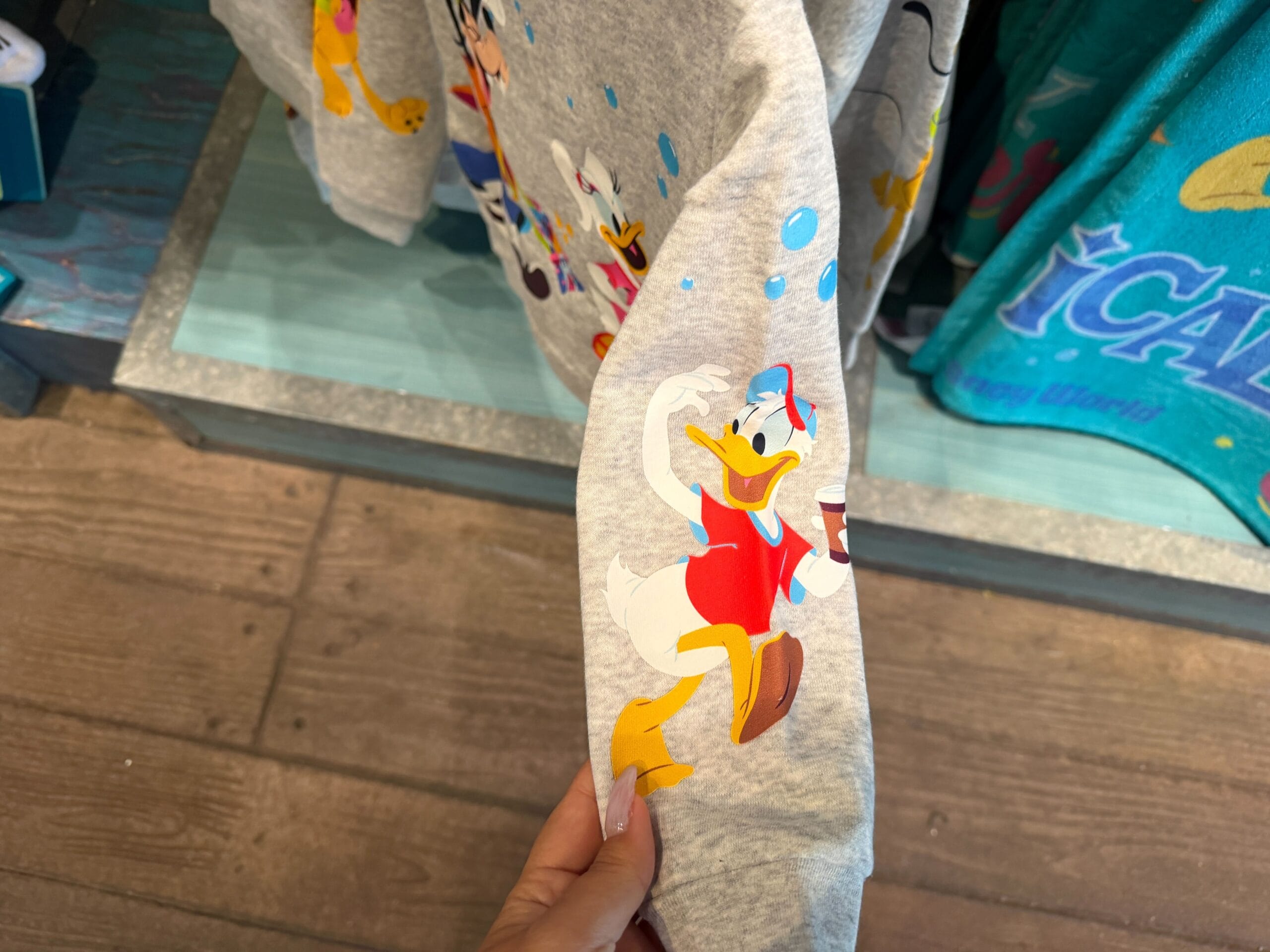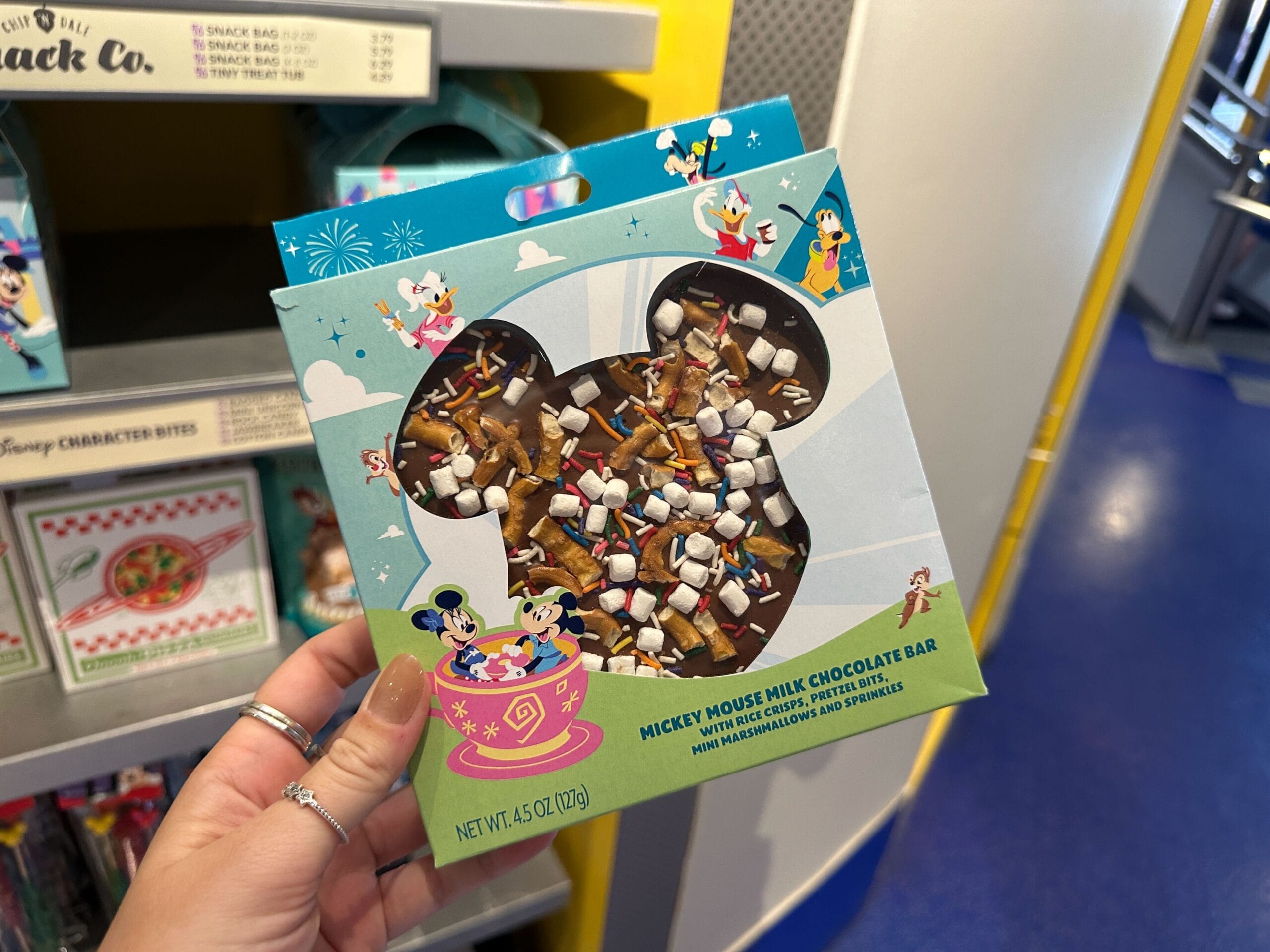 The bracelet is the same aqua color as the ears. It’s covered in images of Mickey and friends, snacks, icons, and phrases.