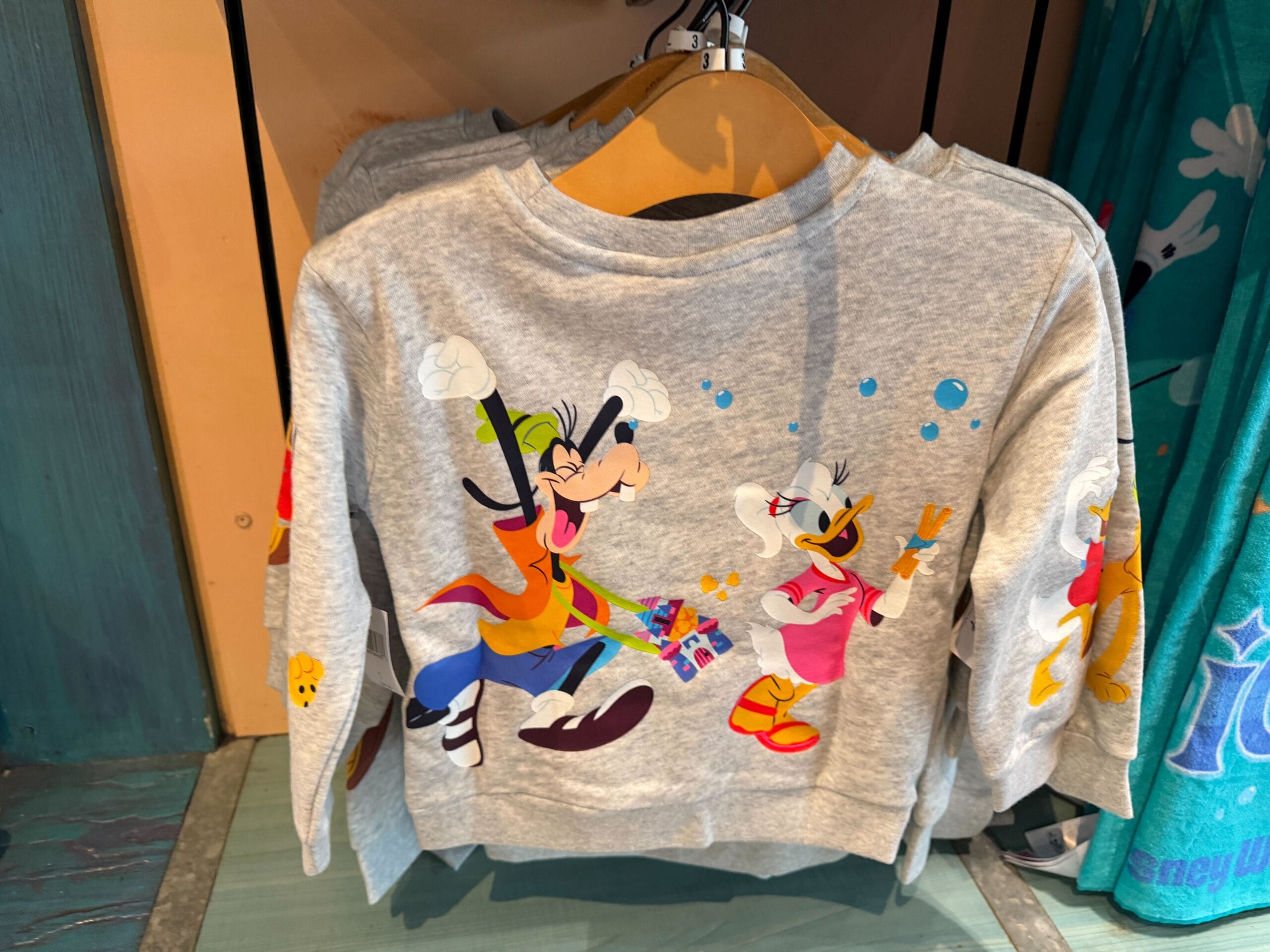 This aqua-colored windbreaker is patterned with Disney Parks icons, logos, and phrases. Cinderella Castle, Spaceship Earth, Tree of Life, and Tower of Terror are pictured alongside Space Mountain and TRON Lightcycle Run. There are trains, Mickey bars, ear hats, Goofy hats, drums, and tea cups.