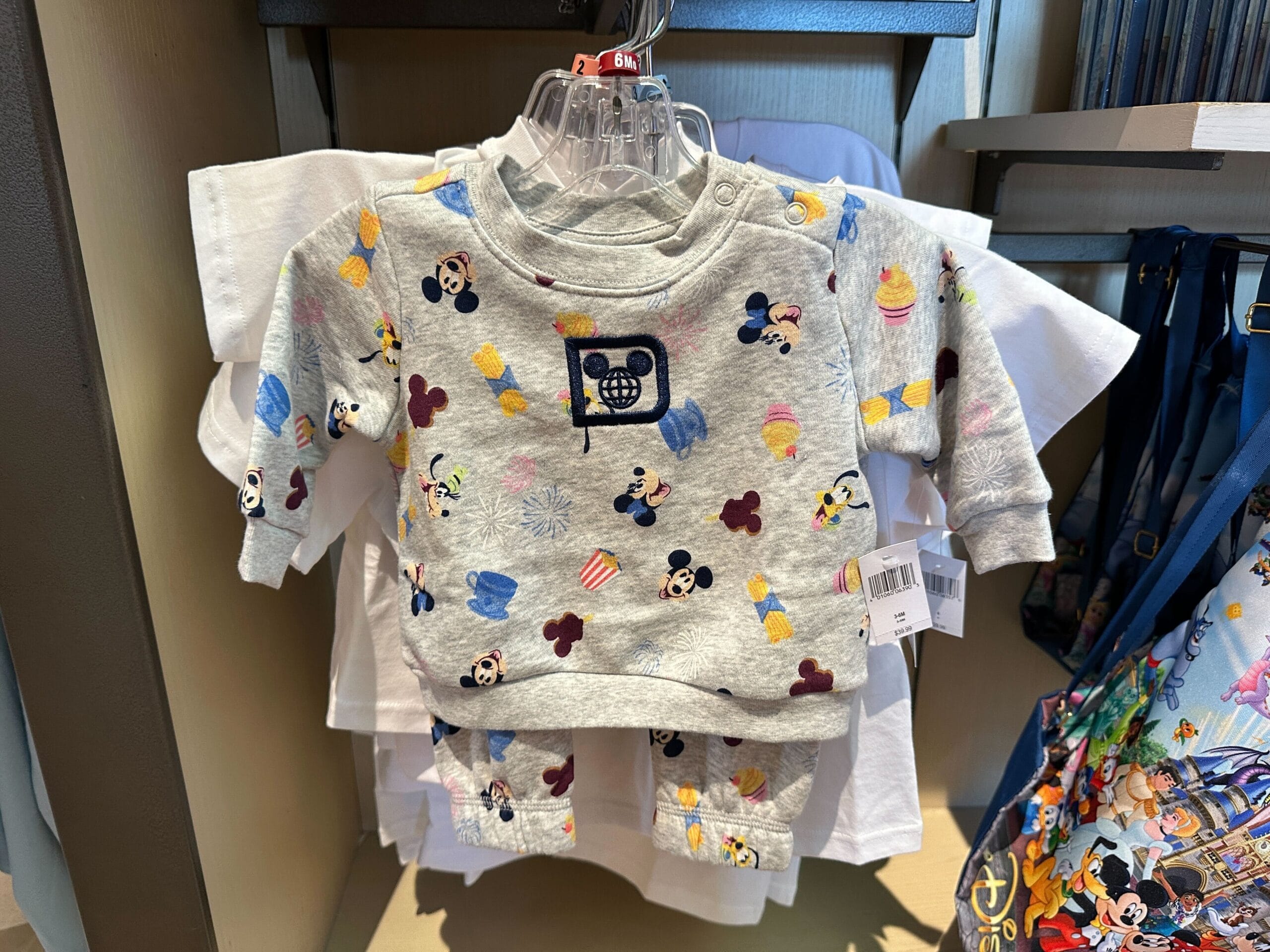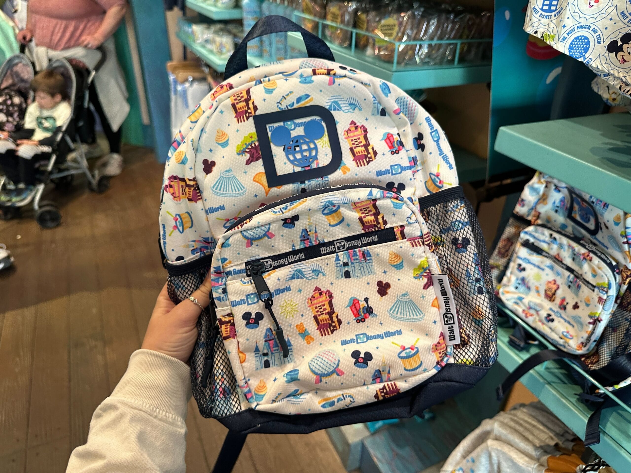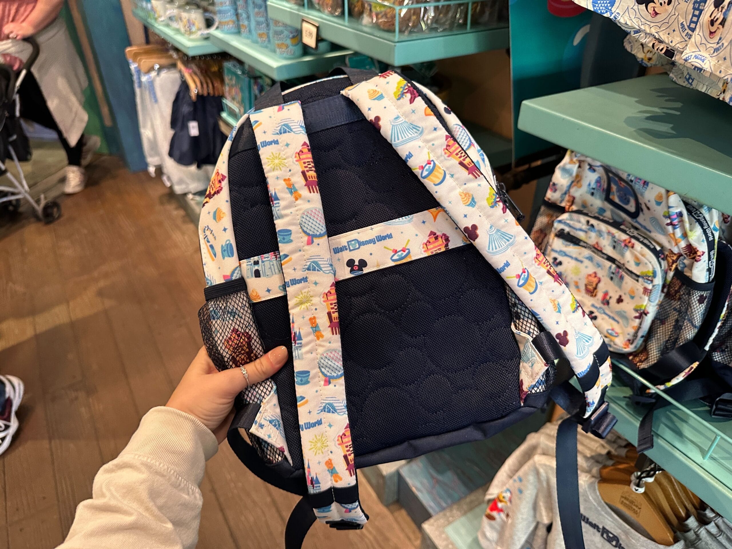 Similar to the windbreaker, this small backpack also has an all-over pattern of Disney World Resort iconography. This includes ear hats, Space Mountain, Spaceship Earth, and the Tree of Life.