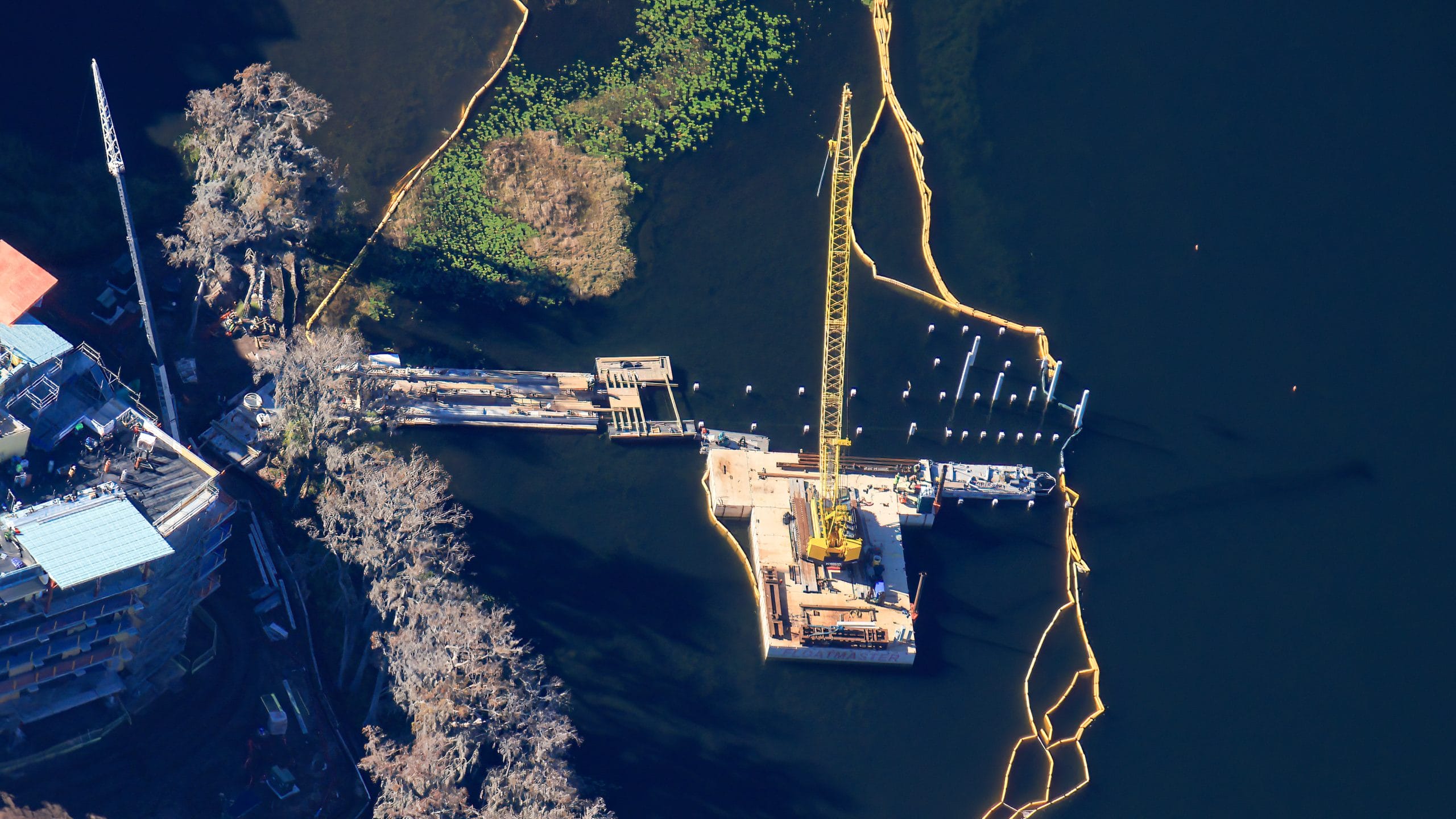 A crane still sits on a Floatmaster in the water with a dock under construction in the lake. Currently, the “dock” is mainly just supports in the water. Some structure is starting to appear nearest land.