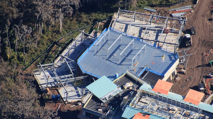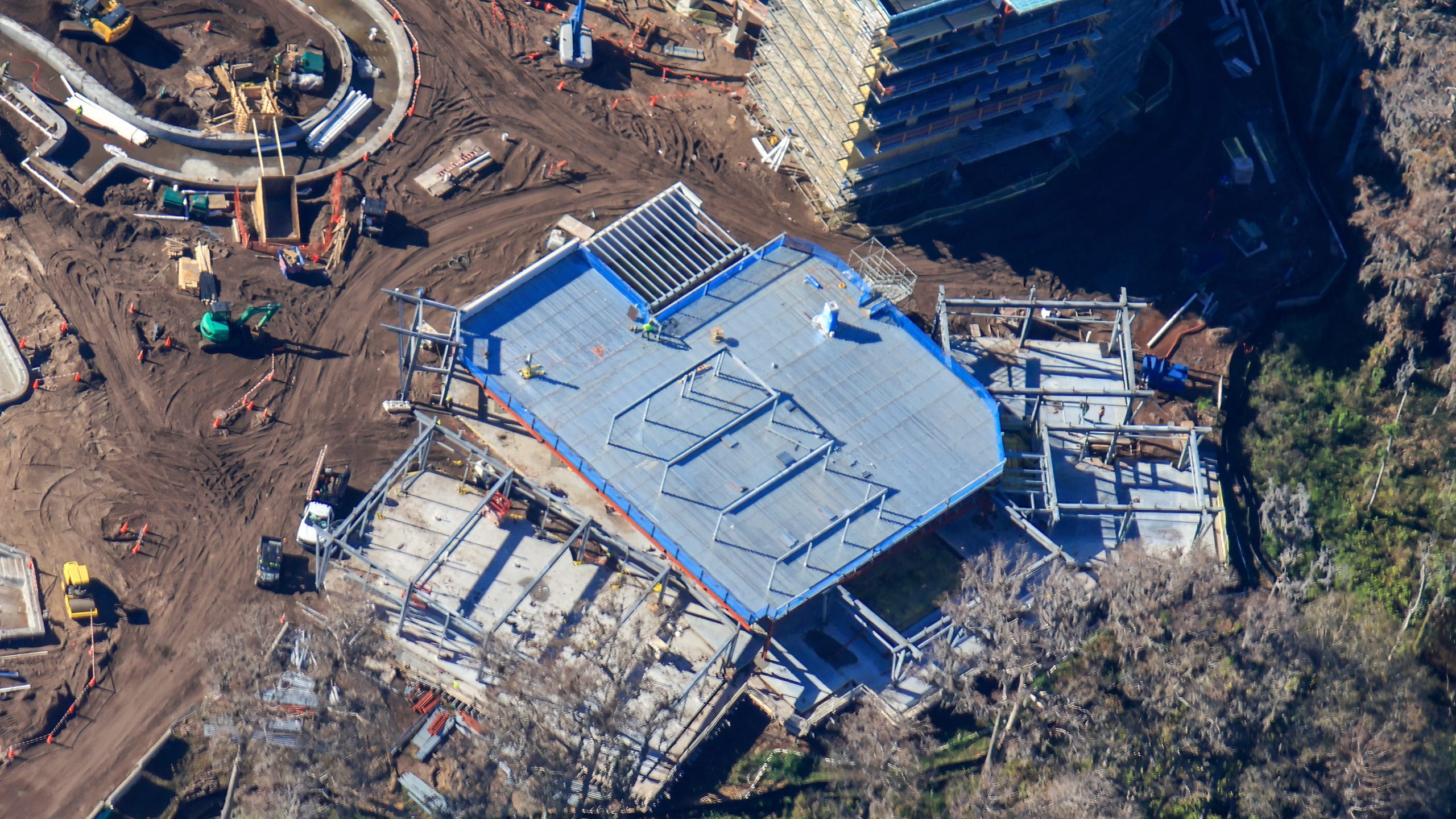 Near the lakeshore, the building believed to be lakefront bar or restaurant now has roofing and additional steel structures around the perimeter. These might be for covered outdoor seating. When the resort was first announced, it was marketed as a Princess and the Frog-inspired location set to be a full-on, standalone table service restaurant on Bay Lake. However, not that plans for the resort have changed, this may not be the case.
