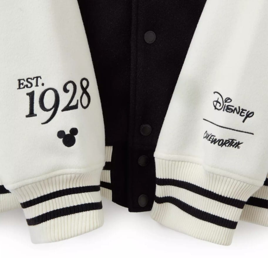 The Cakeworthy varsity jacket has an embroidered Mickey face appliqué on the chest. On the back, there are big, bold Mickey Mouse and “The Original” appliqués.