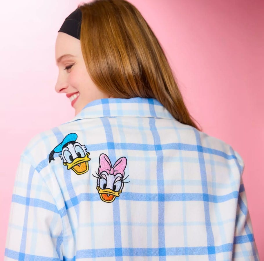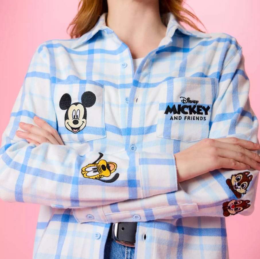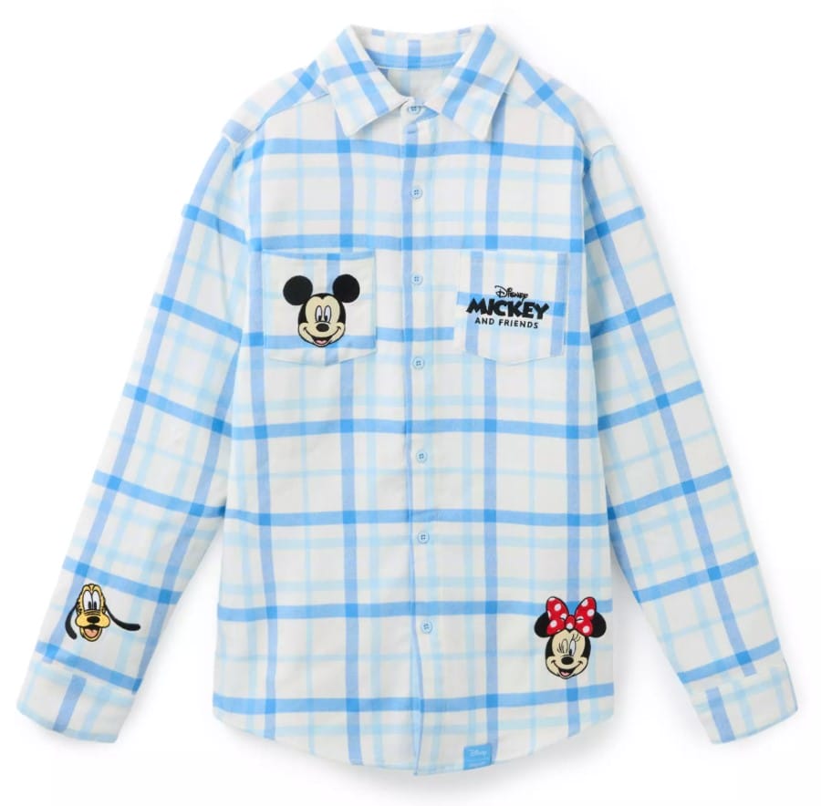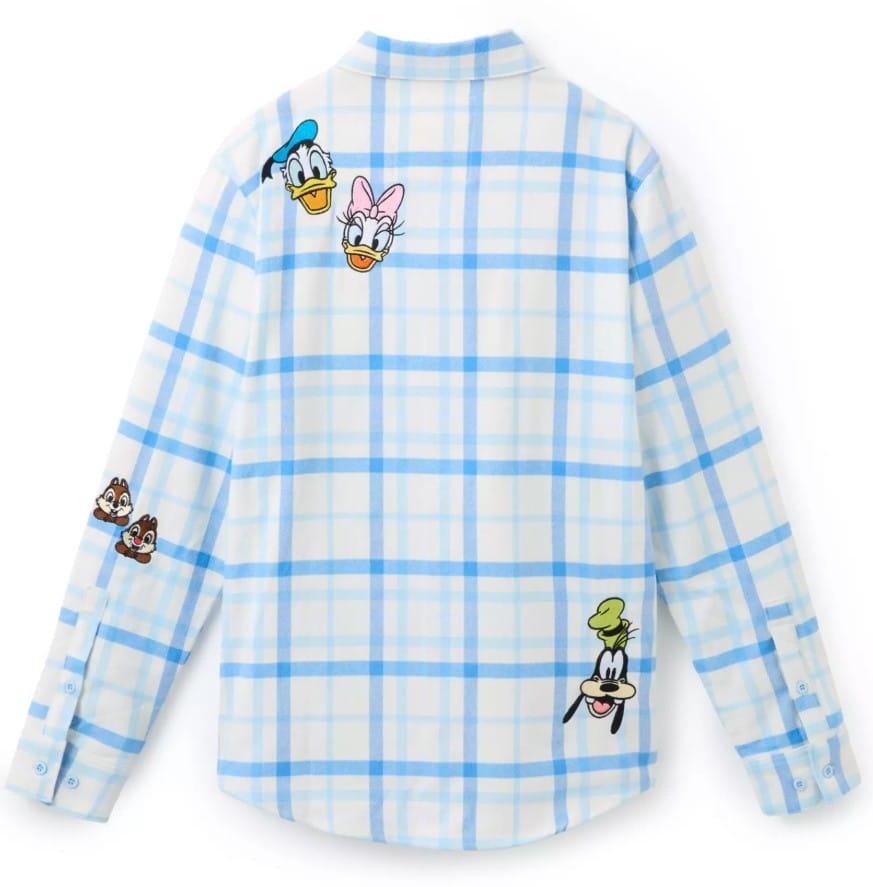 The soft pastel flannel shirt by Cakeworthy is in a Disney Store-exclusive blue colorway. It has embroidered appliqués featuring Mickey, Minnie, Donald, Daisy, Pluto, Goofy and Chip n’ Dale on the front and back.