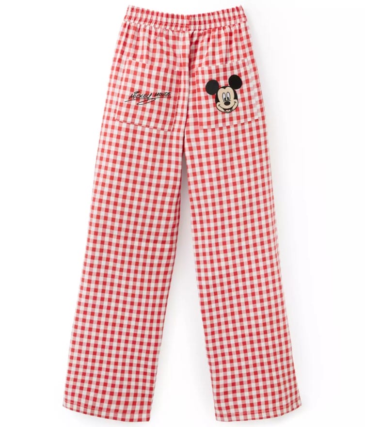 These red and white gingham lounge pants are made of a soft, stretchy fabric and are accented with Mickey Mouse screen art on the front leg. An embroidered Mickey face and signature details are placed on the back pockets.