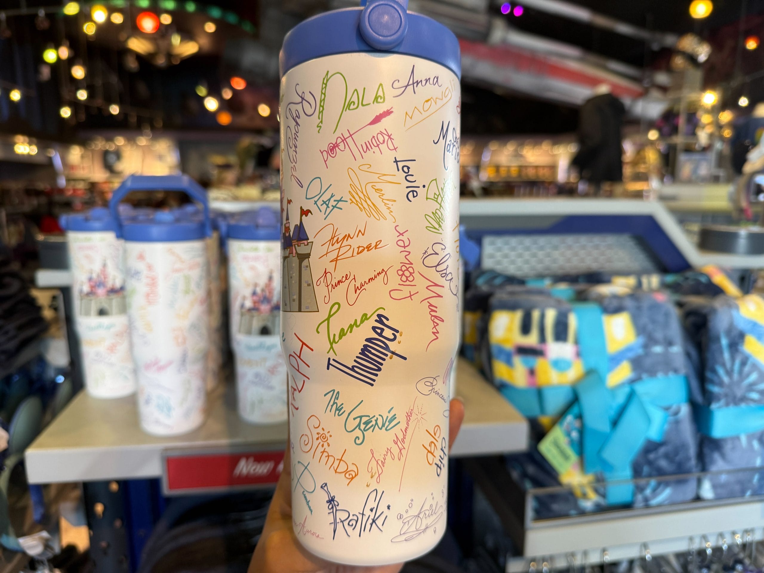 The tumbler is white but covered in colorful character autographs. On one side is Sleeping Beauty Castle.