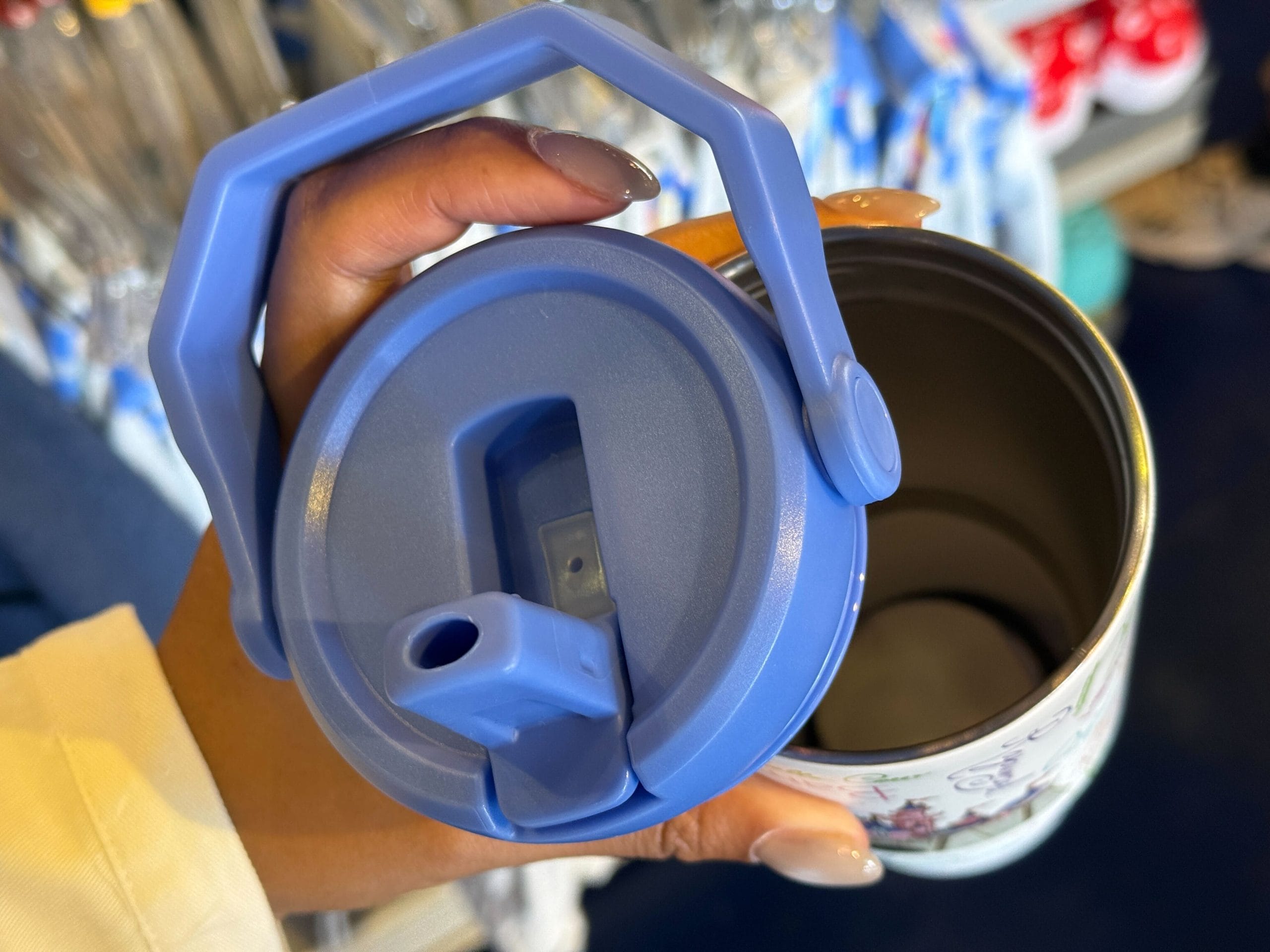It has a blue twist-off lid with a handle and a built-in straw. The tumbler is not dishwasher-safe or microwaveable.