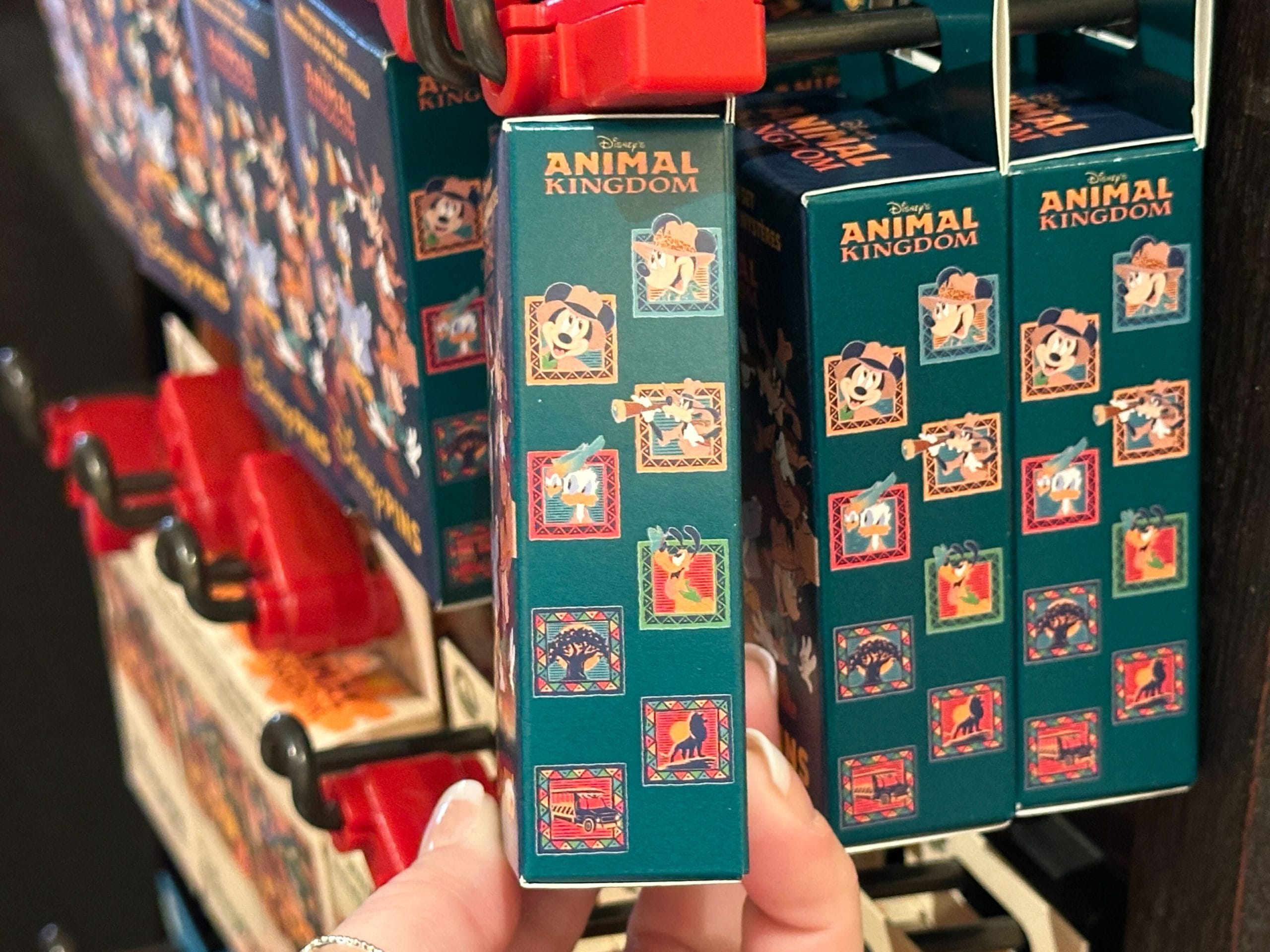 The set matches a new collection of Disney’s Animal Kingdom merchandise featuring Mickey and Friends in safari gear. One box contains one randomly selected pin. There are eight total in the set.
