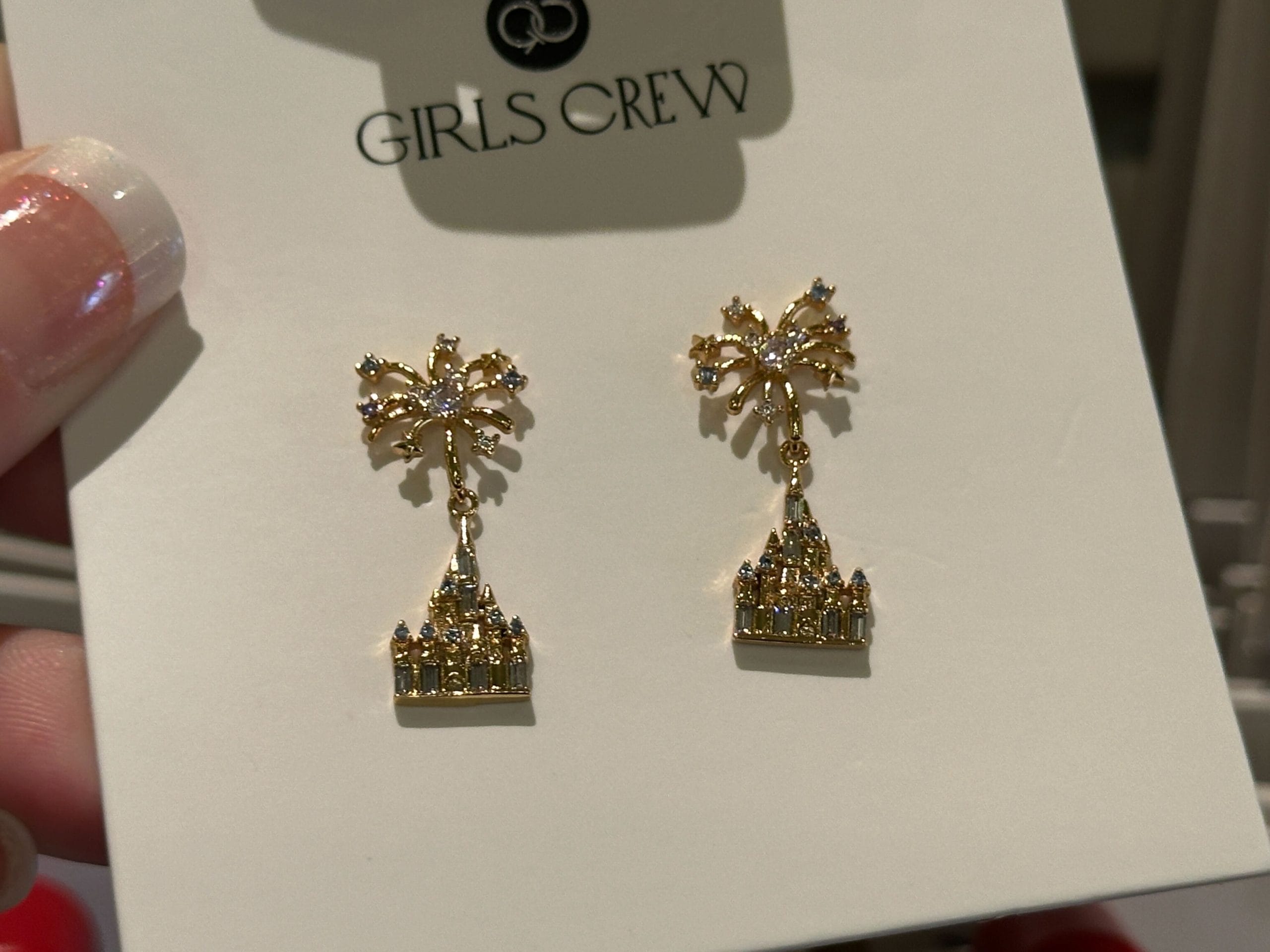 This set of drop earrings each features a castle dangling from an exploding firework. The fireworks have multicolored gems.