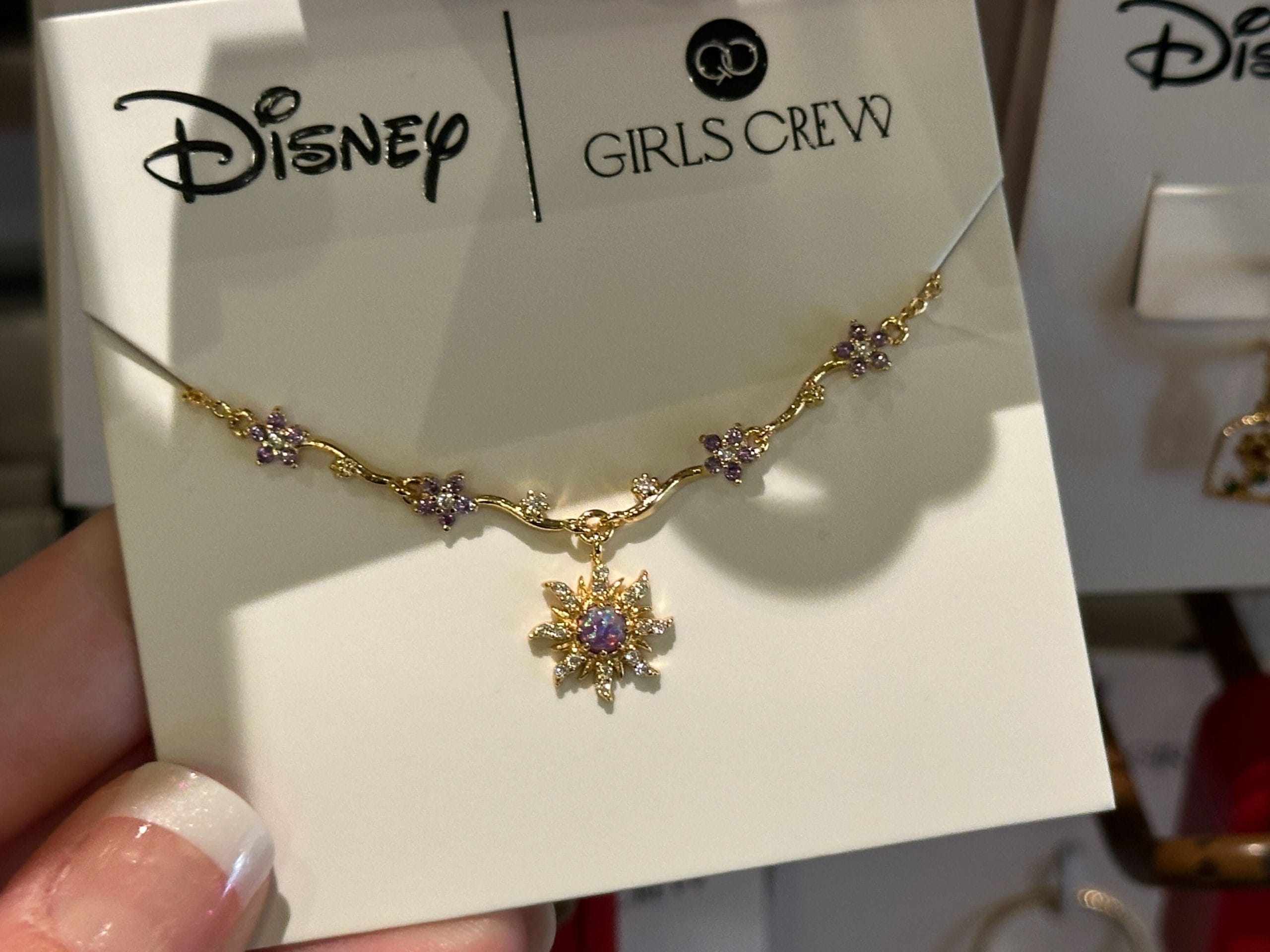 There is also a ‘Tangled’ themed necklace. The necklace has a gold Corona sun pendant, with the center being filled by a large purple gem. The pendant is attached to a gold chain that also has several small purple flowers.