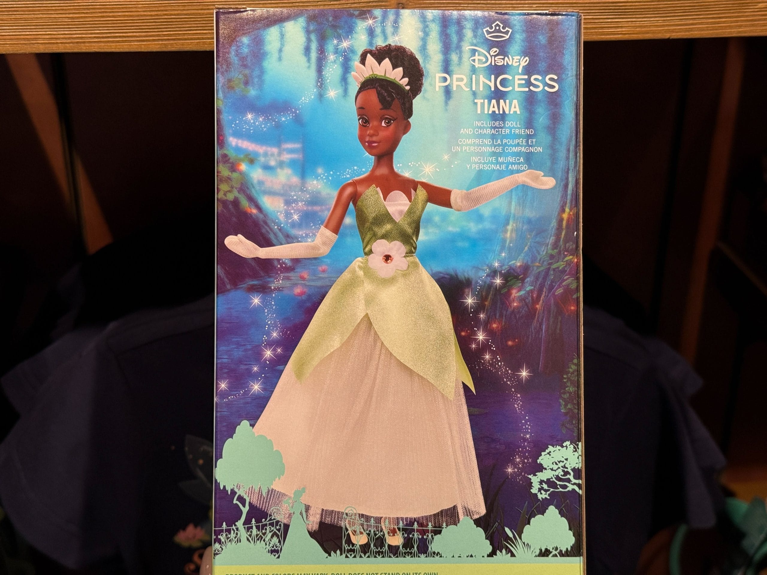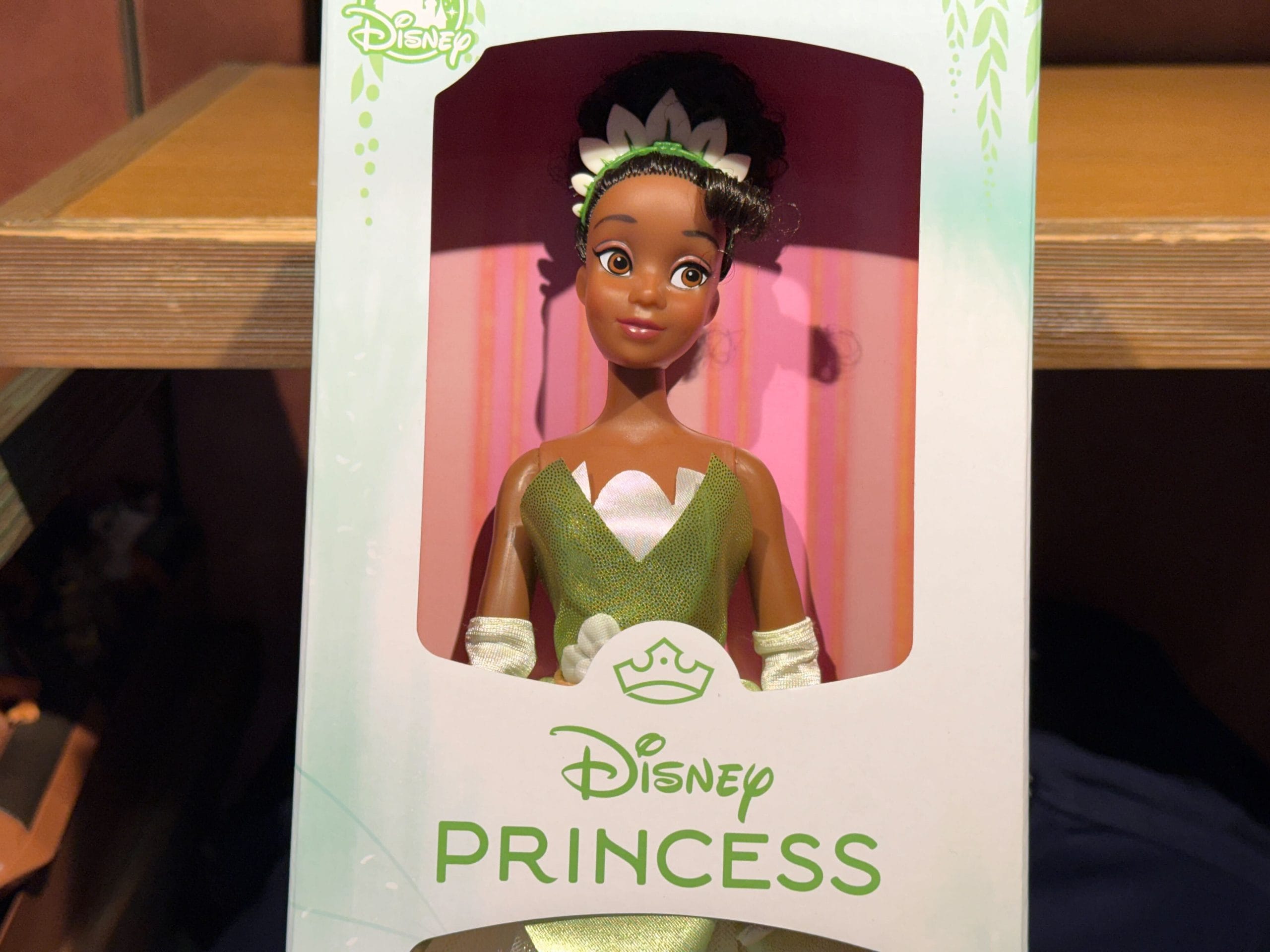This Disney Princess doll features Princess Tiana in her iconic green leaf dress and flower crown. The box art on the back shows how the doll can be posed.