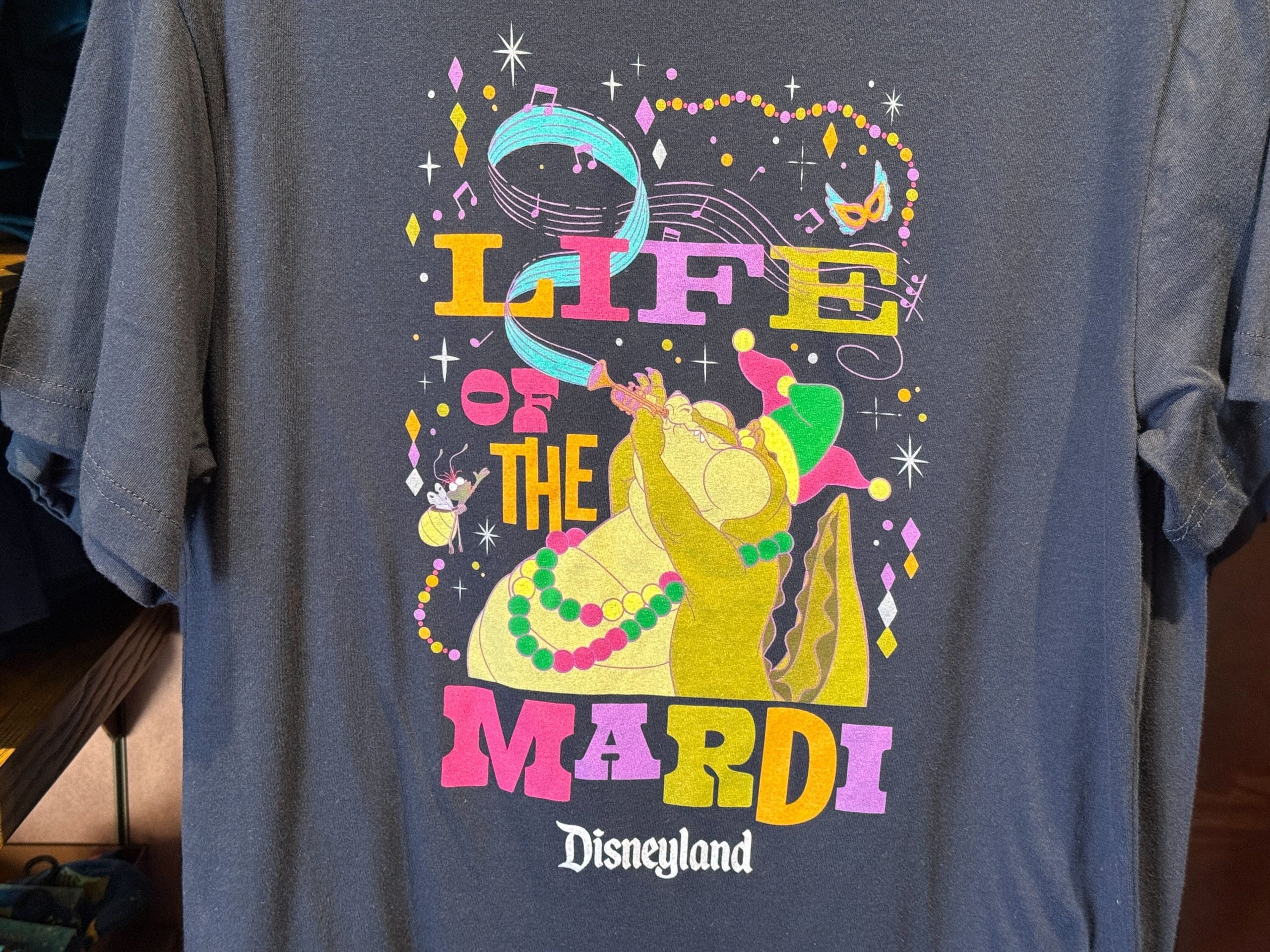 This t-shirt for adults has a colorful design of Louis the alligator playing his trumpet while Ray the firefly and various Mardi Gras beads, masks, and stars surround him. The shirt displays the text “Life of the Mardi” – a play on the phrase “Life of the Party.”