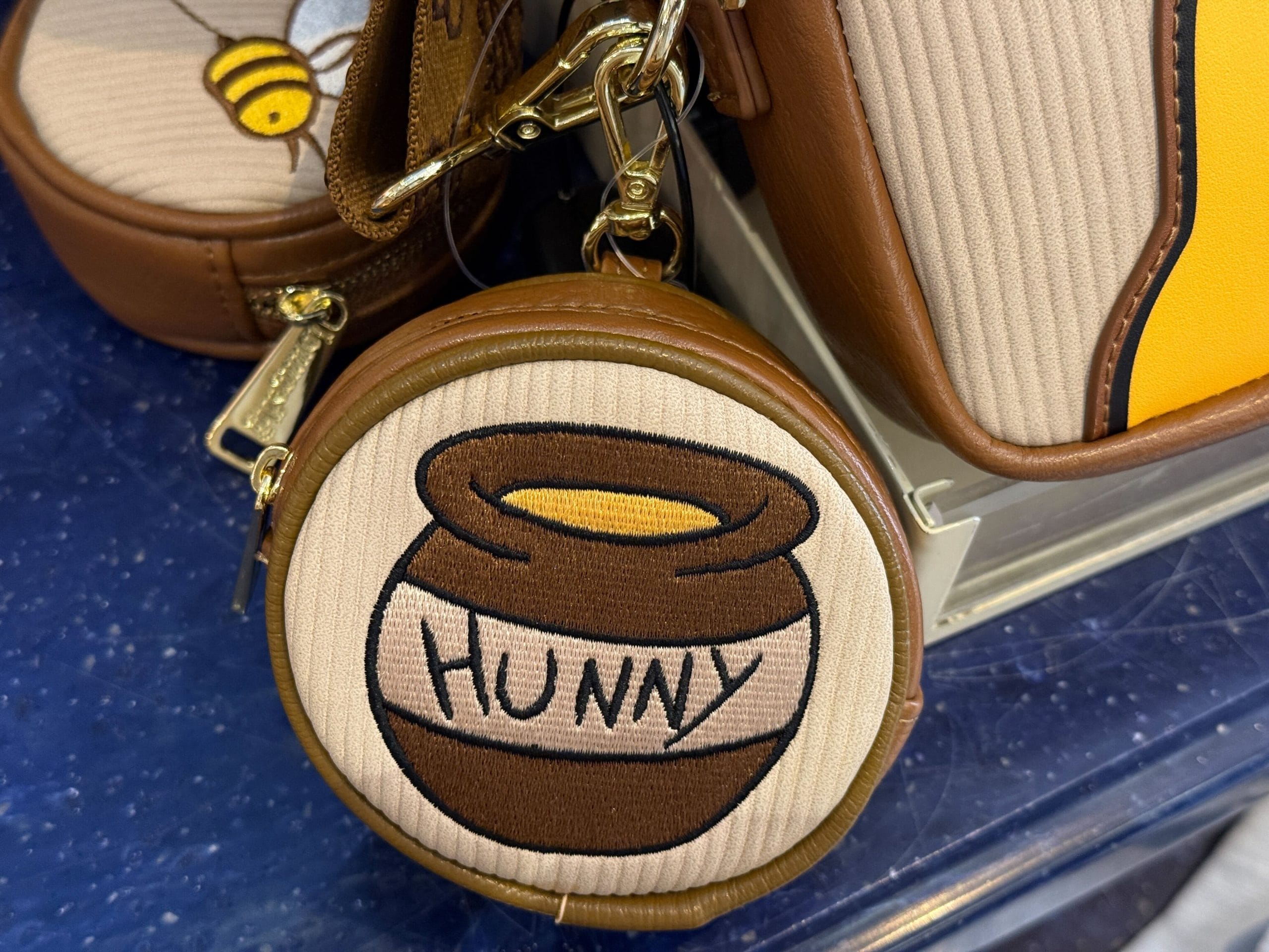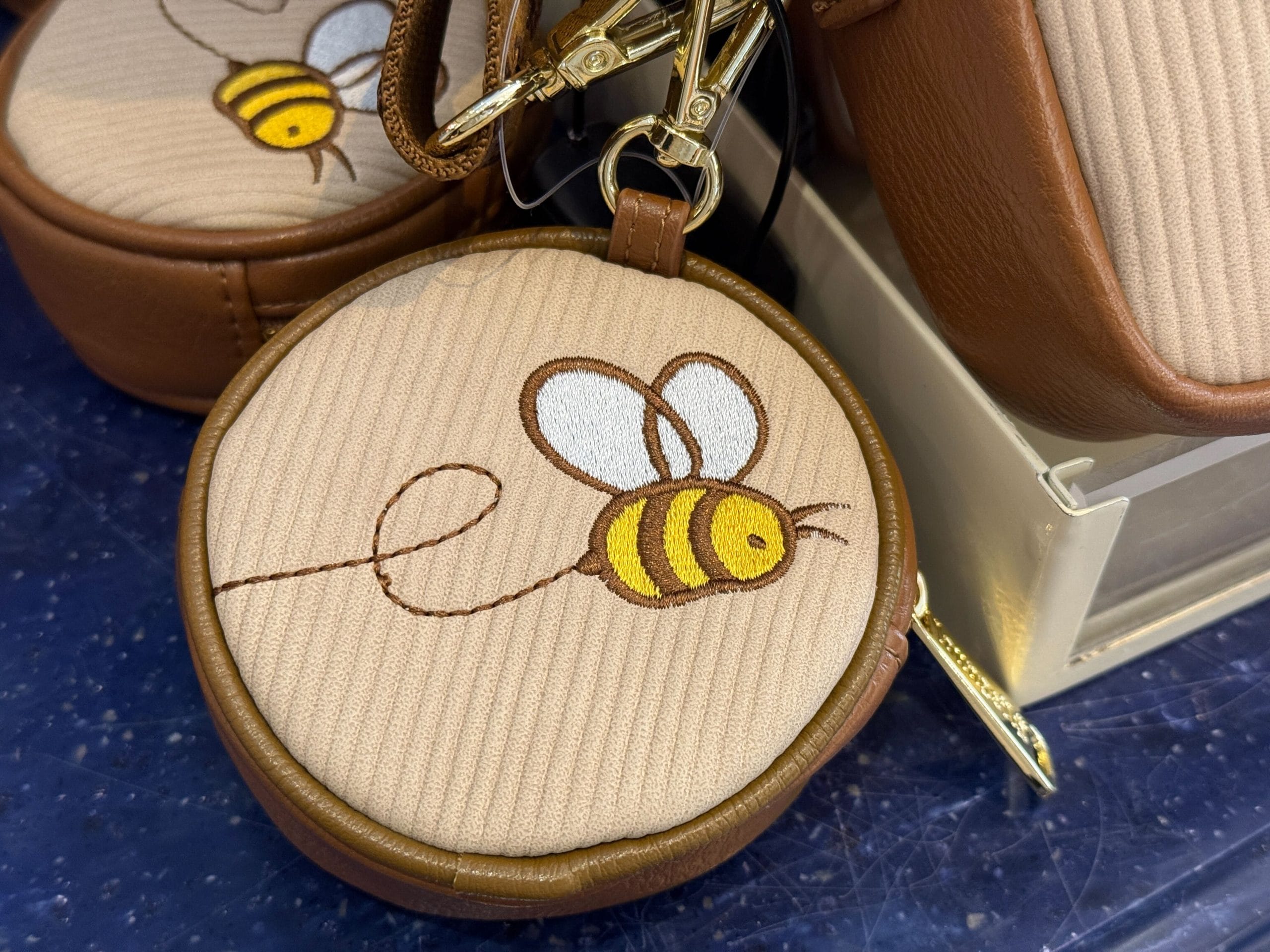 The attached coin purse has an embroidered bee on one side and a brown “hunny” pot on the other.
