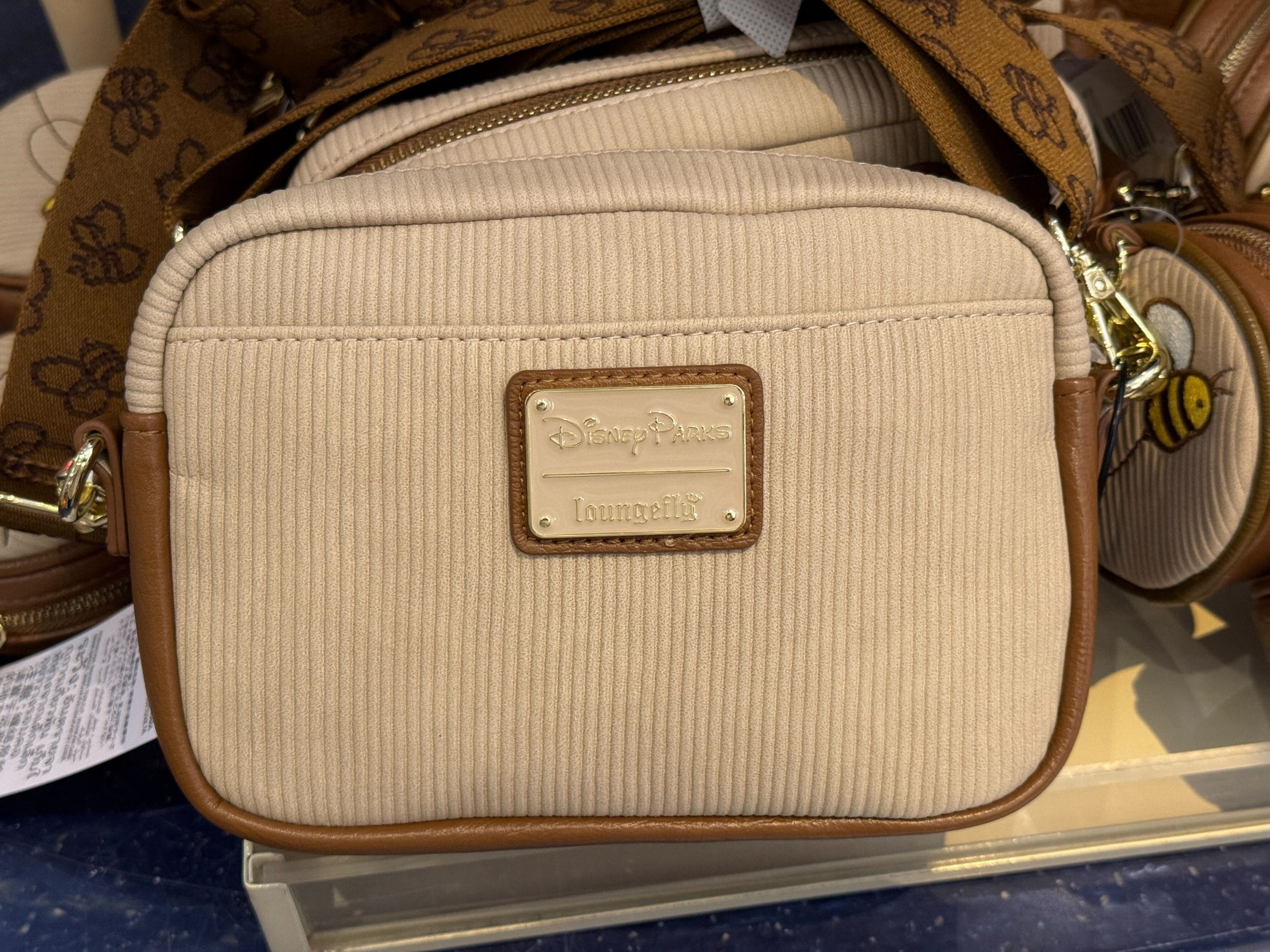 This Loungefly crossbody bag has a light brown ribbed exterior with brown leather trim. Winnie the Pooh is peeking up from the bottom of the bag. There is also a gold Loungefly icon in the corner on the front of the bag.