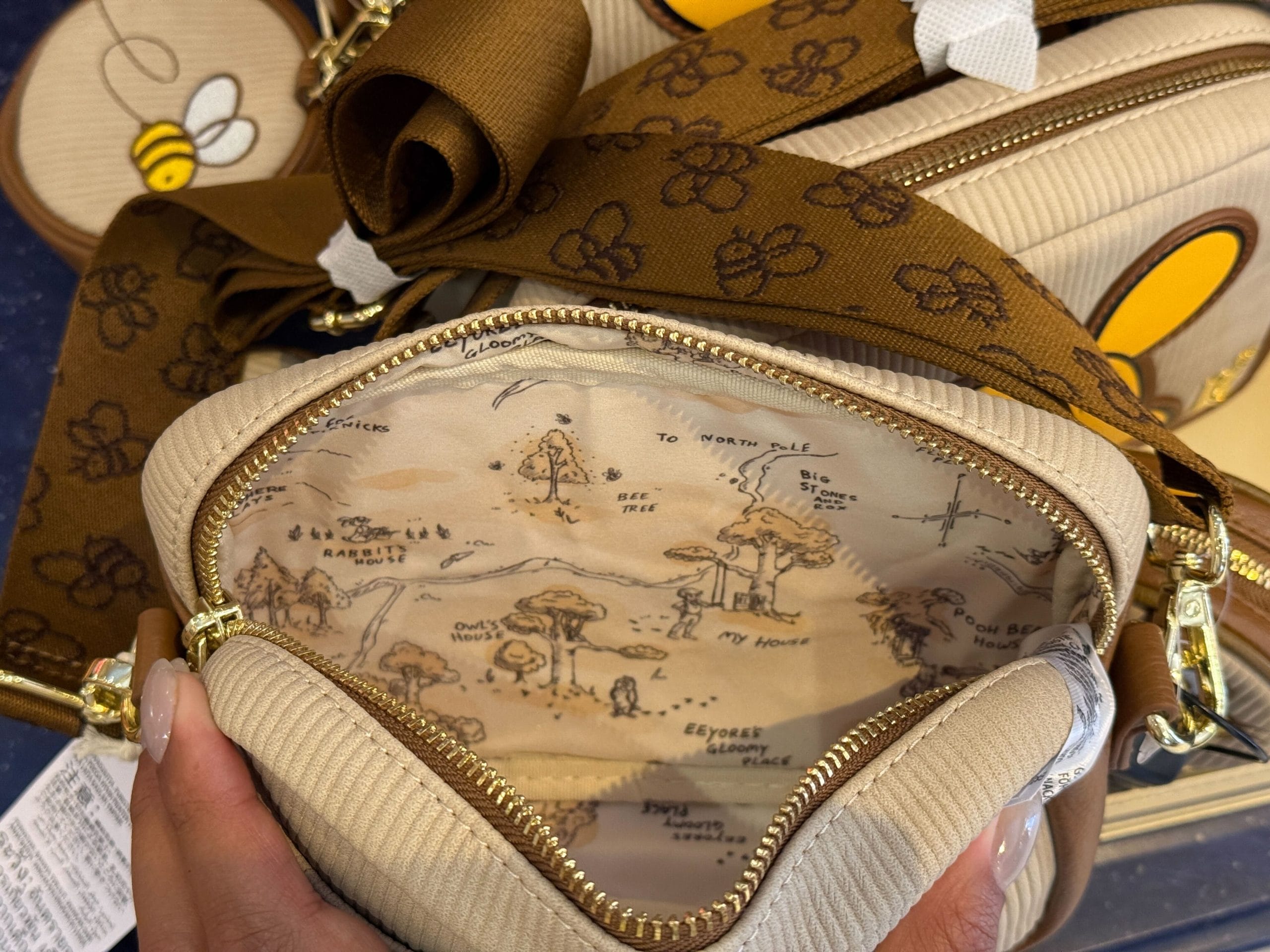 The back of the bag has a Disney Parks x Loungefly badge, and the bag can be opened to reveal the Hundred Acre Wood map lining.