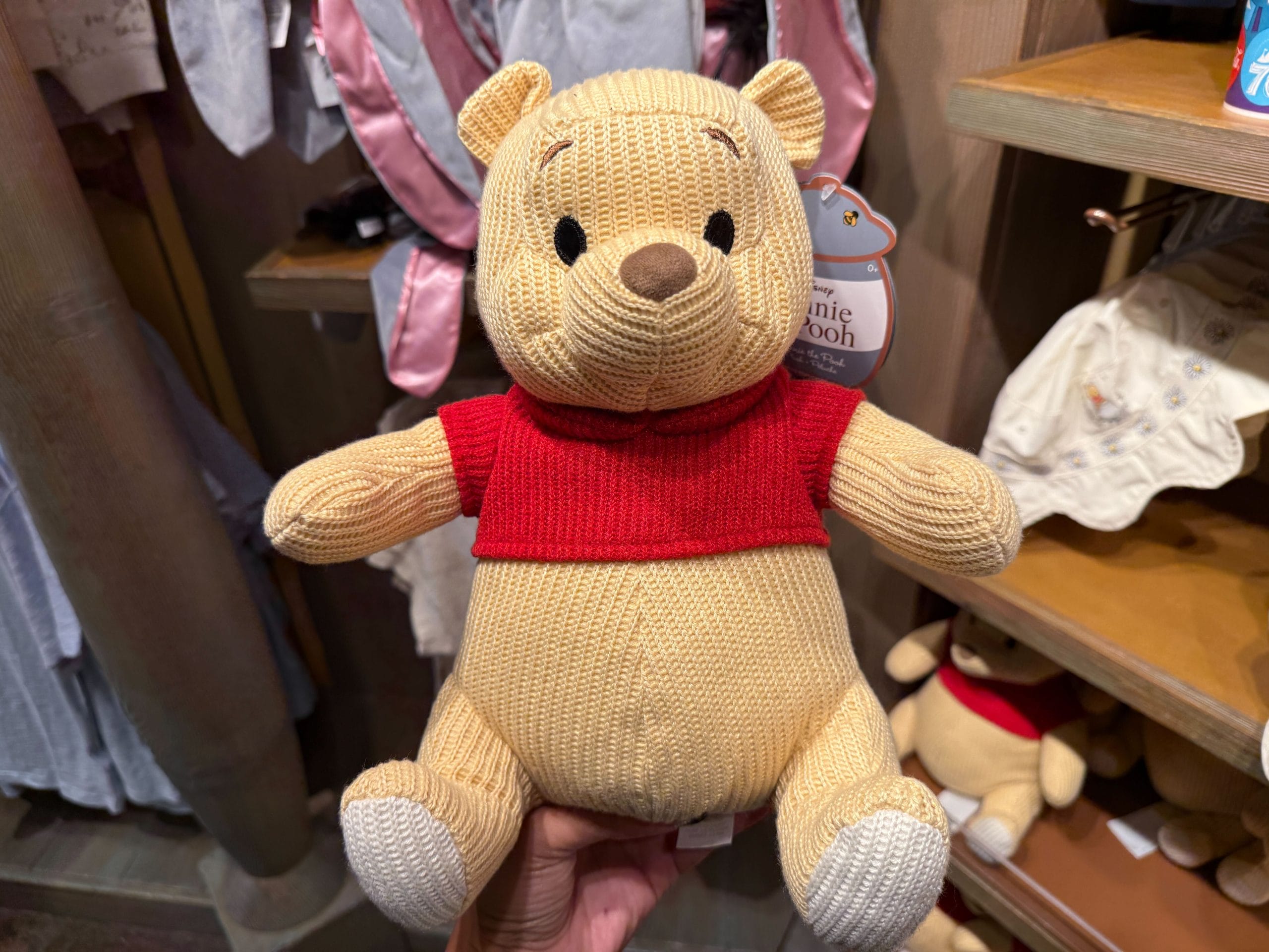 This plush Winnie the Pooh has an all-over knitted texture. He is wearing his signature red shirt, and the pads of his feet are white.