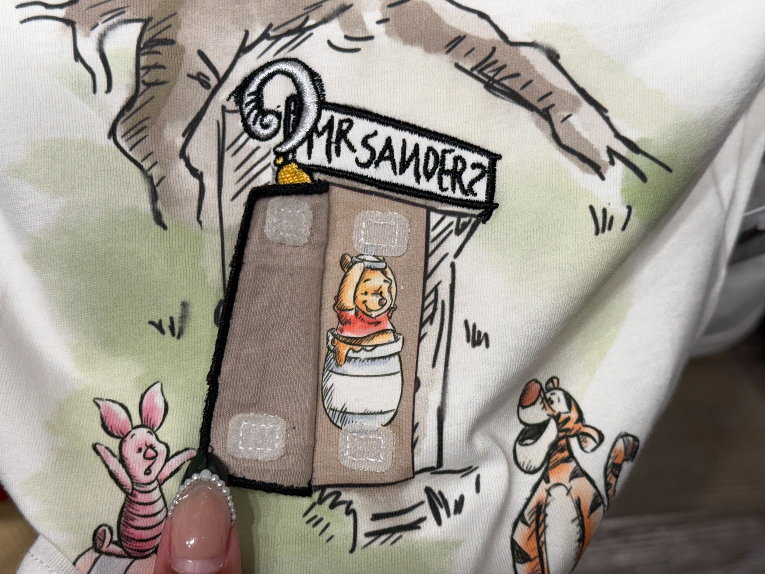This white youth shirt features the front of Winnie the Pooh’s house with Piglet and Tigger next to the entrance. The door to Pooh’s house is attached with Velcro, and opening it reveals Winnie the Pooh in a honey pot.