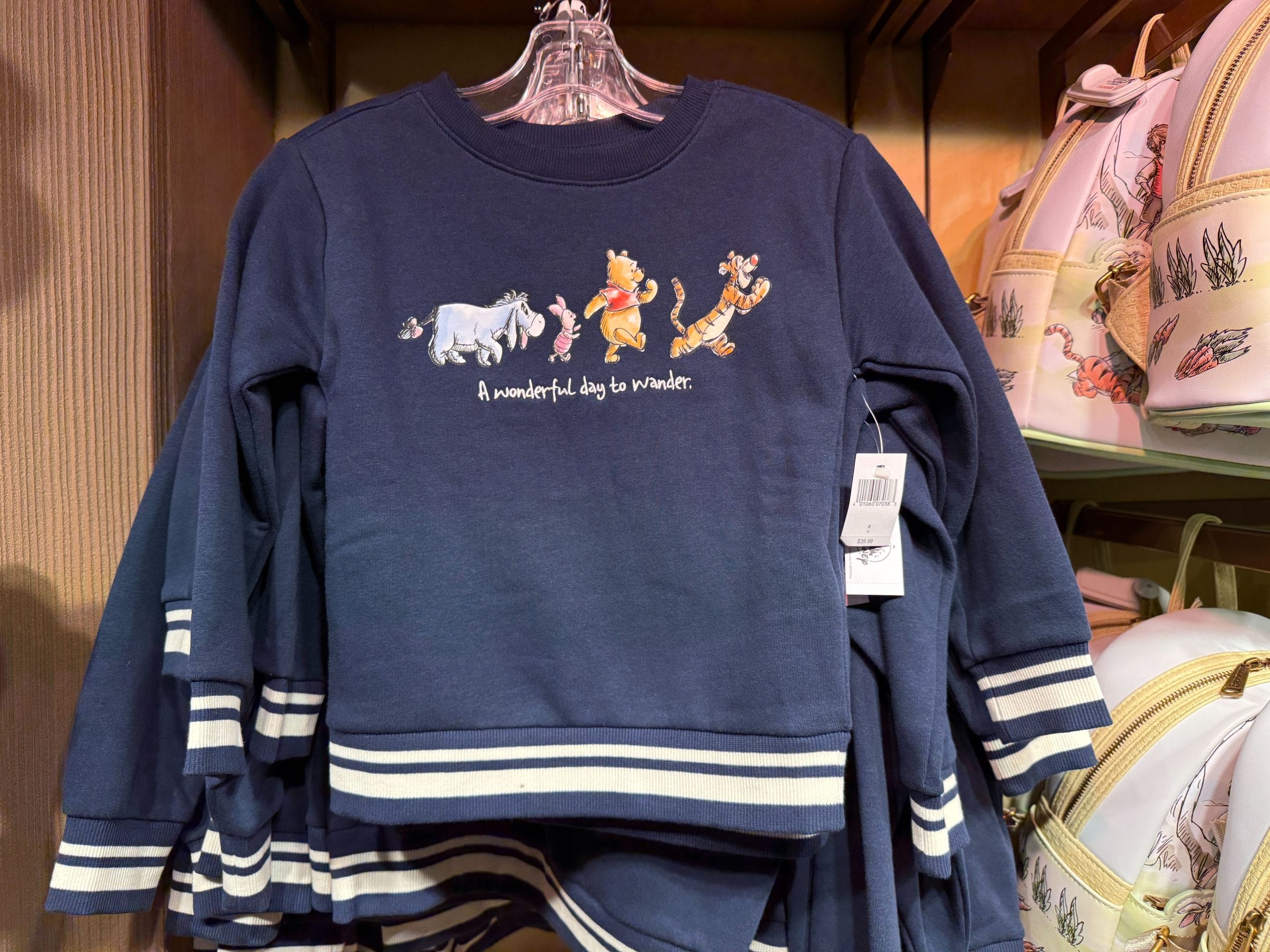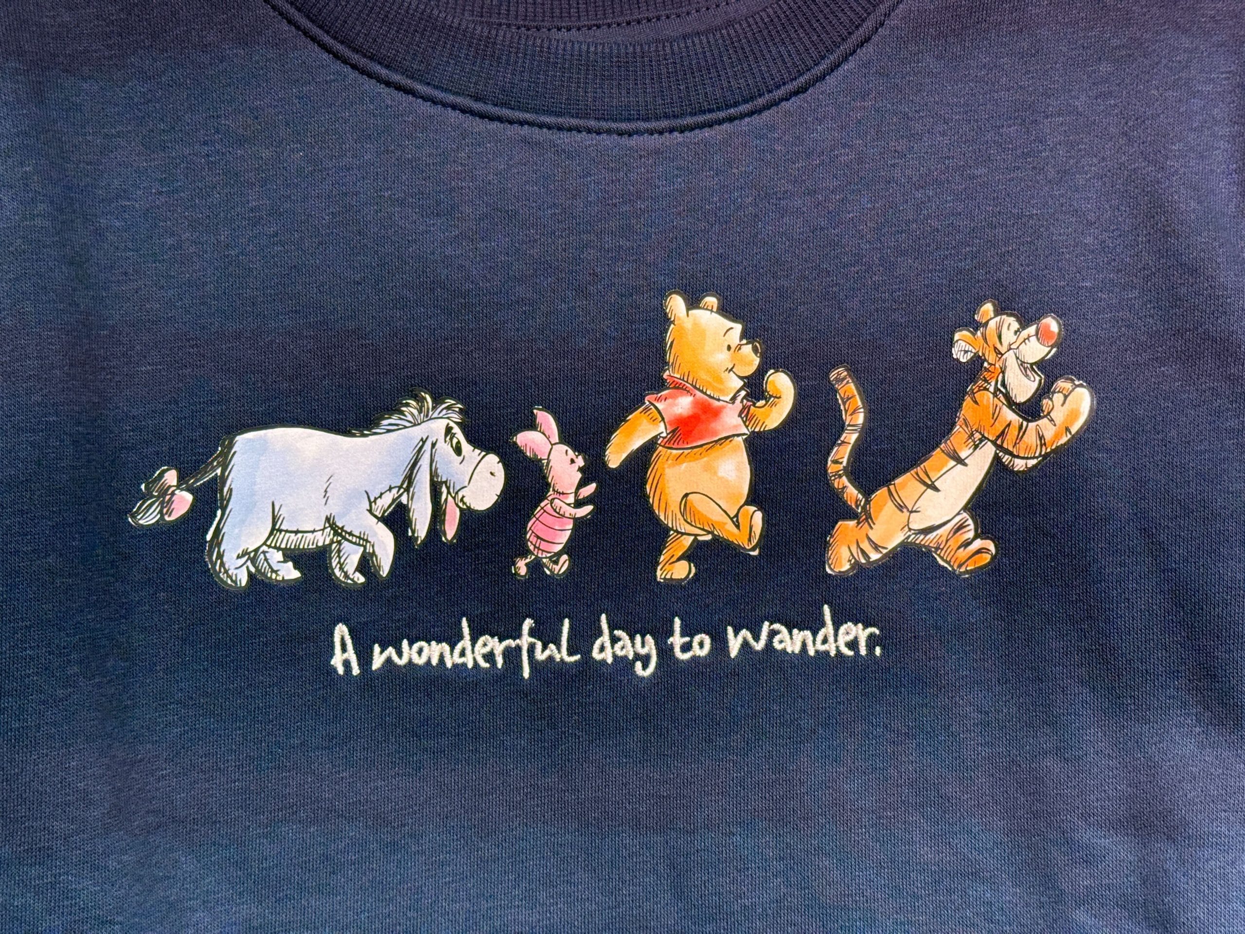 On the front of the sweatshirt, there are decals of Eeyore, Piglet, Winnie the Pooh, and Tigger walking. “A wonderful day to wander” is embroidered in white thread below them.