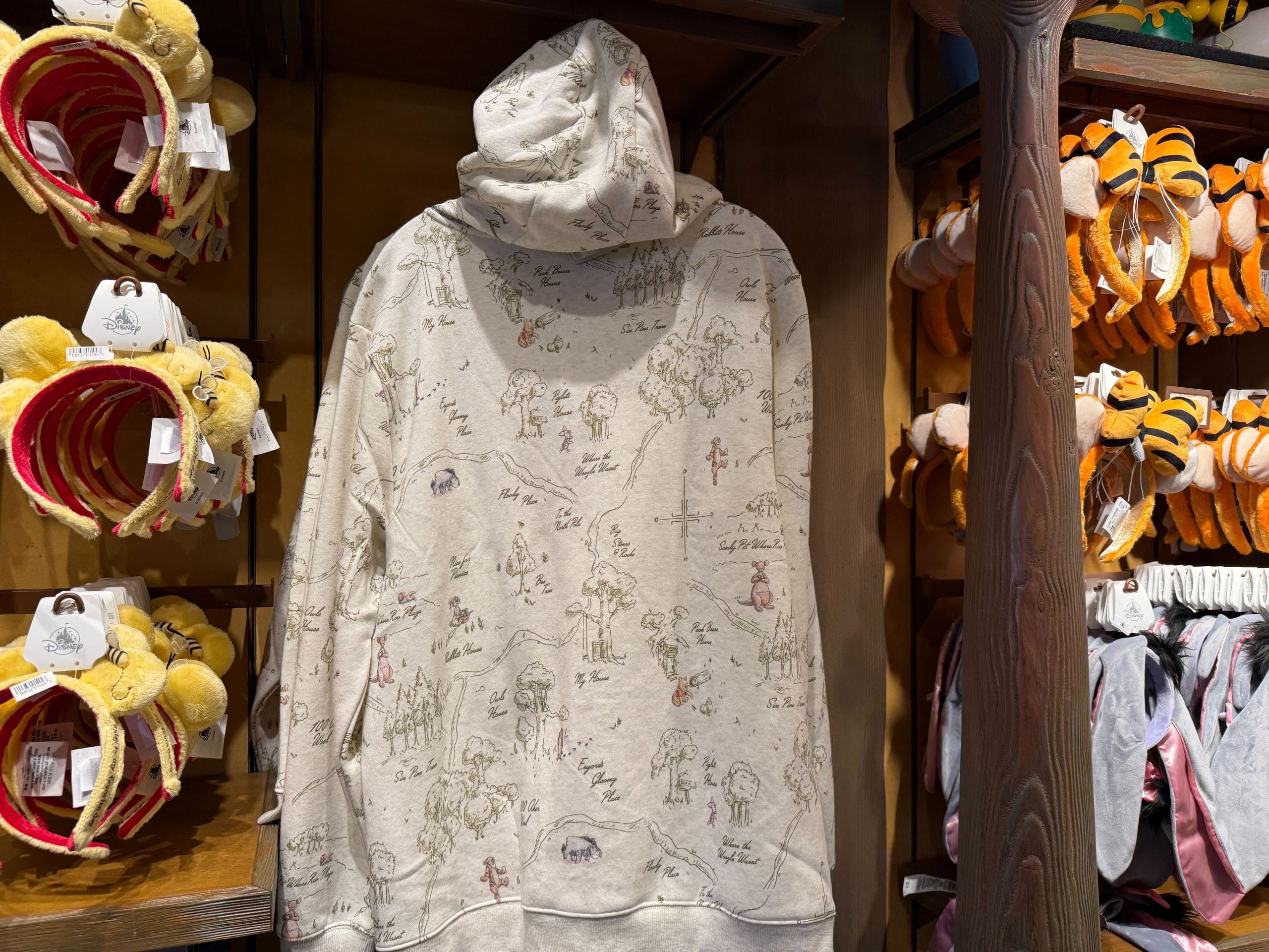The hoodie comes with front pockets and drawstrings to cinch the hood. A close-up view of the hoodie shows Winnie the Pooh and friends in different areas of the Hundred Acre Wood.