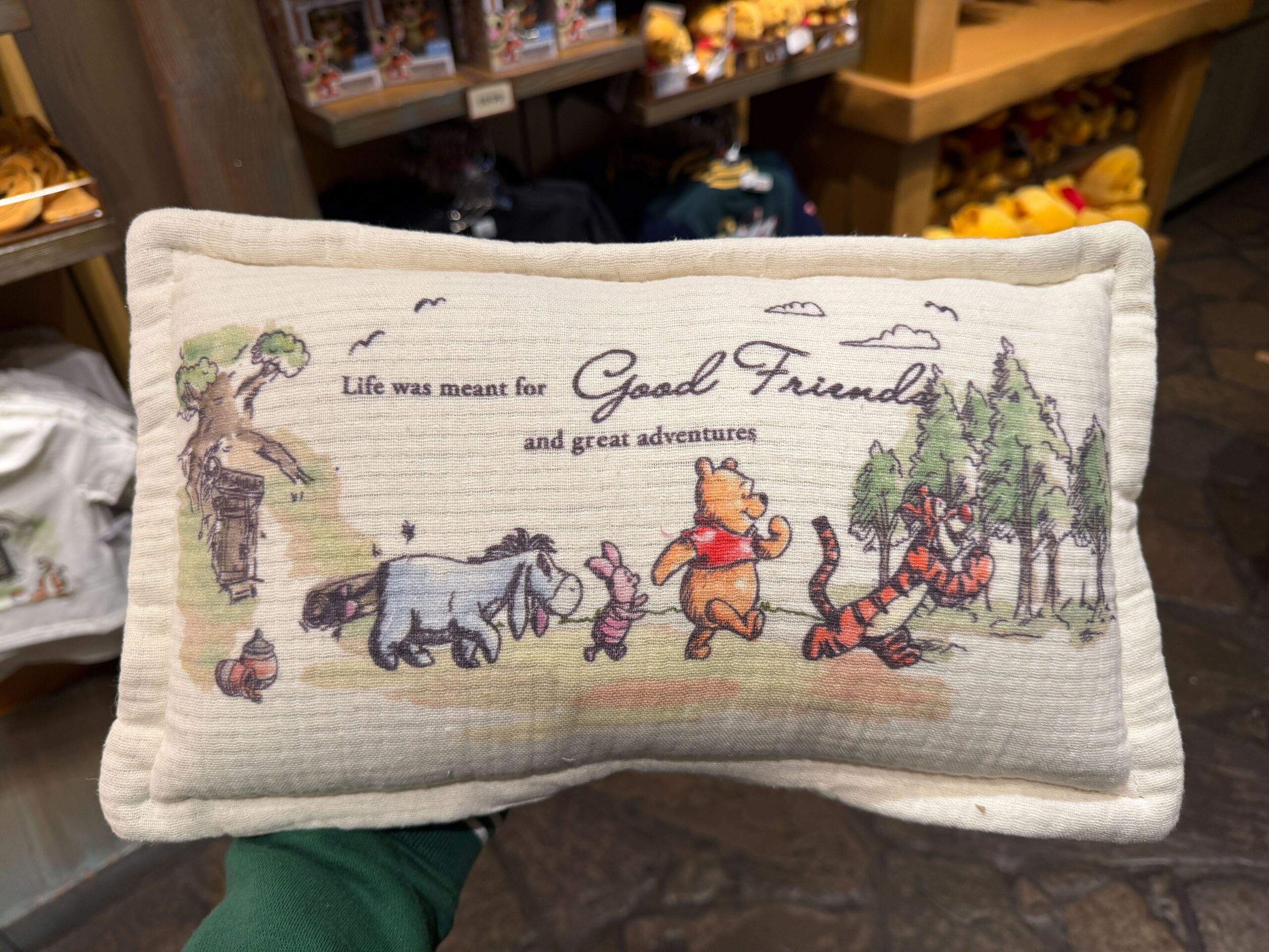 This rectangular pillow features Eeyore, Piglet, Winnie the Pooh, and Tigger walking in a line in front of the entrance to Winnie the Pooh’s house. The text “Life was meant for Good Friends and great adventures” is above them. The back of the pillow has an all-over map pattern of the Hundred Acre Wood.