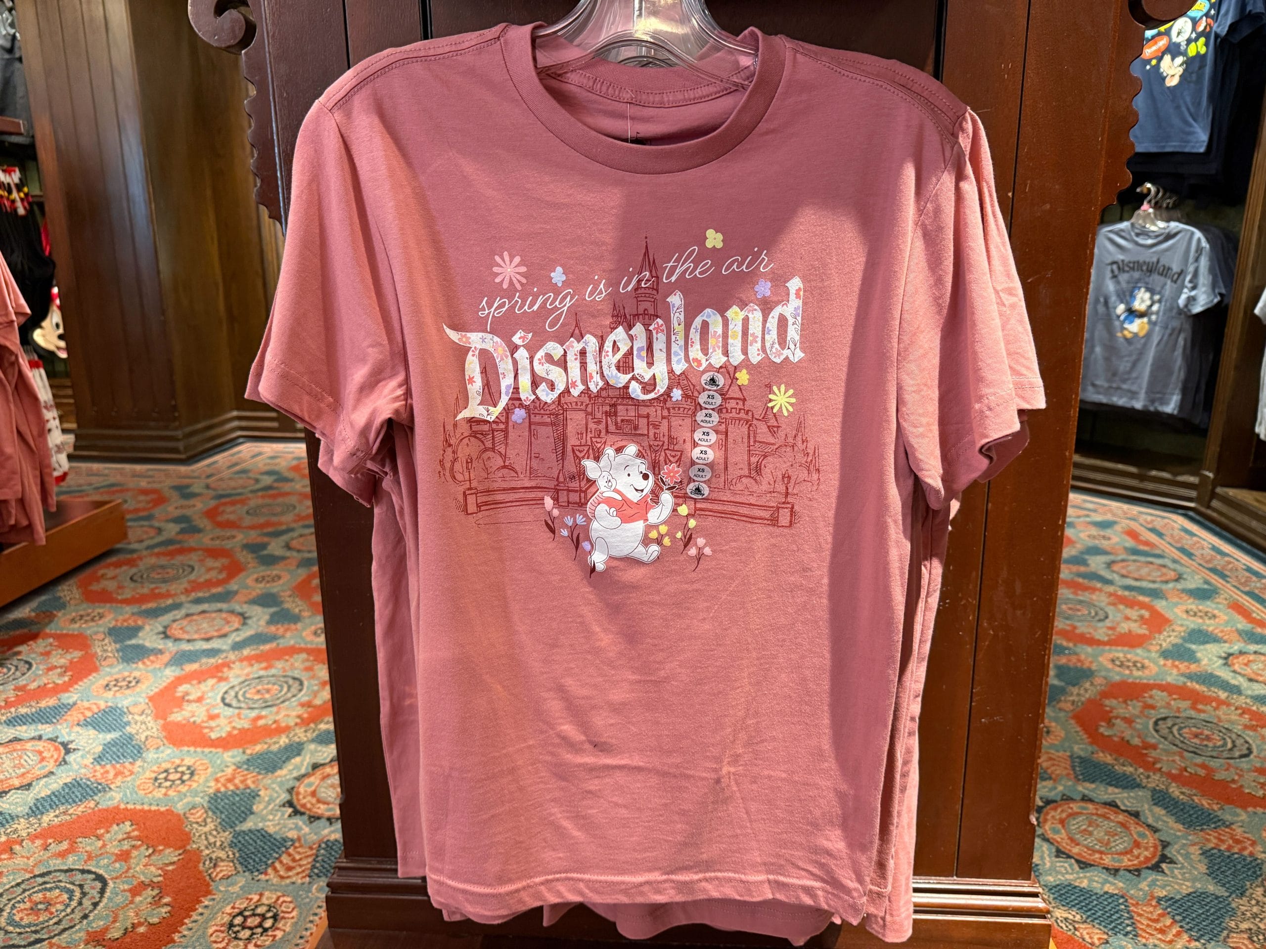 This pink tee features Winnie the Pooh and Piglet with flowers in front of Sleeping Beauty Castle. “Spring is in the air” is at the top of the art. The Disneyland wordmark is filled with floral patterns.